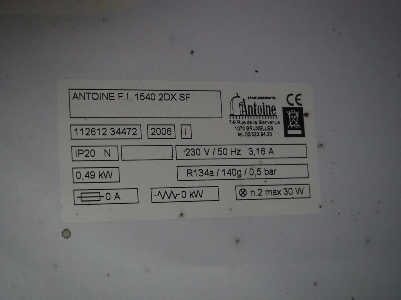 Antoine refrigerator, type: 1540 2DX SF, number: 112662 273358, yar of construction: 2017, 230 V, 50 Hz, 3.16 A, 0.49 kW, refrigerant: R134a, 140 gram, floor dimensions: 490 mm x 390 mm, total dimensions: 1550 mm x 560 mm x 850 mm.