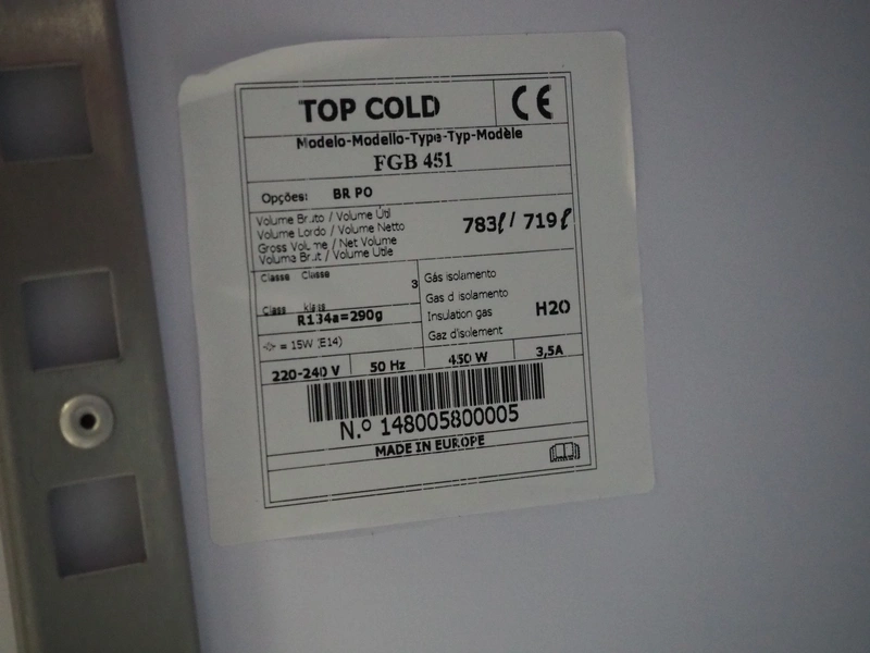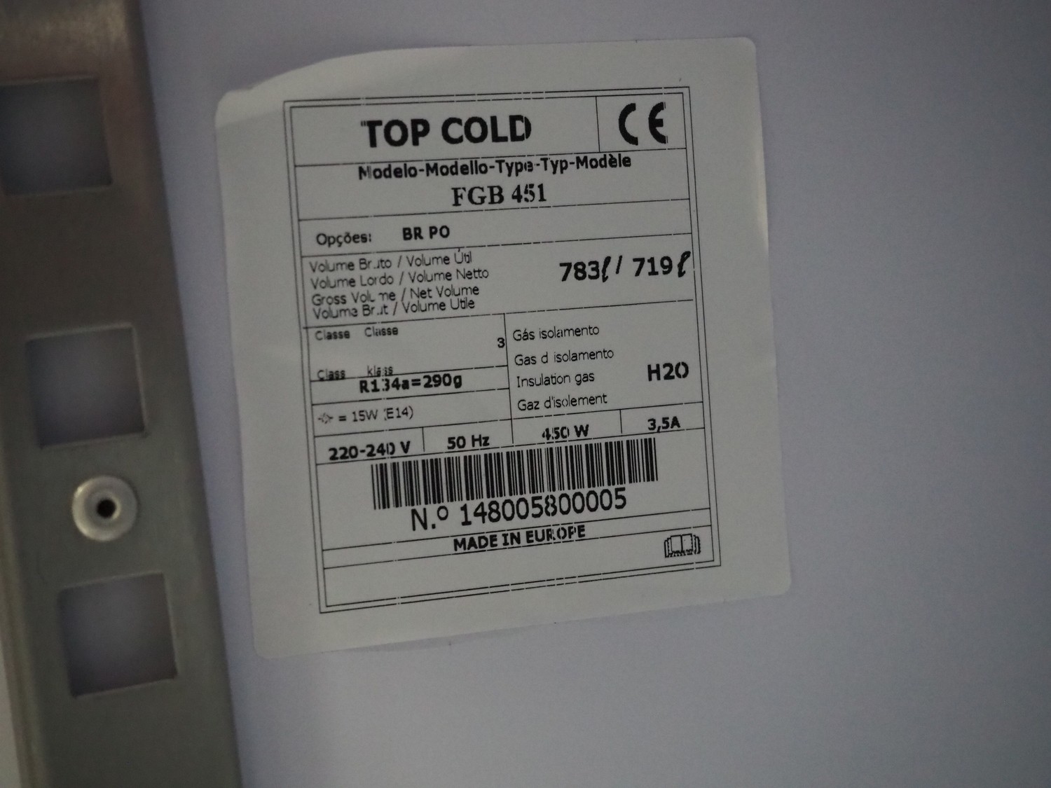 Top Cold refrigerated cabinet, model: FGB 451, number: 148005800005, 220-240 V, 50 Hz, refrigerant: R134a/290 g, dimensions: 2780 mm x 560 mm x 850 mm.