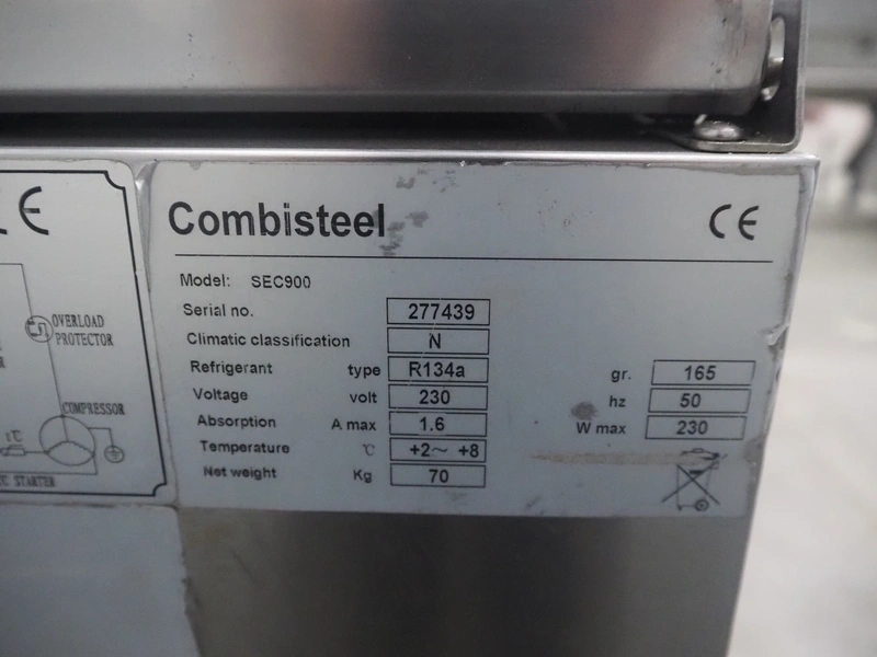 Combisteel refrigerator, model: SEC900, serial number: 277439, 230 V, 50 Hz, 1.6 A, 230 Watt, refrigerant: R134a, 165 gram, dimensions: 900 mm x 700 mm x 870 mm.