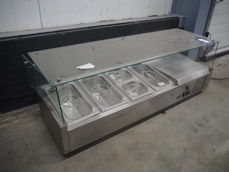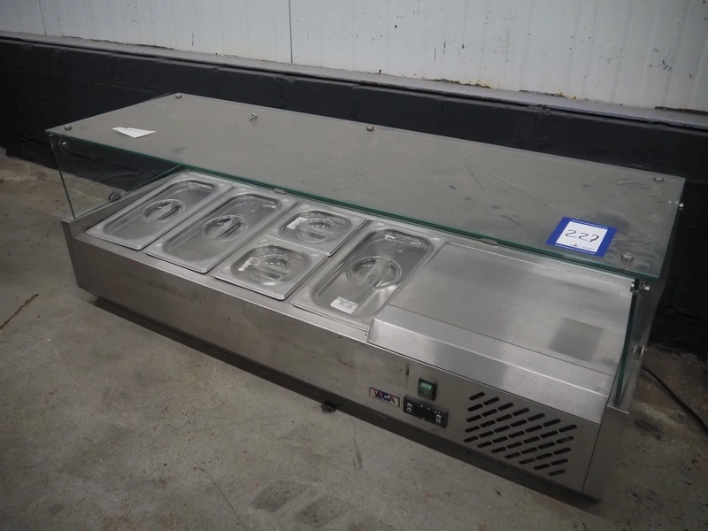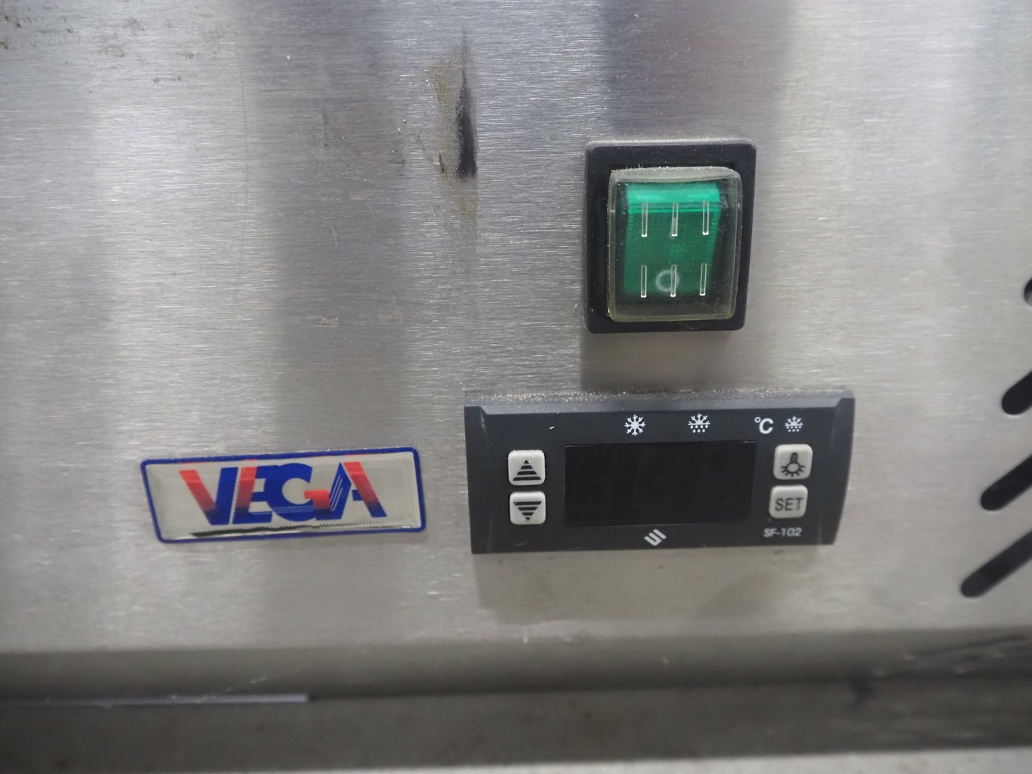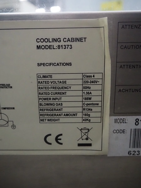 Vega refrigerated showcase, model: 81373, 220/240 V, 50 Hz, 1.35 A, 185 W, refrigerant: R134a, 160 g, weight: 42 kg, dimensions: 1200 mm x 400 mm x 470 mm.