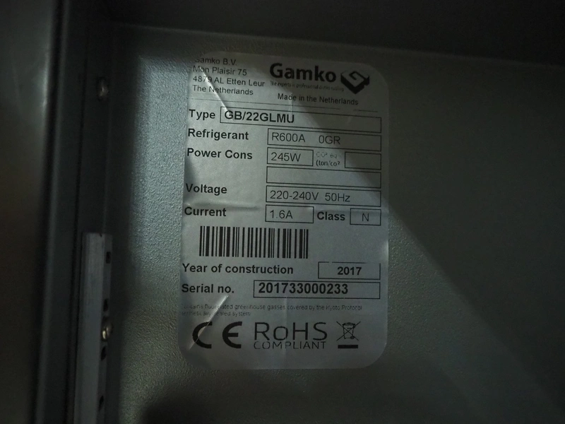 Gamko double doors refrigerator, type: GB/22GLMU, serial number: 201733000233, year of construction: 2017, 220-240 V, 50 Hz, 1.6 A, 245 Watt, refrigerant: R600A, dimensions: 1250 mm x 600 mm x 820 mm.