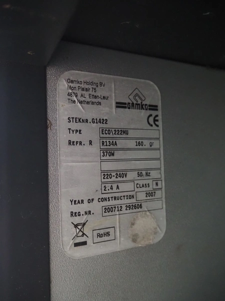 Gamko refrigerator, type: ECO/222MU, year of construction: 2007, 220/240 V, 50 Hz, 370 W, refrigerant: R134A, 160 gram, floor dimensions: 370 mm x 480 mm, total dimensions: 800 mm x 2000 mm x 1040 mm.