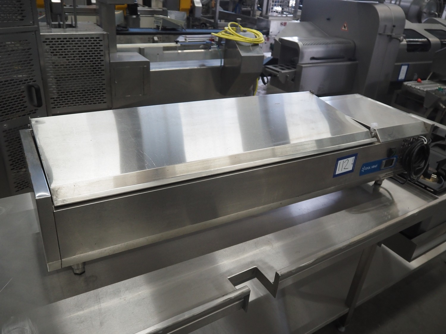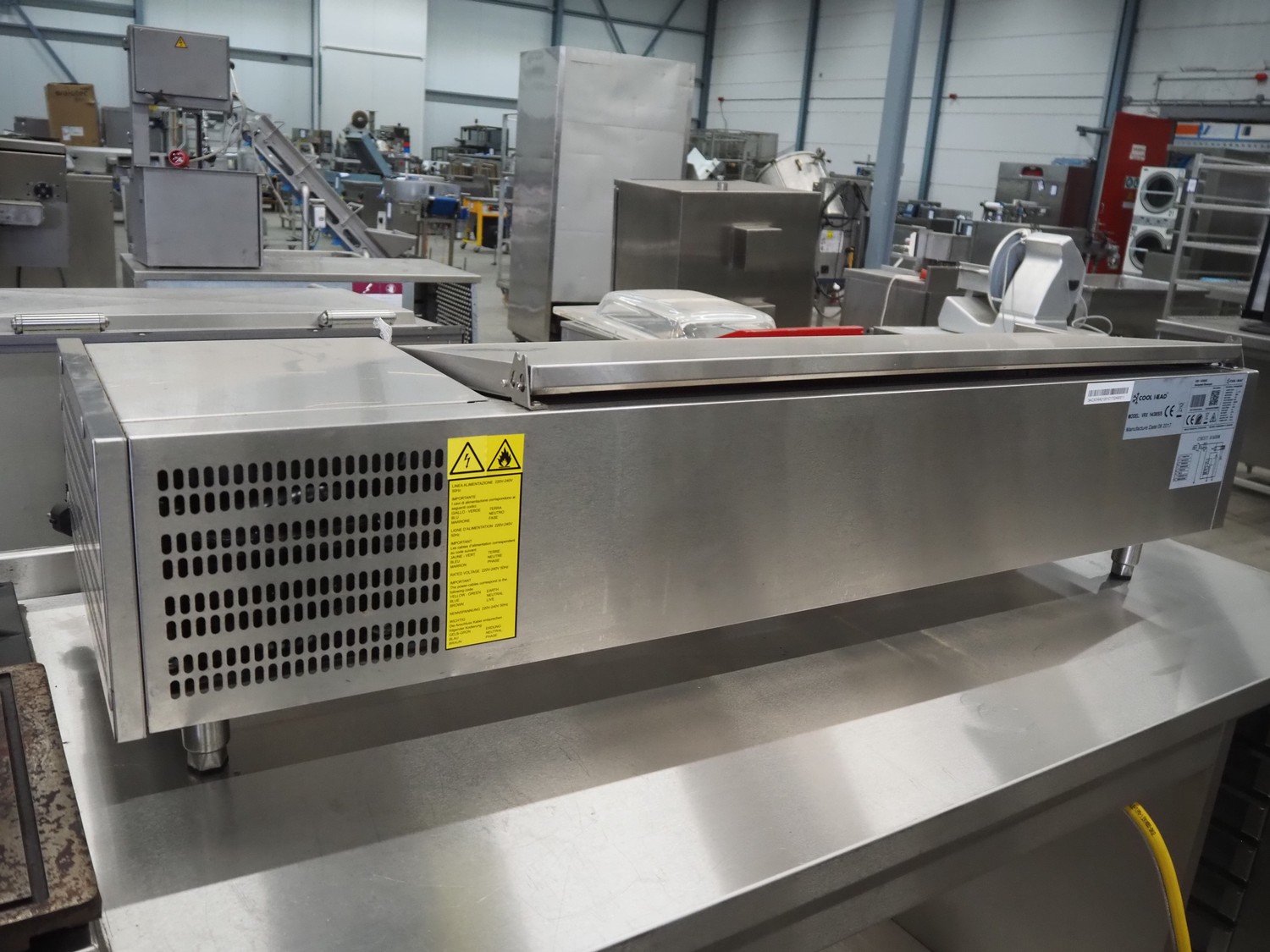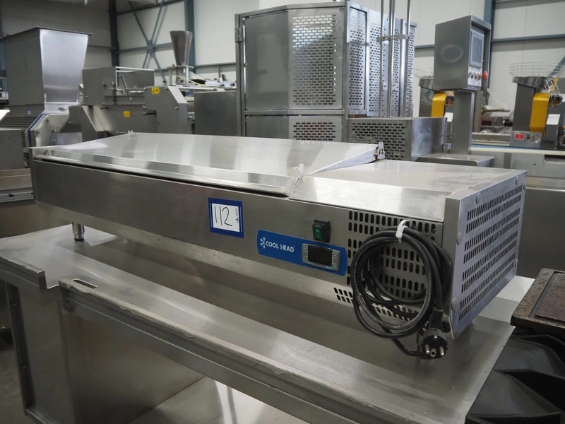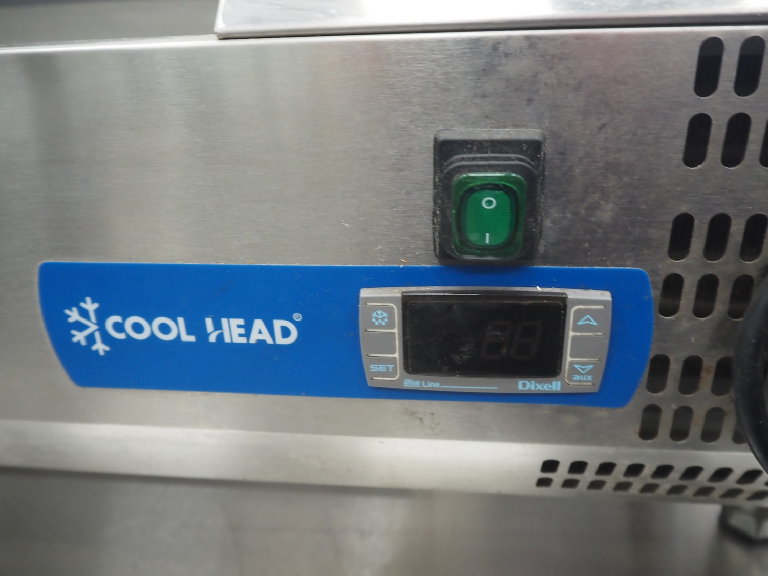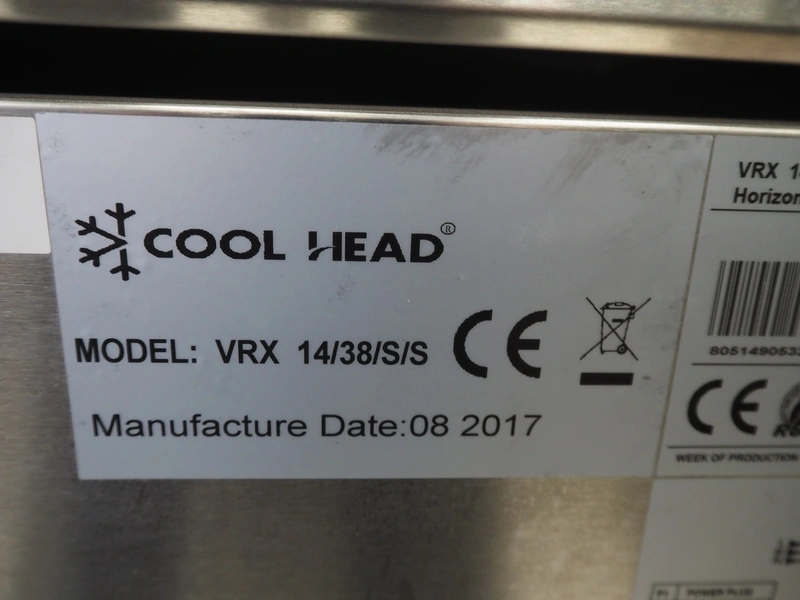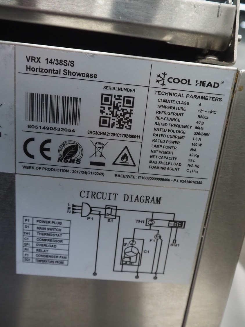 Cool Head refrigerated showcase, model: VRX 14/38/S/S, year of construction: 08/2017, 220/240 V, 50 Hz, 1.3 A, 160 W, refrigerant: R600a, 40 g, weight: 42 kg, dimensions: 1450 mm x 395 mm x 360 mm.