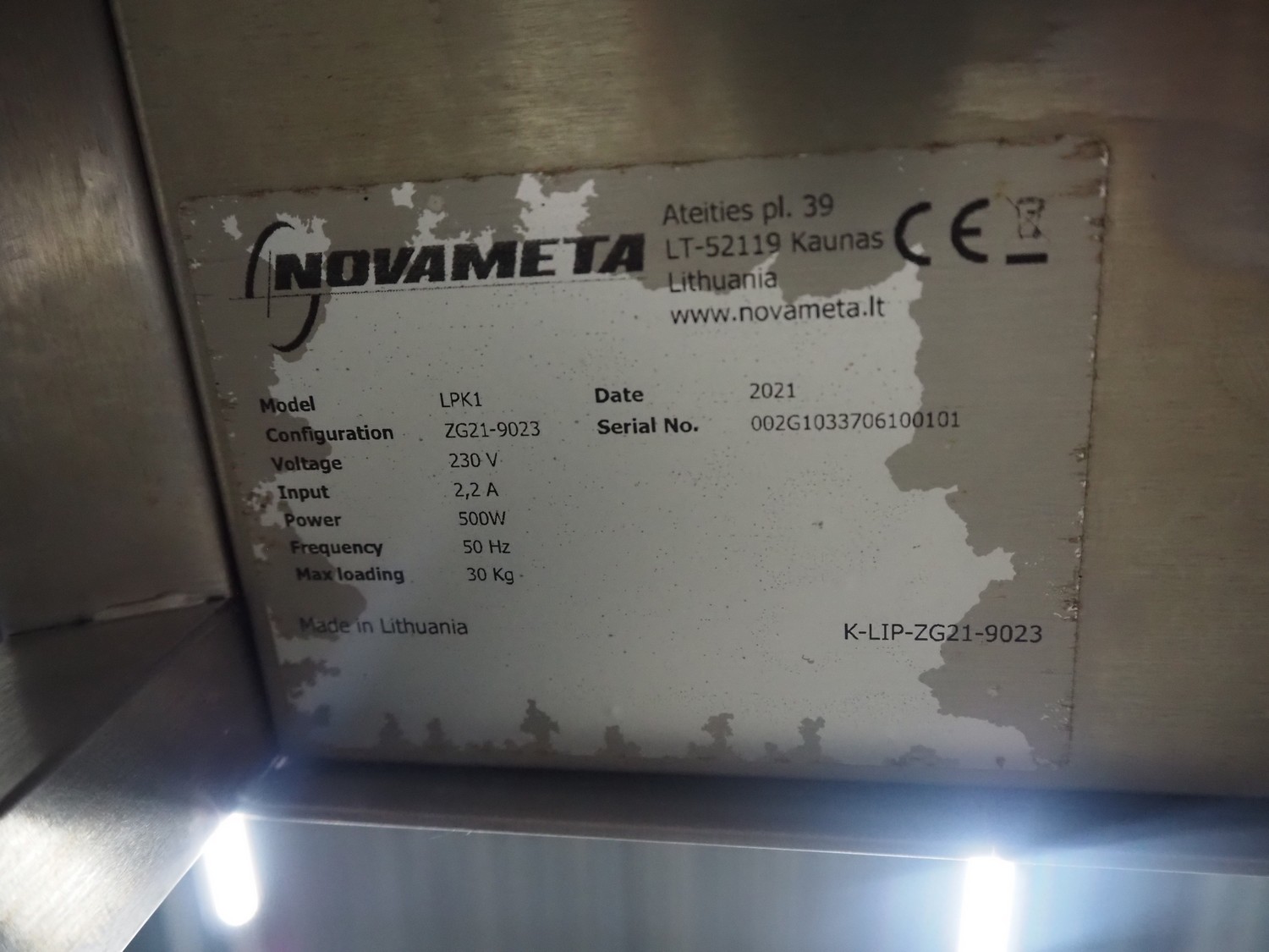 Novameta heated cabinet, model: LPK1, serial number: 002G1033706100101, 230 V, 50 Hz, 2.2 A, 500 Watt, dimensions: 600 mm x 700 mm x 1500 mm.