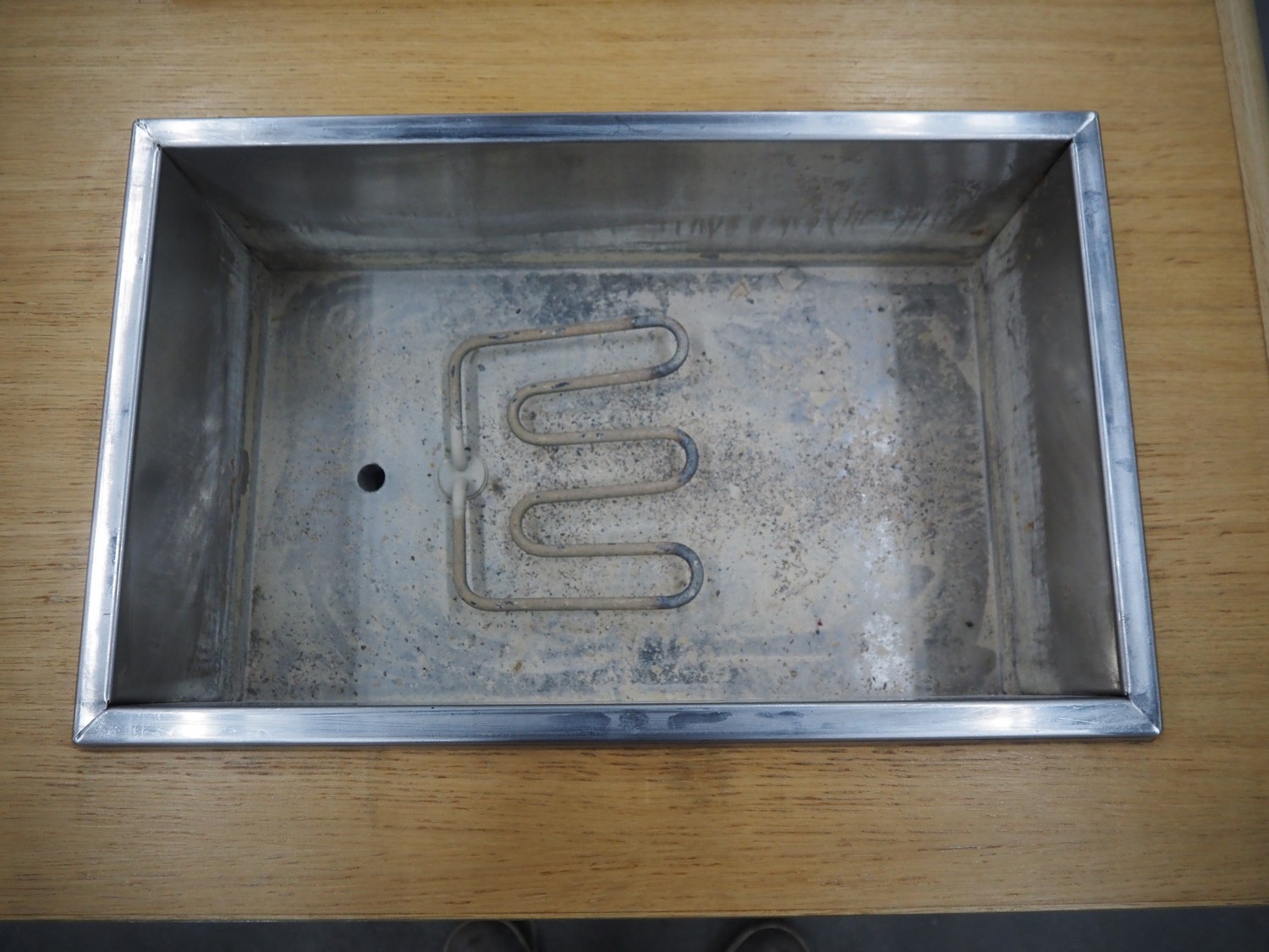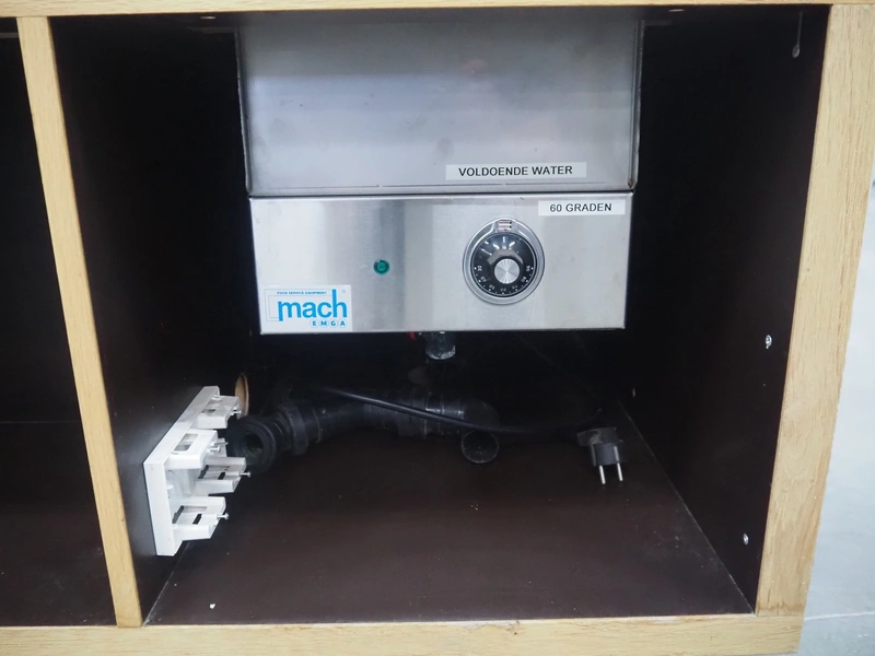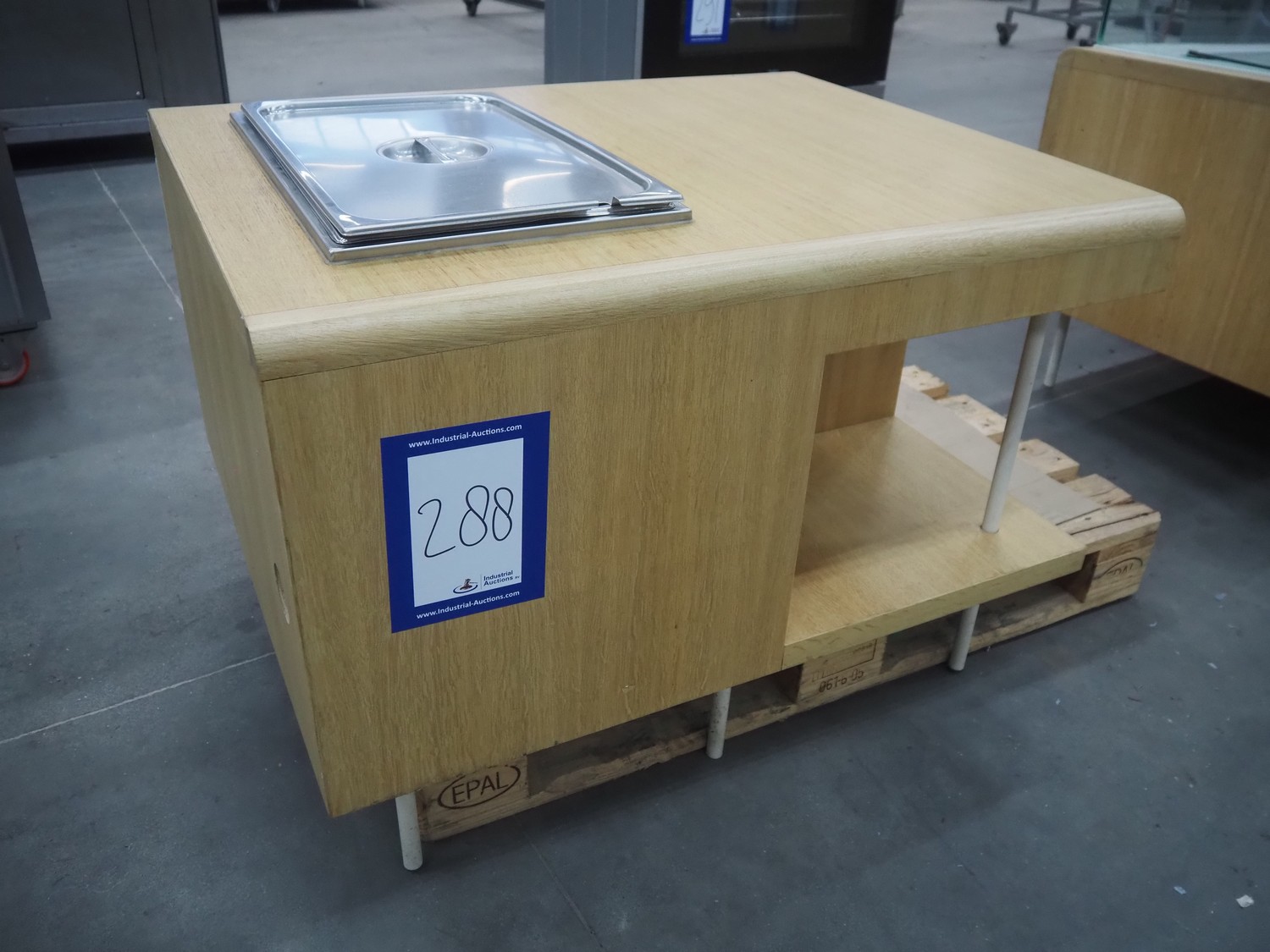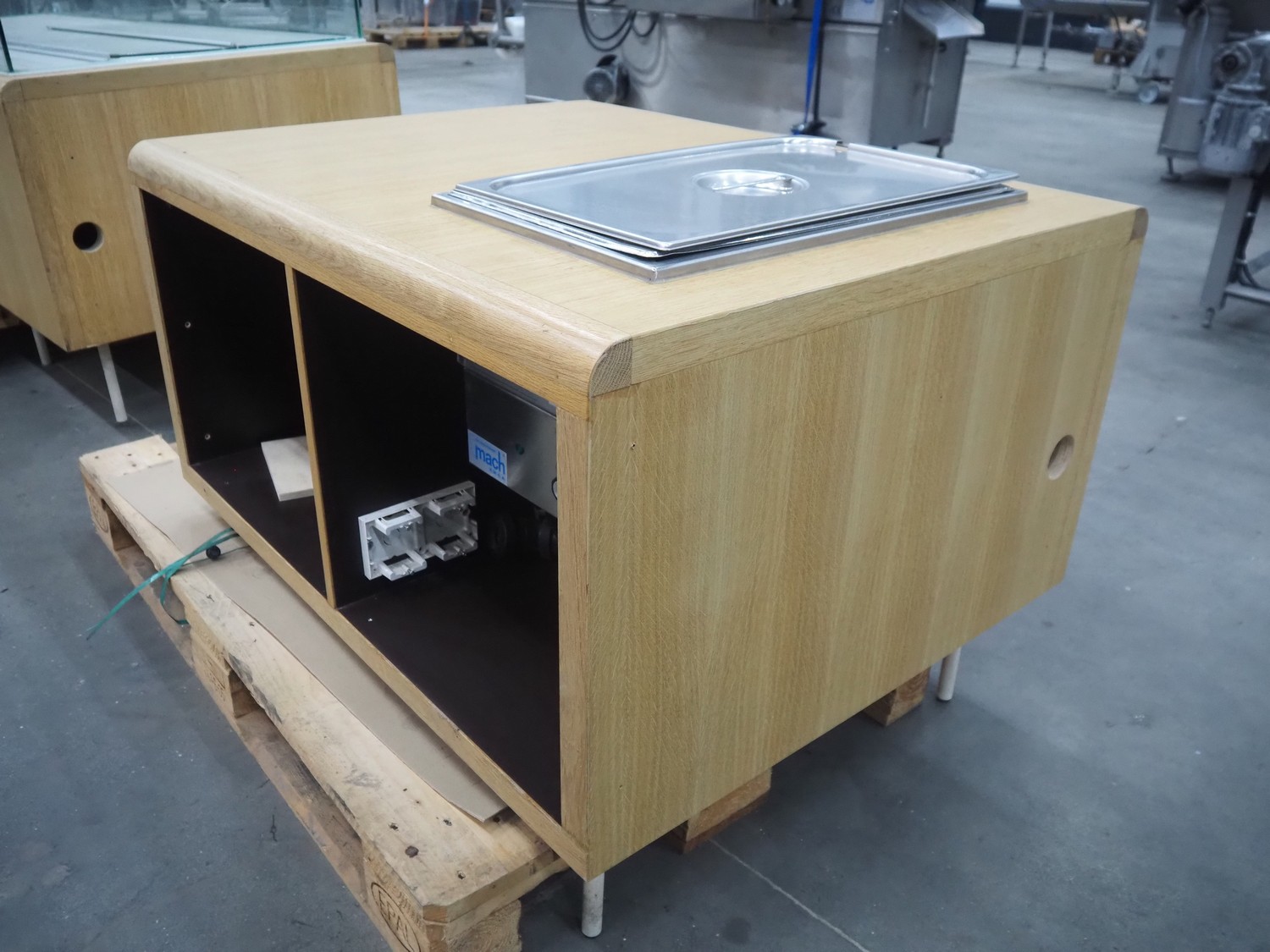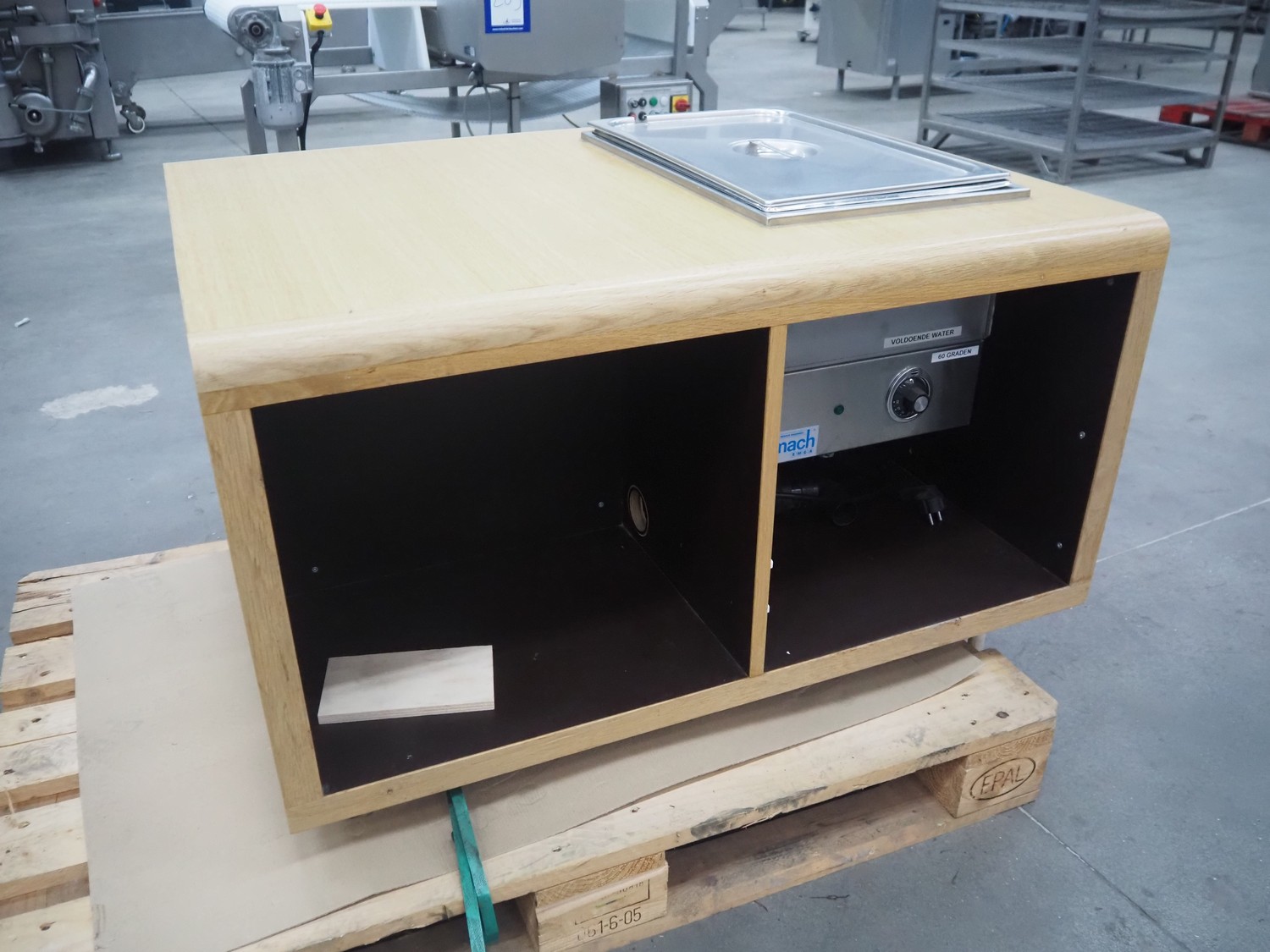 Wooden counter with s/s heating plate, dimensions: 1000 mm x 800 mm x 700 mm.