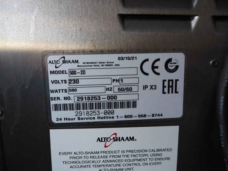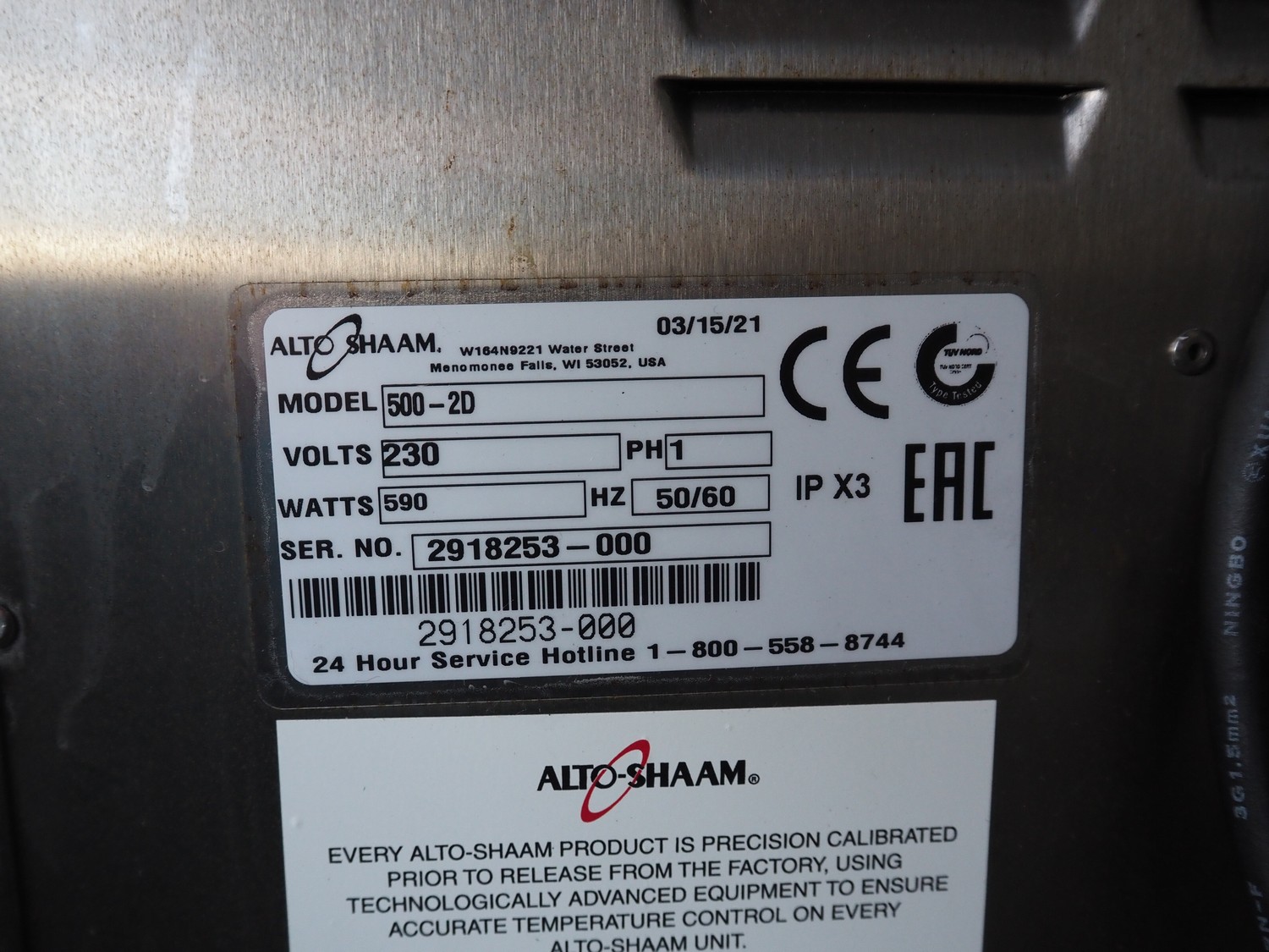 Alto-Shaam heated cabinet, model: 500-2D, serial number: 2918253-000, year of construction: 2021, 230 V, 1 Ph, 50/60 Hz, 590 Watt, dimensions: 620 mm x 600 mm x 480 mm.