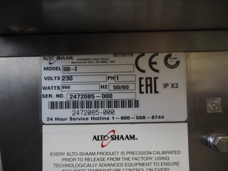 Alto-Shaam mobile heated cabinet, model: 500-S, serial number: 2472085-000, 230 V, 1 Ph, 50/60 Hz, 950 W, 11 floors, dimensions: 450 mm x 600 mm x 800 mm.