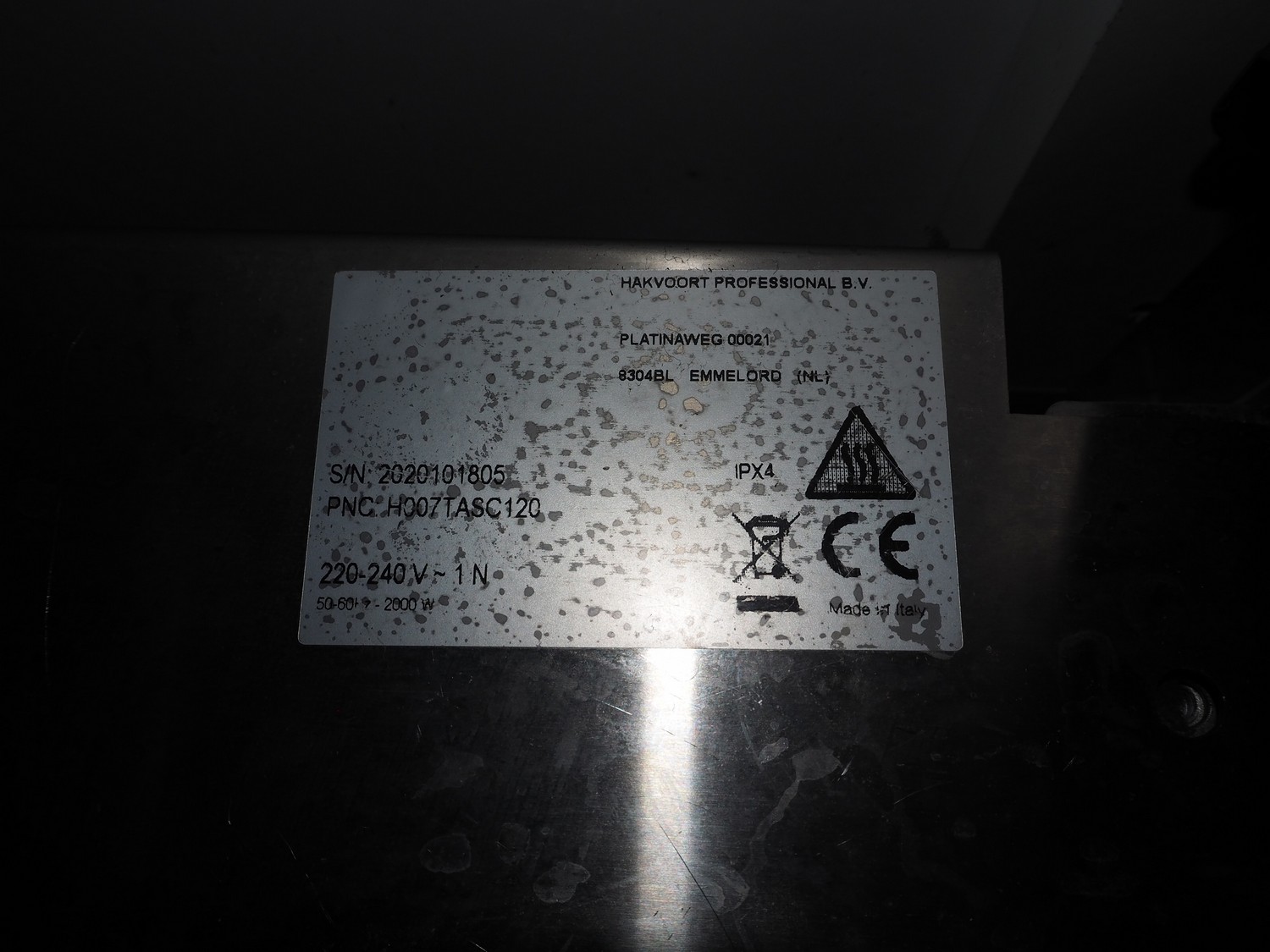 Profinox heated cabinet, serial number: 2020101805, 220-240 V, 1 Ph, 50/60 Hz, dimensions: 1200 mm x 400 mm x 250 mm.