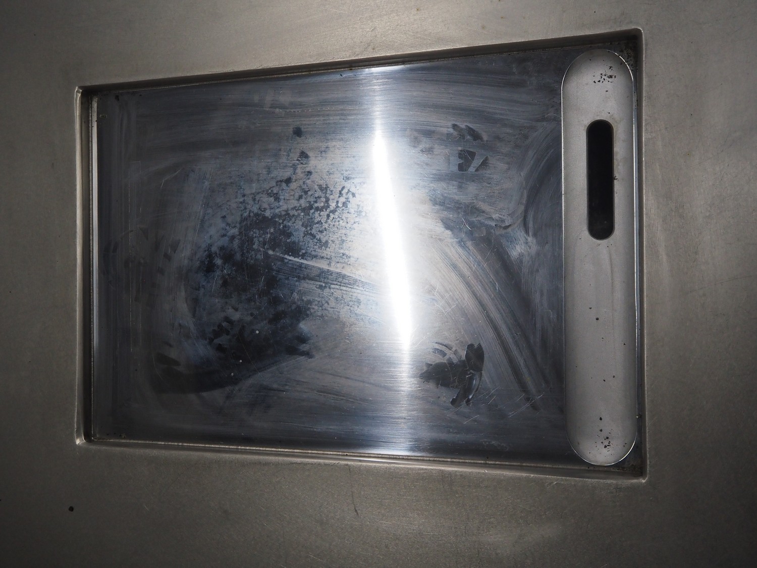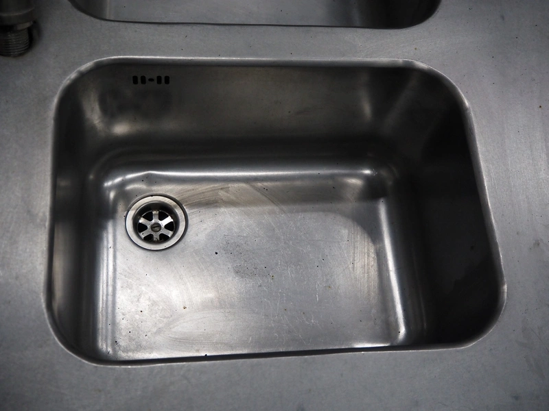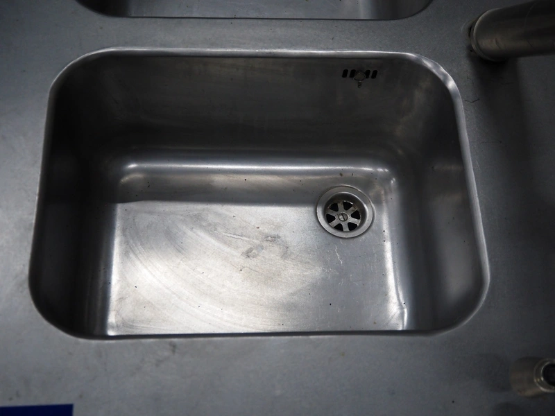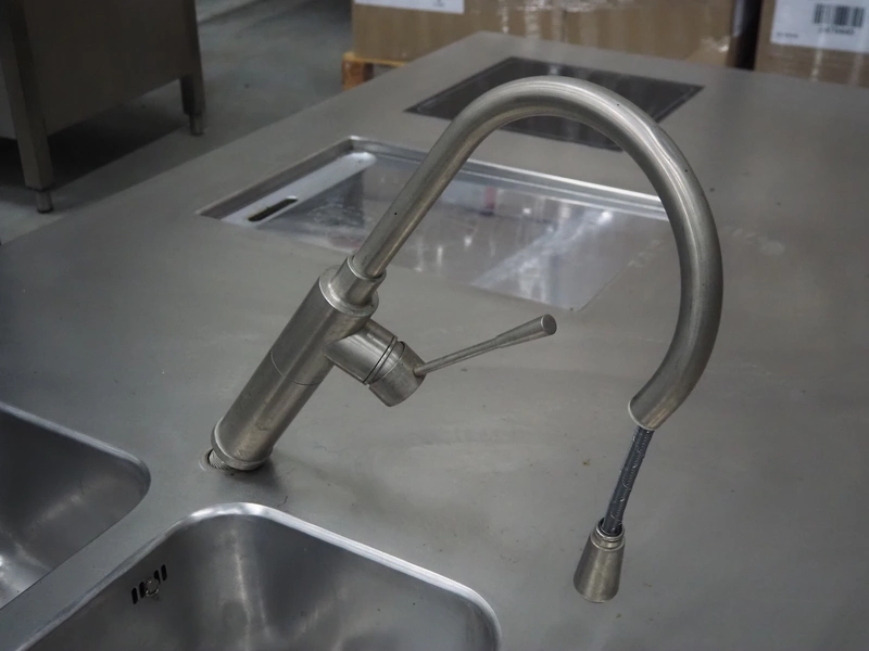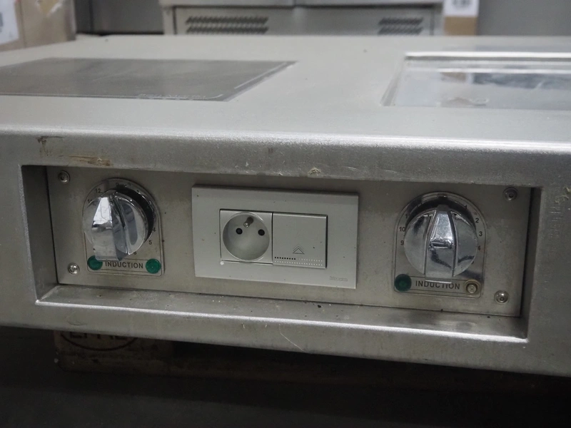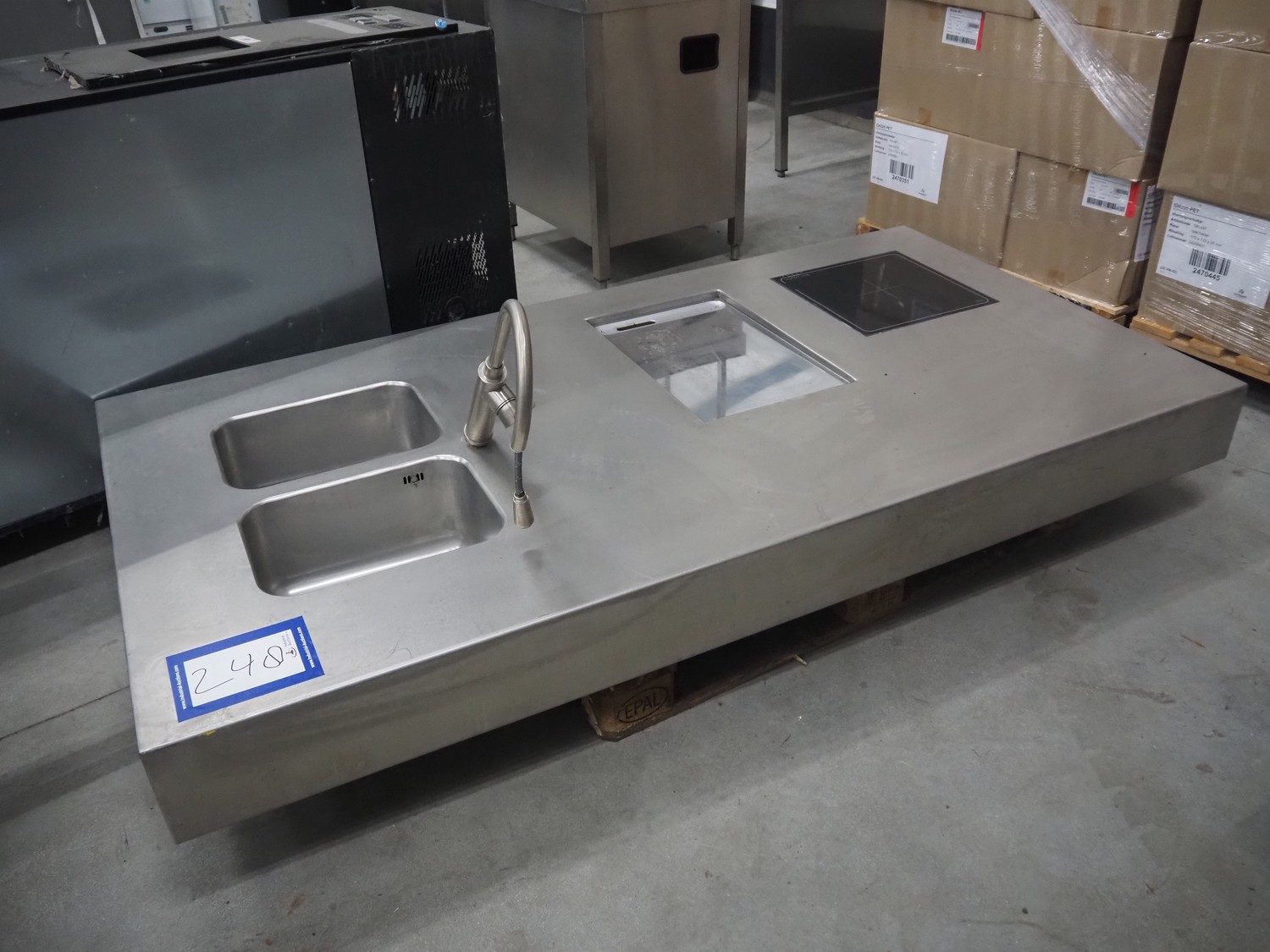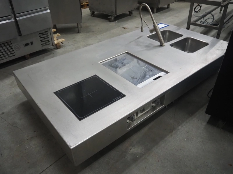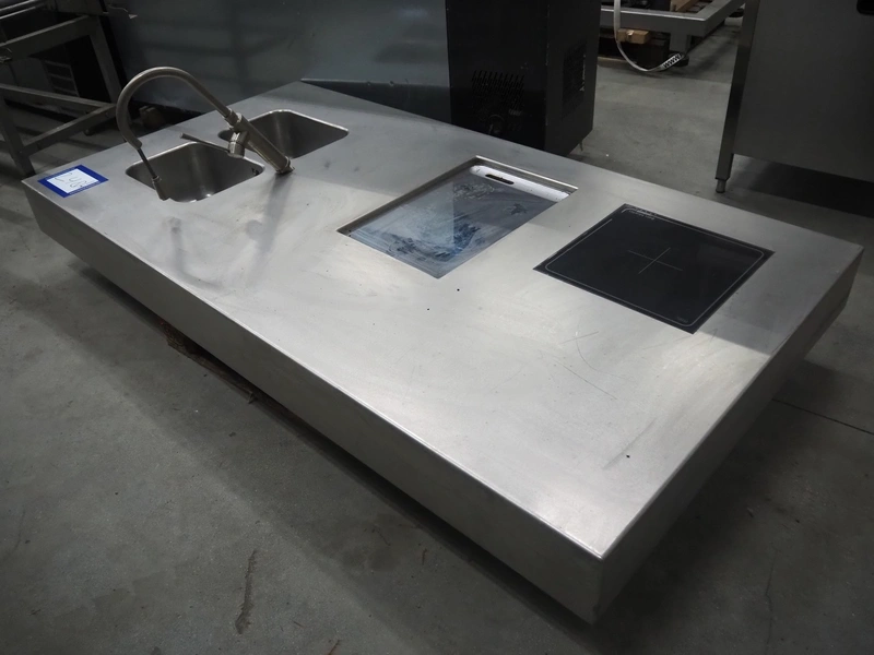 S/s kitchen counter with 2 sinks, faucet, induction plate and grill, dimensions: 2100 mm x 1100 mm x 180 mm.