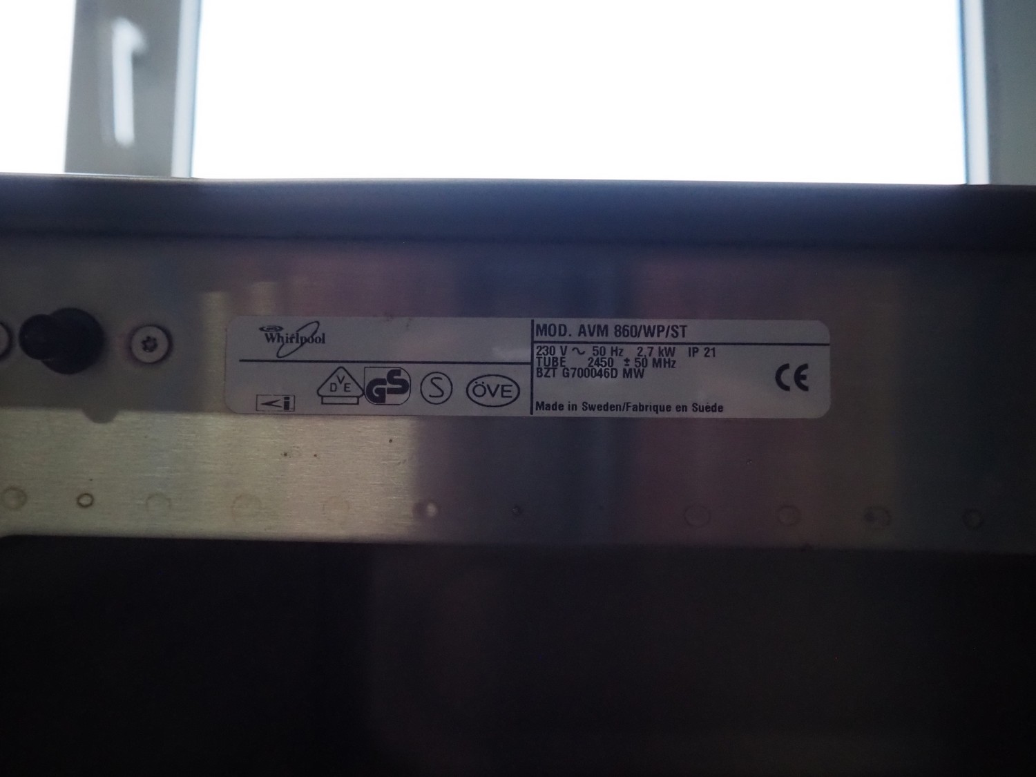 Whirlpool microwave, model: AVM 860/WP/ST, 230 V, 50 Hz, 2.7 kW, dimensions: 660 mm x 600 mm x 470 mm.
