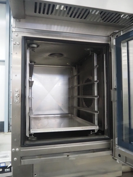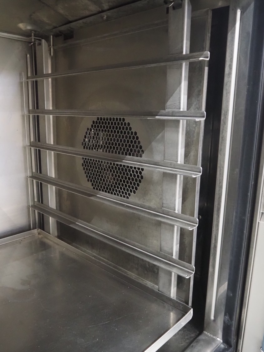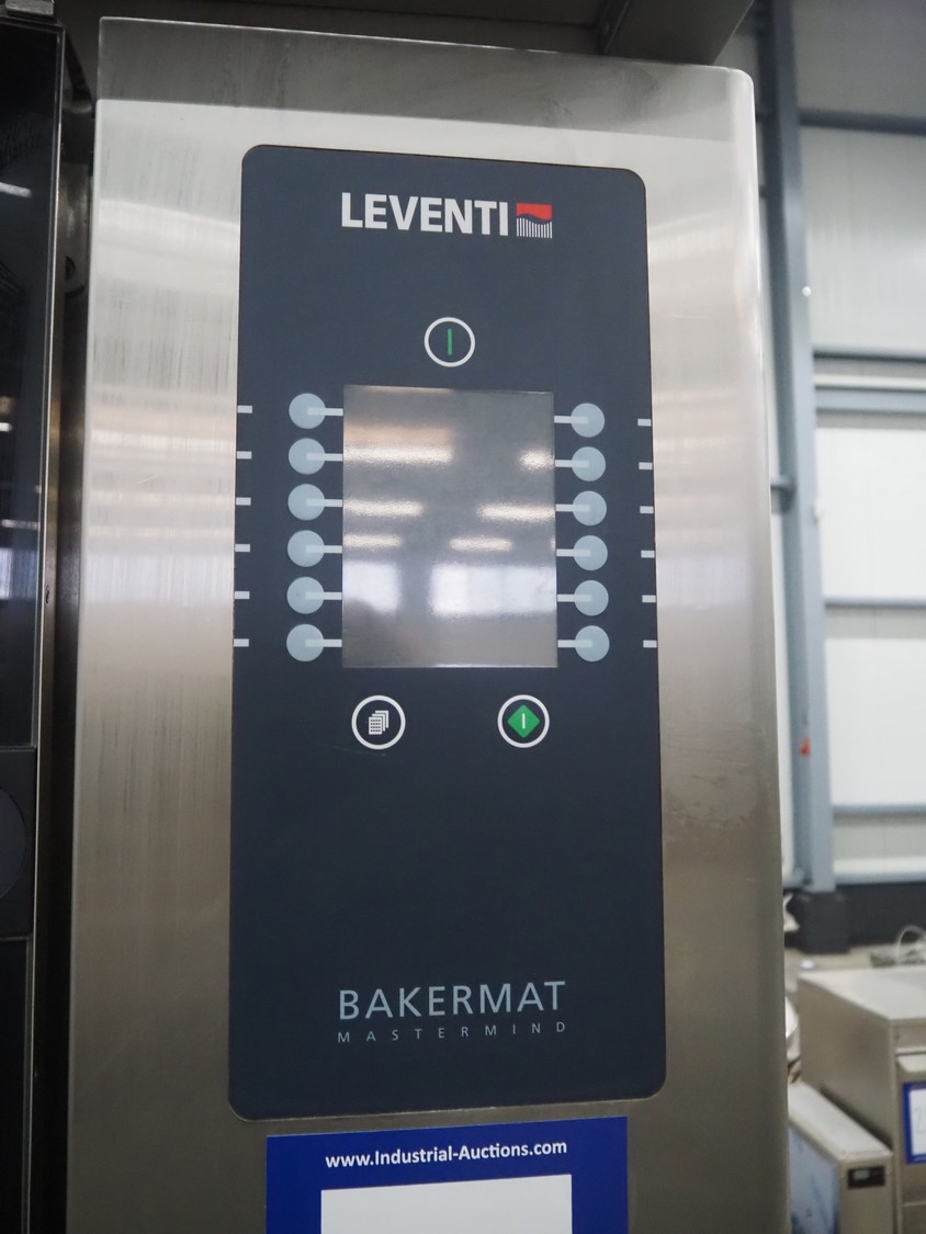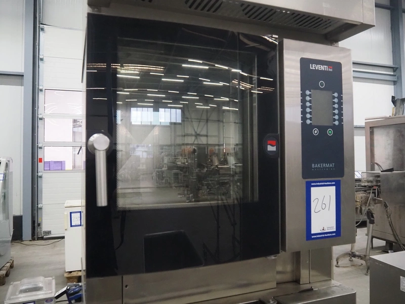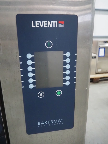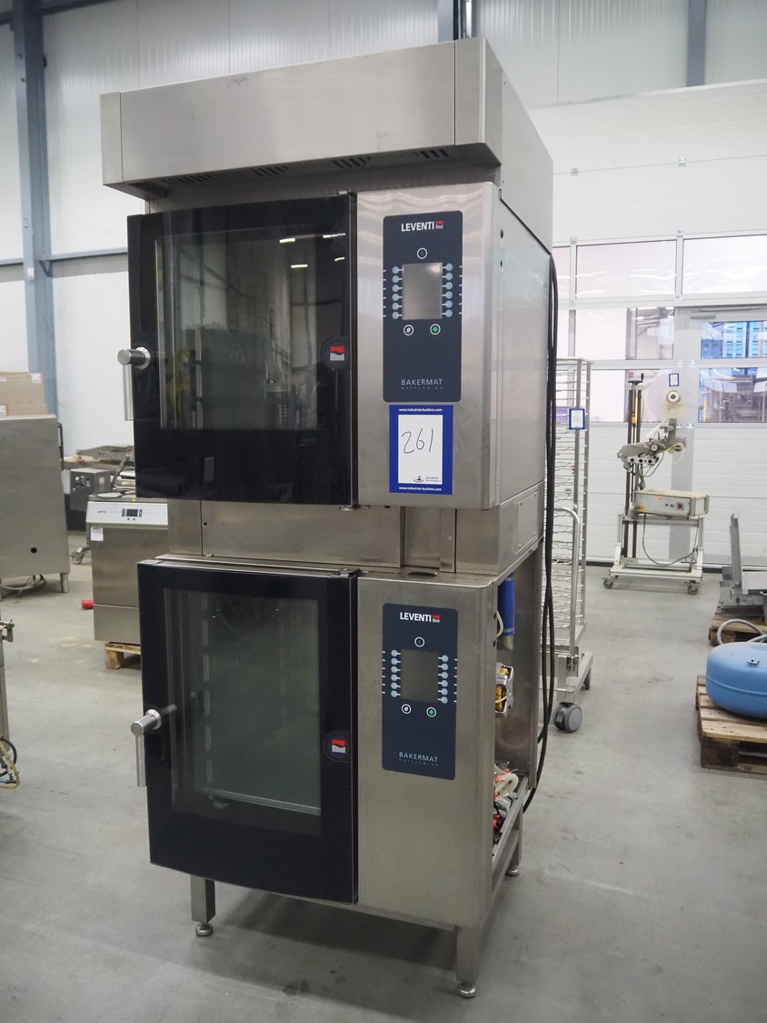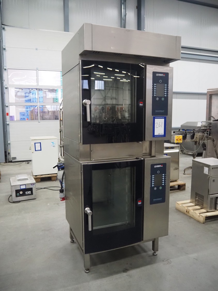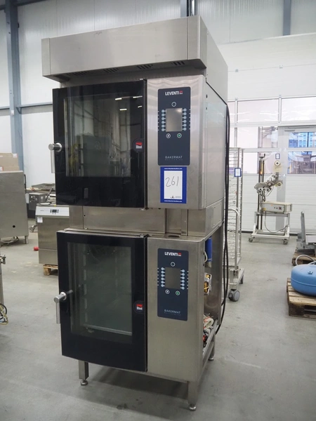 Leventi double stacked combi steamer with hood, 5 and 6 floors, dimensions each floor: 600 mm x 400 mm, total dimensions: 1050 mm x 900 mm x 2210 mm. Incomplete.