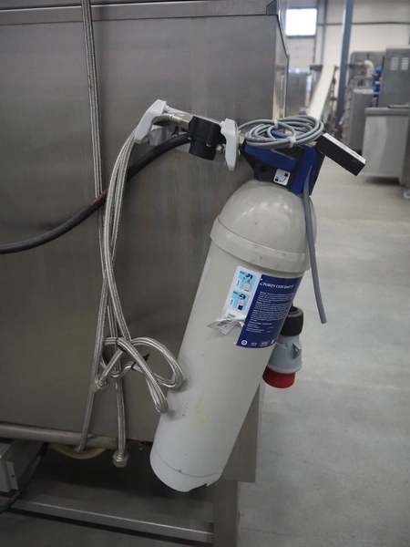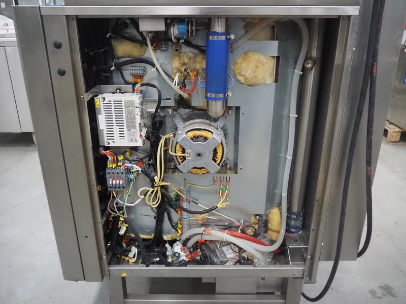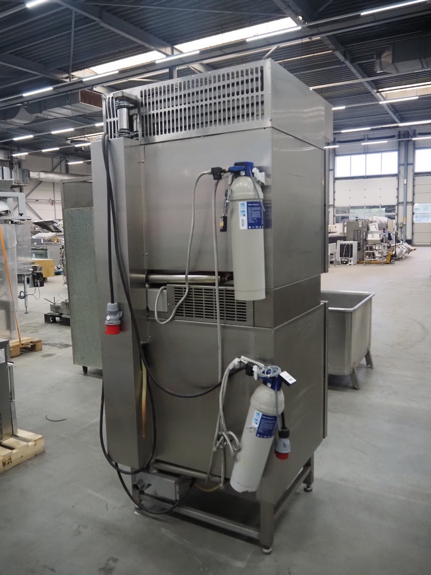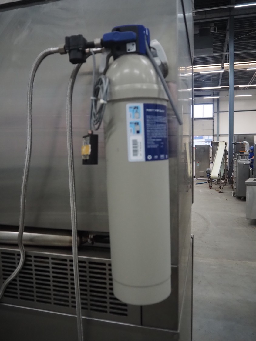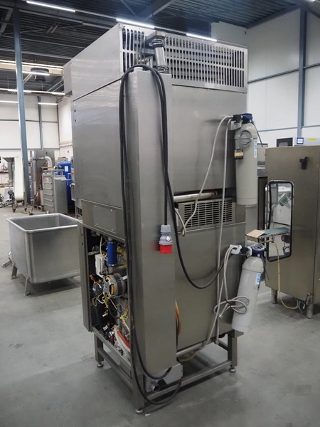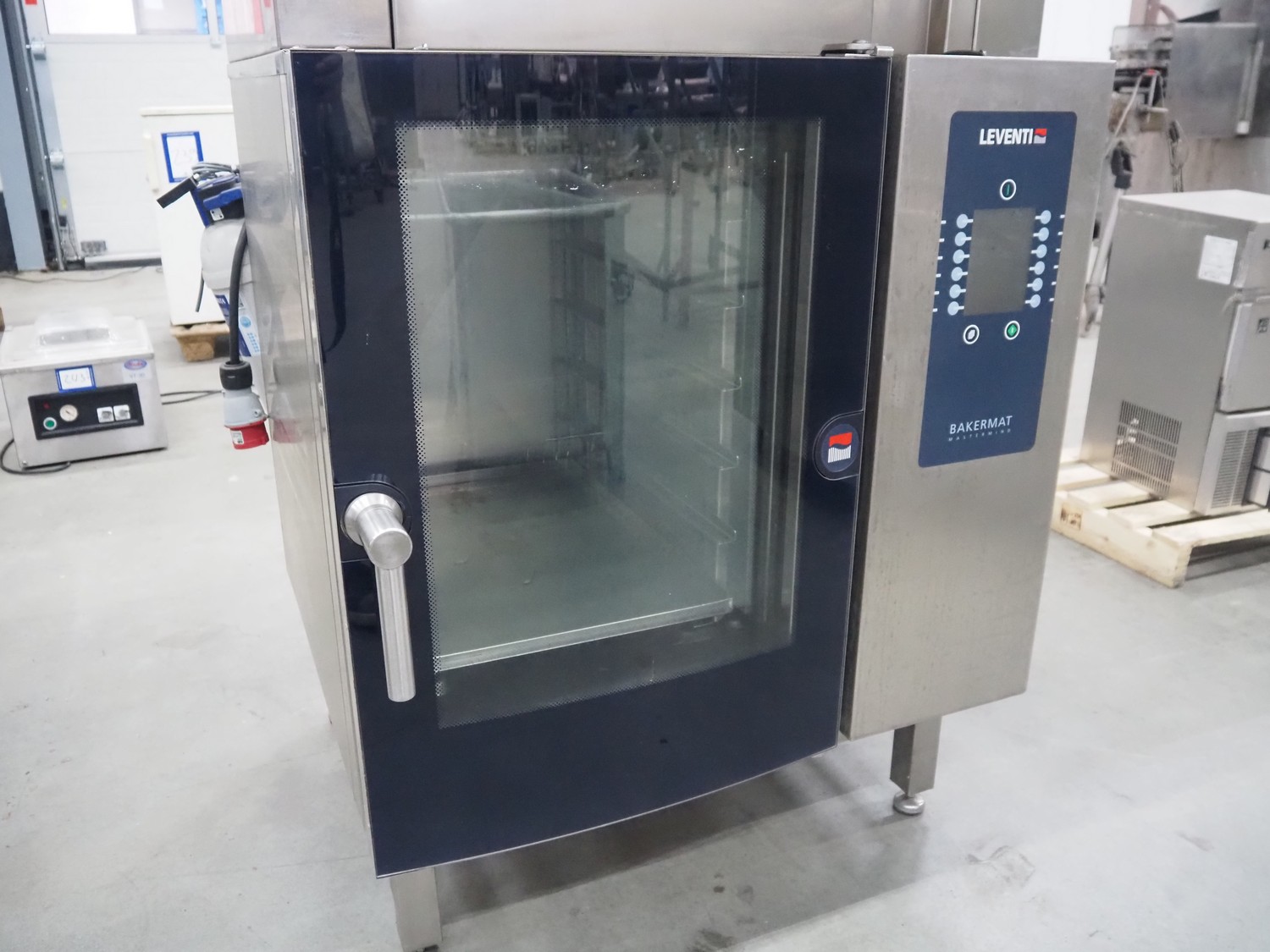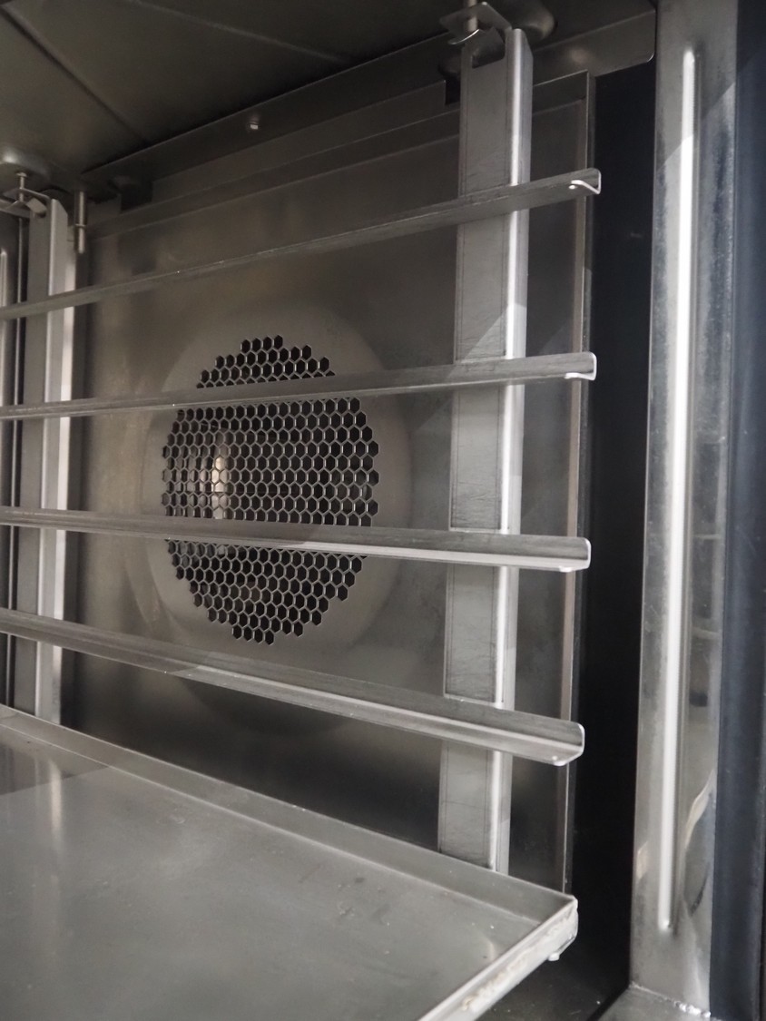 Leventi double stacked combi steamer with hood, 5 and 6 floors, dimensions each floor: 600 mm x 400 mm, total dimensions: 1050 mm x 900 mm x 2210 mm. Incomplete.