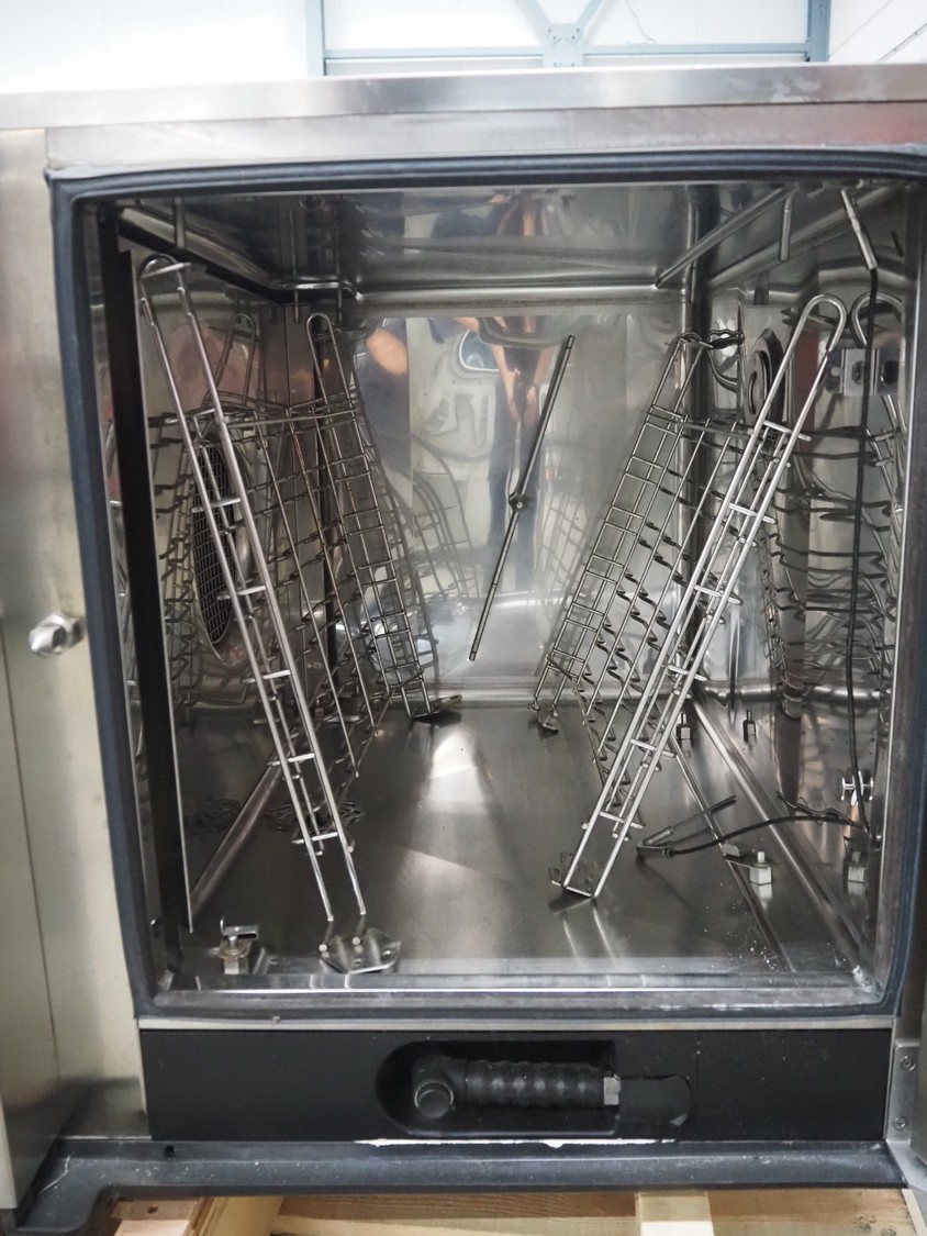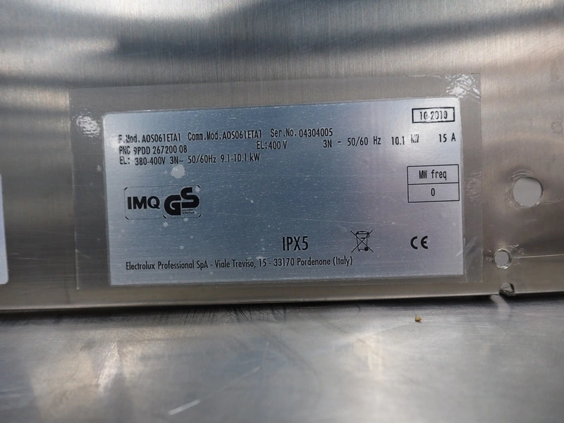 Electrolux combi steamer, type: Air-O-Steam, model: A0S061ETA1, serial number: 04304005, year of construction: 2010, 400 V, 3 Ph, 50/60 Hz, 15 A, 10.1 A, dimensions: 900 mm x 900 mm x 850 mm.