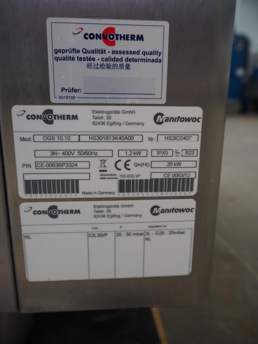 Convotherm combi steamer, model: OGS 10.10 HS301813K40A00, serial number: HS3ID2407, 400 V, 3 Ph, 50/60 Hz, 1.2 kW, 11 floors, floor dimensions: 490 mm x 330 mm, total dimensions: 970 mm x 940 mm x 1160 mm.