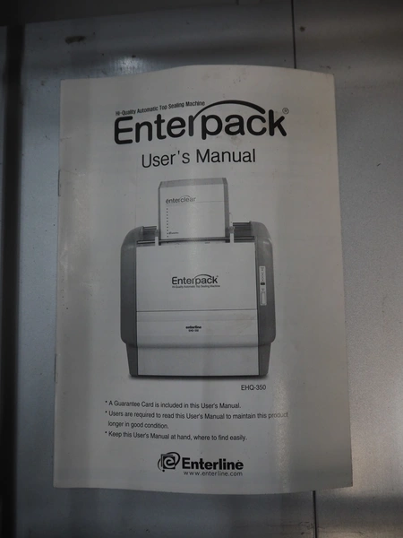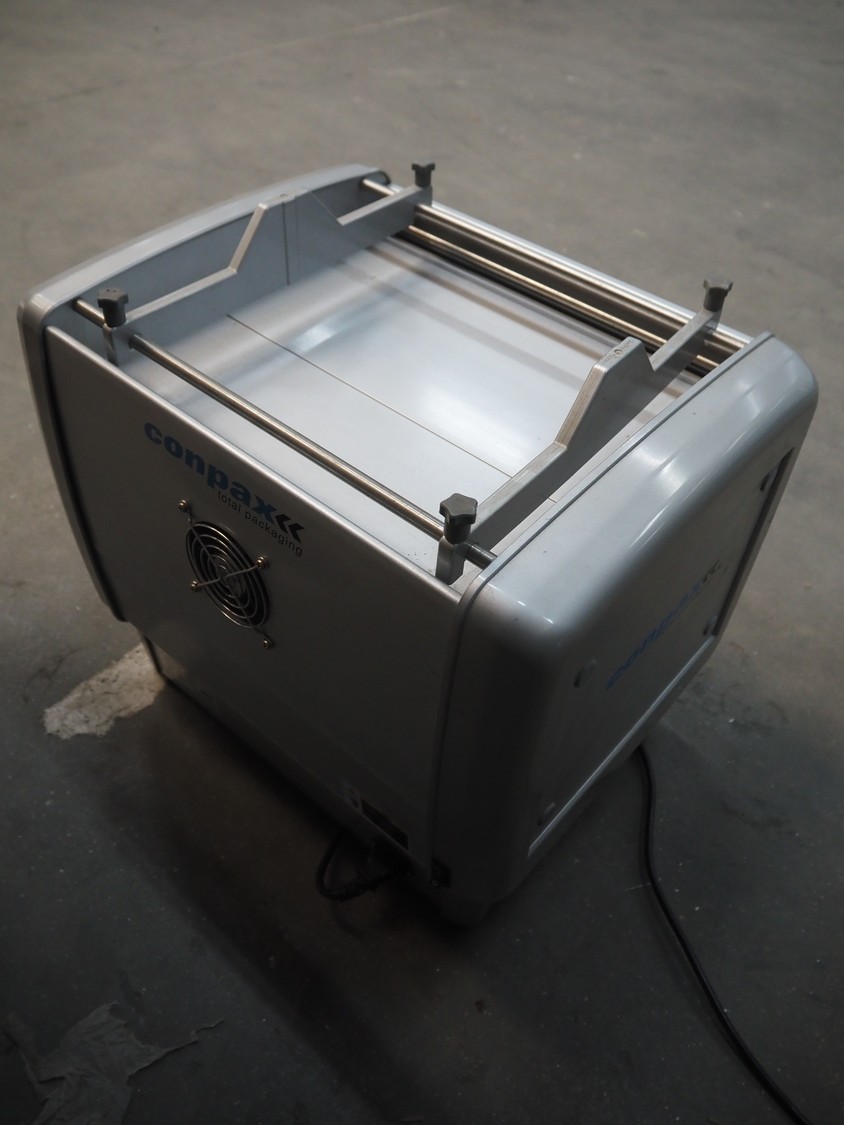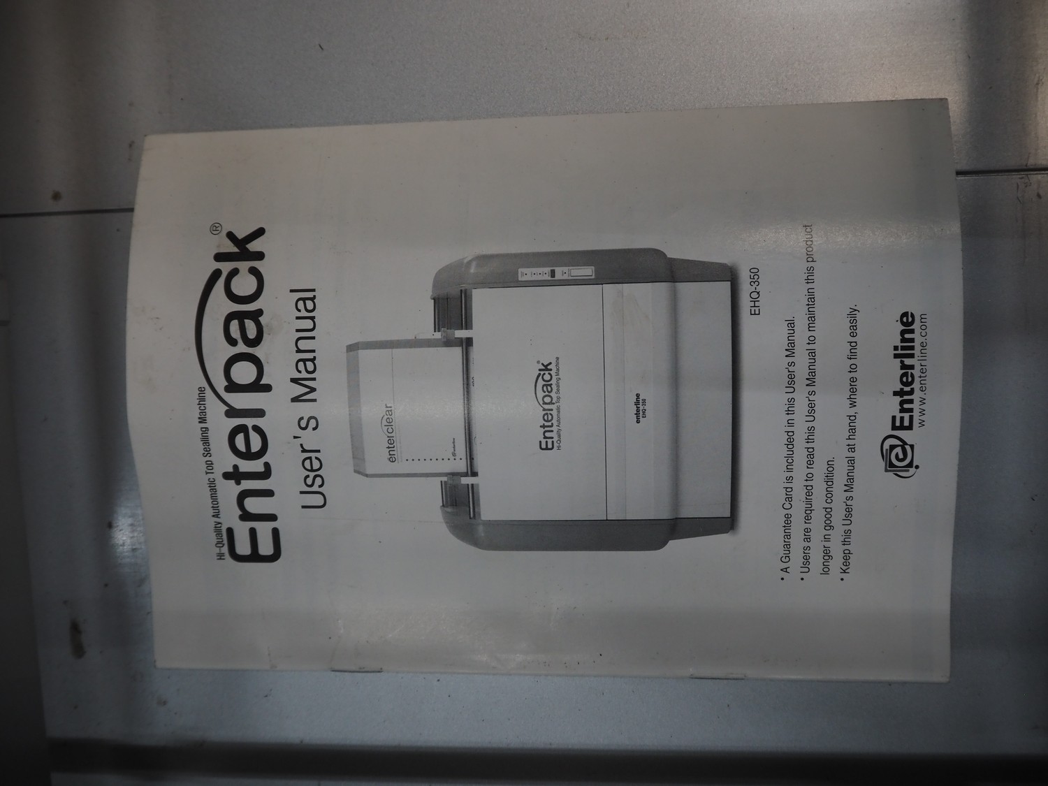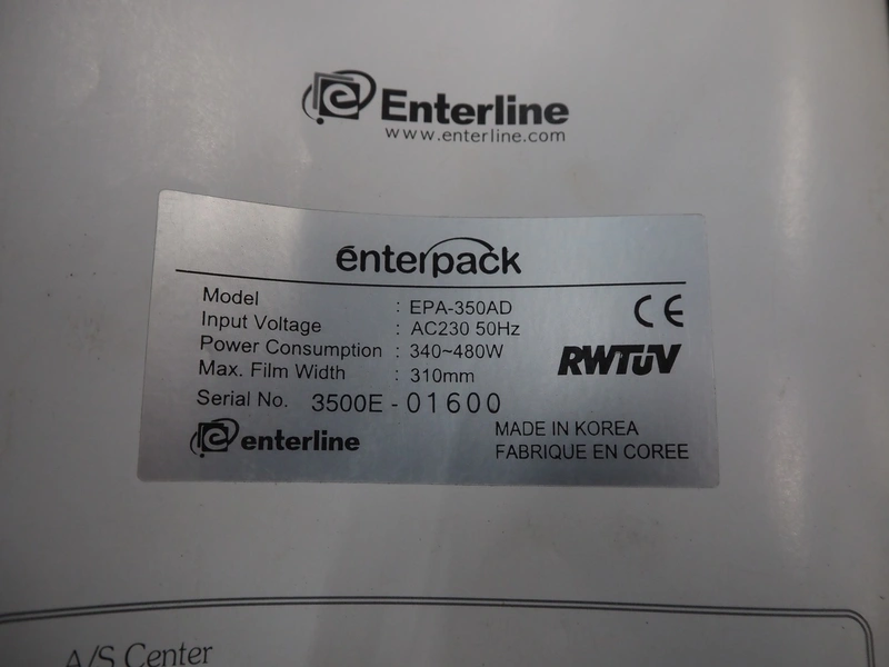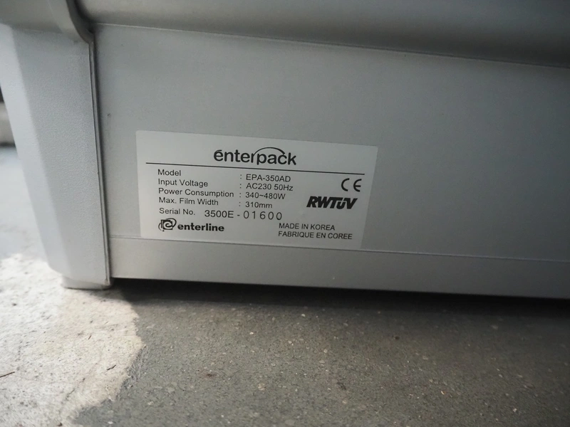 Enterpack/Conpax packaging machine, model: EPA-350AD, serial number: 3500E-01600, 230 V, 50 Hz, 340-480 Watt, maximum film width: 310 mm, dimensions: 452 mm x 354 mm x 410 mm.
