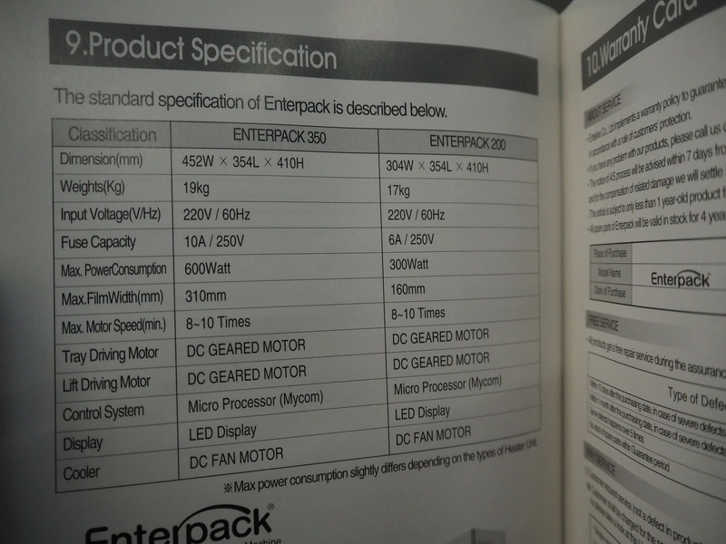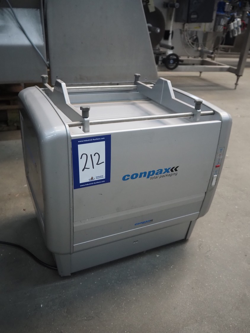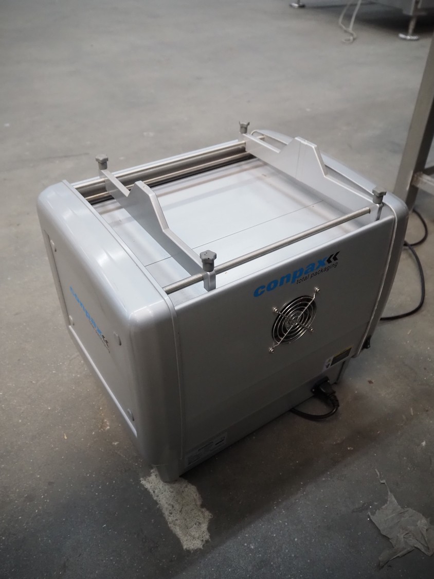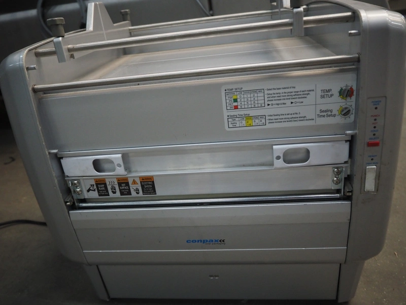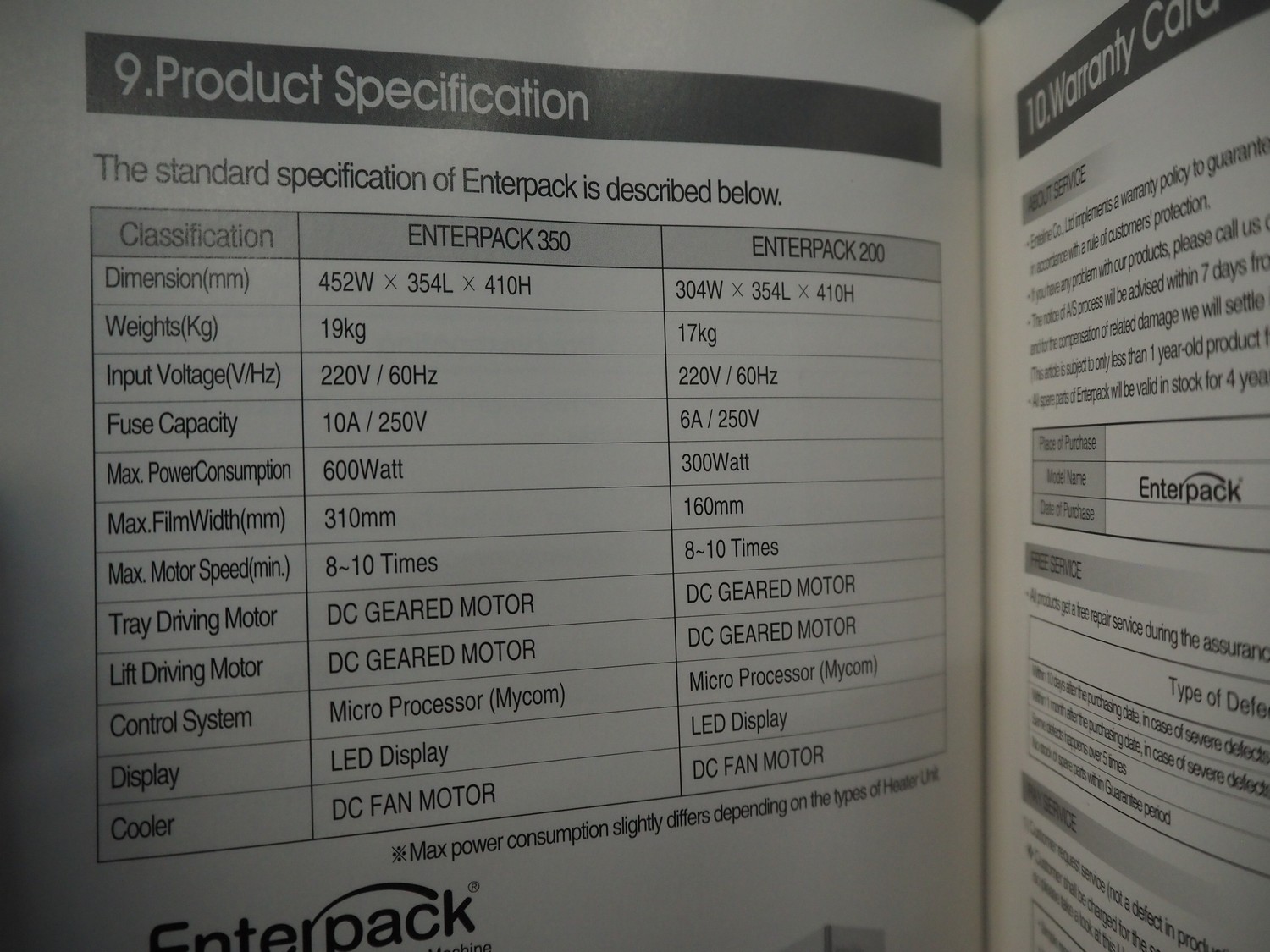 Enterpack/Conpax packaging machine, model: EPA-350AD, serial number: 3500E-01600, 230 V, 50 Hz, 340-480 Watt, maximum film width: 310 mm, dimensions: 452 mm x 354 mm x 410 mm.
