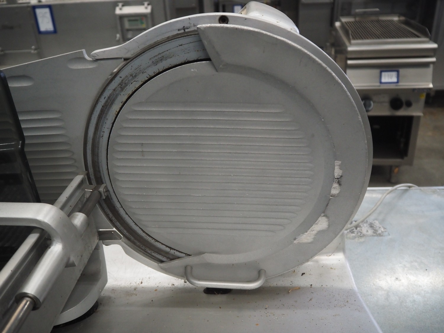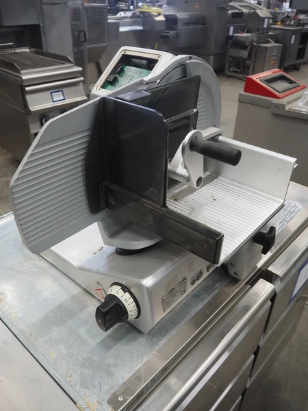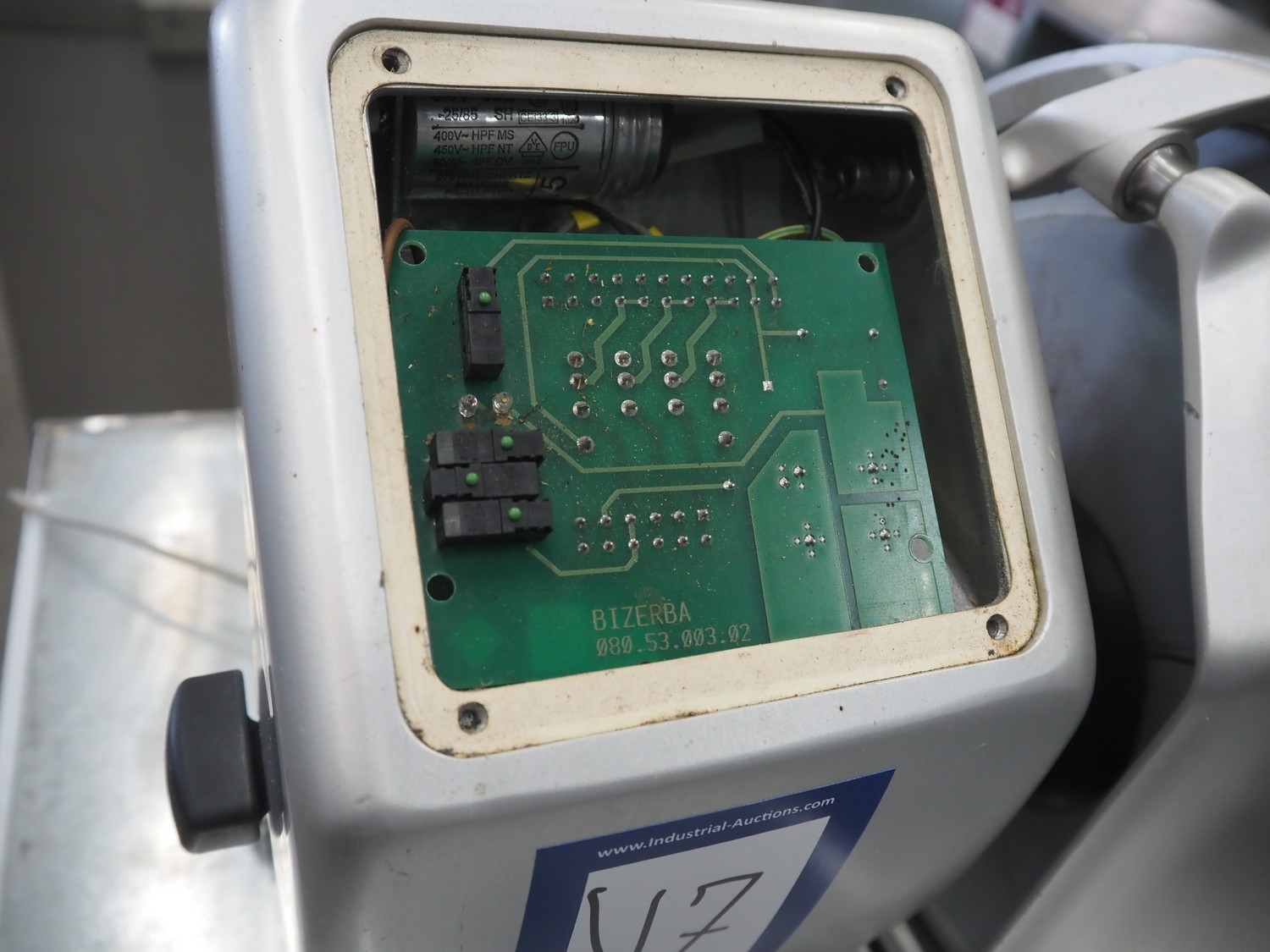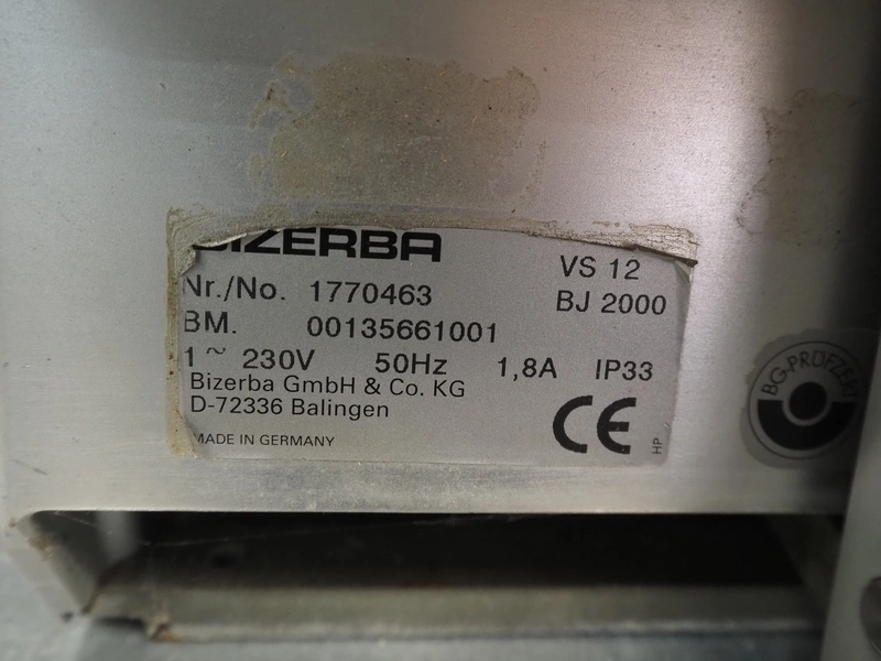 Bizerba slicer, type: VS 12, number: 1770463, year of construction: 2000, 230 V, 1 Ph, 50 Hz, 1.8 A, dimensions: 580 mm x 700 mm x 425 mm. Incomplete.