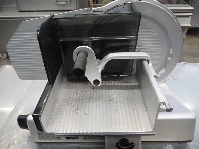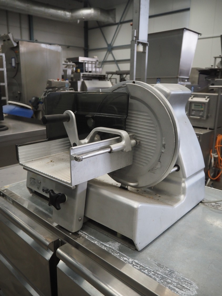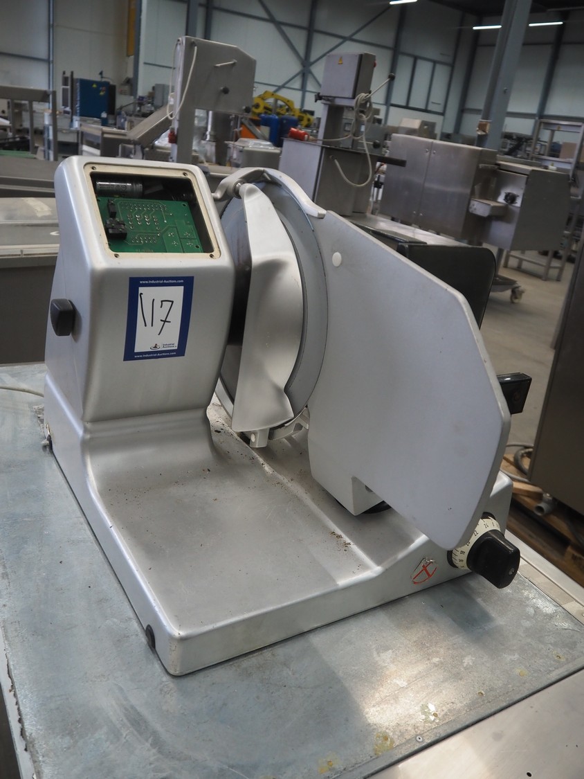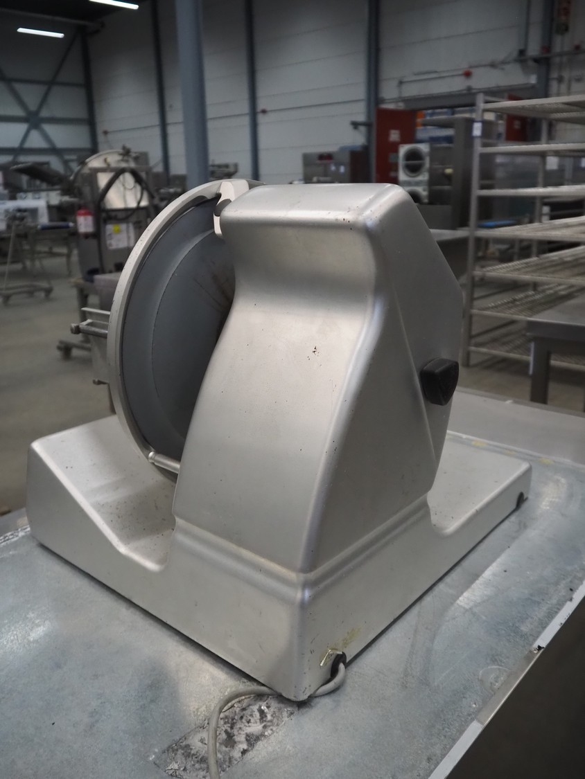Bizerba slicer, type: VS 12, number: 1770463, year of construction: 2000, 230 V, 1 Ph, 50 Hz, 1.8 A, dimensions: 580 mm x 700 mm x 425 mm. Incomplete.