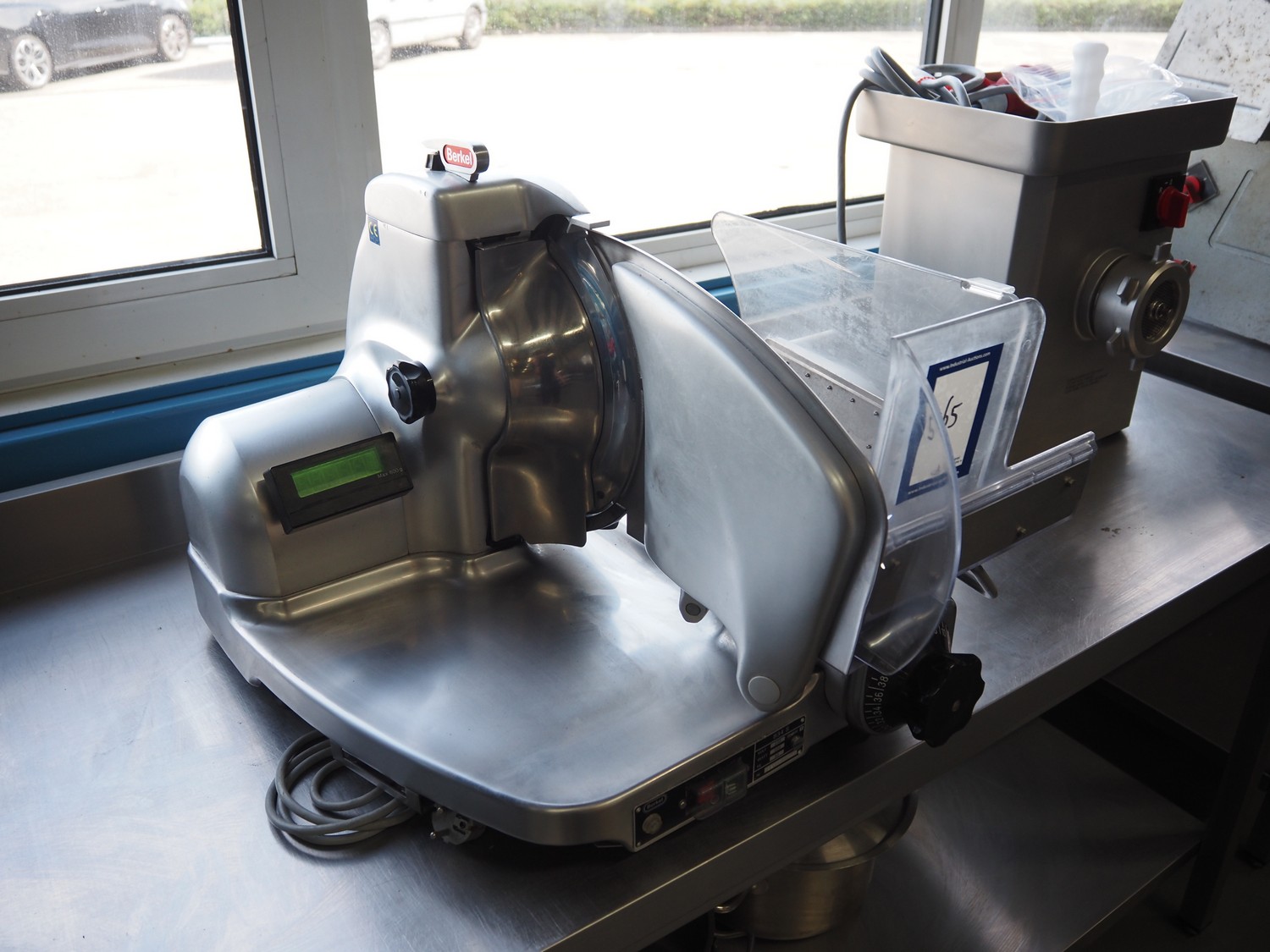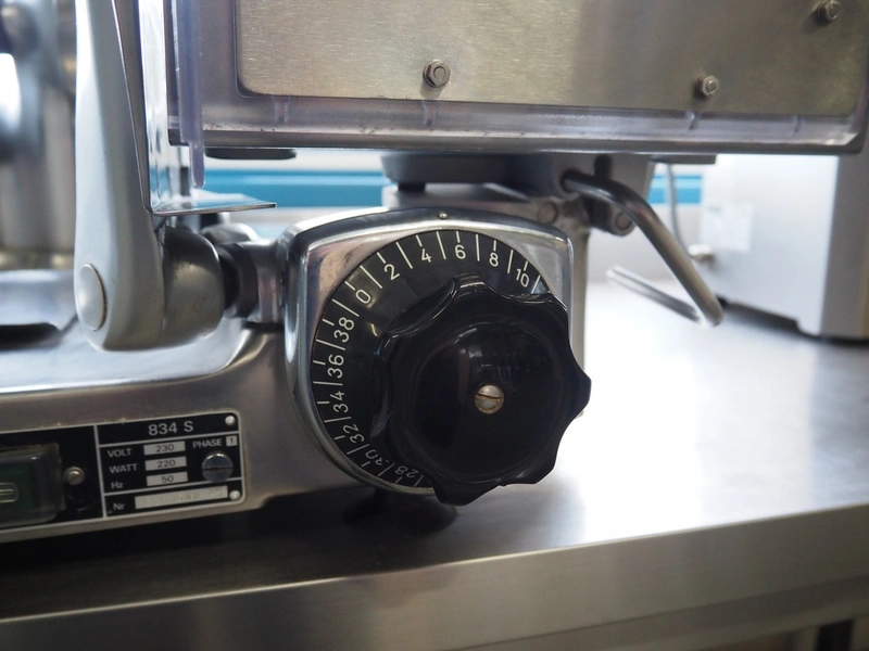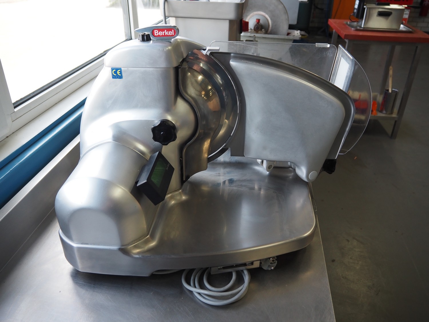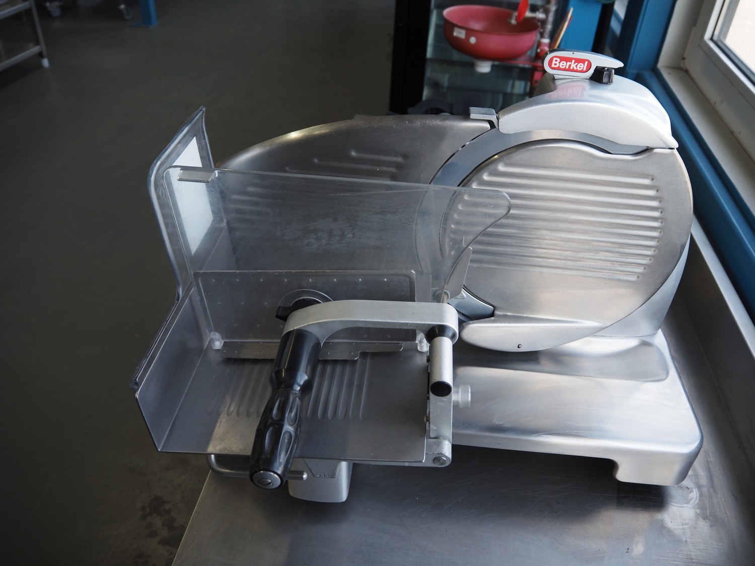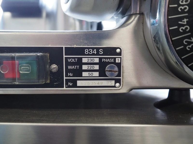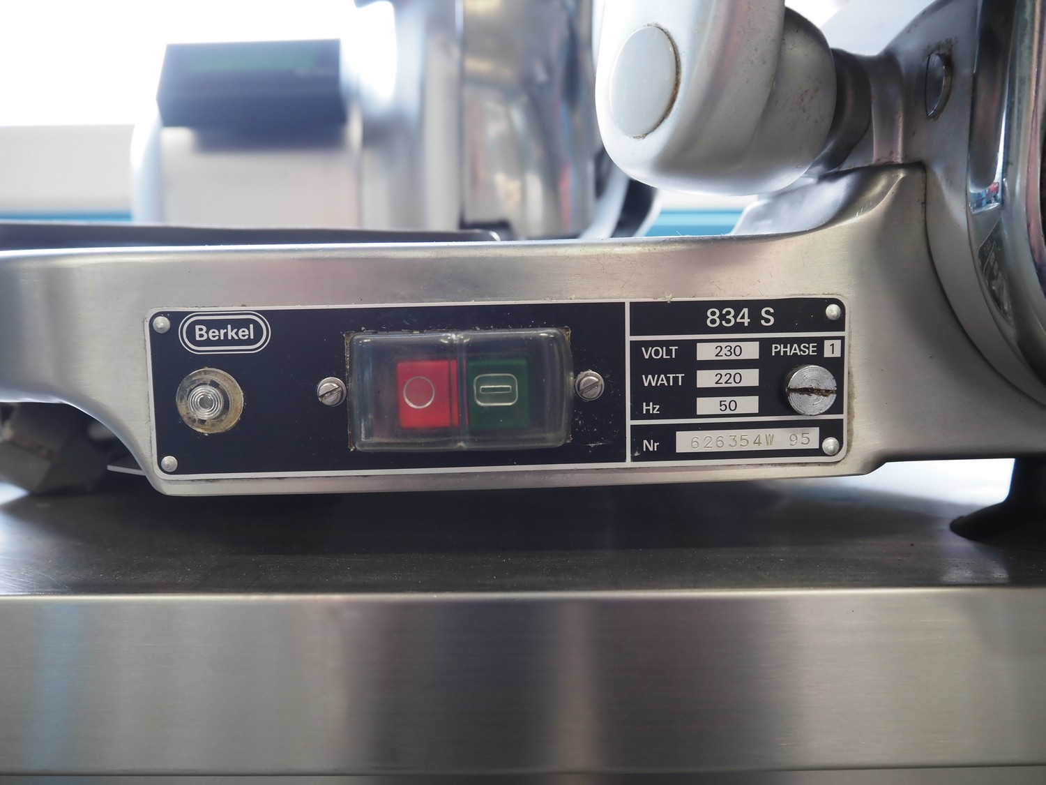 Berkel slicer, type: 834 S, number: 626354W 95, 230 V, 1 Ph, 50 Hz, 220 Watt, dimensions: 600 mm x 700 mm x 450 mm.