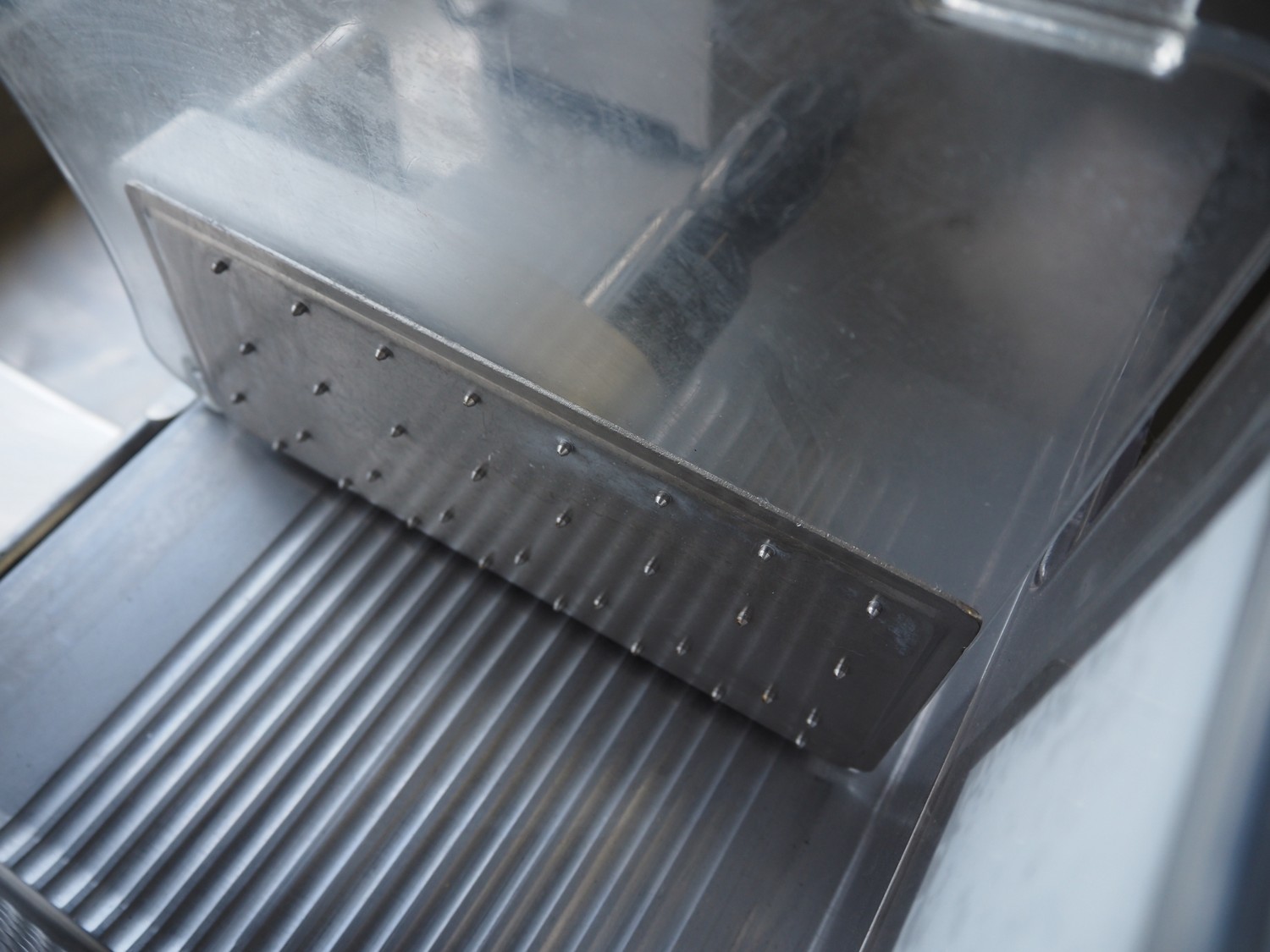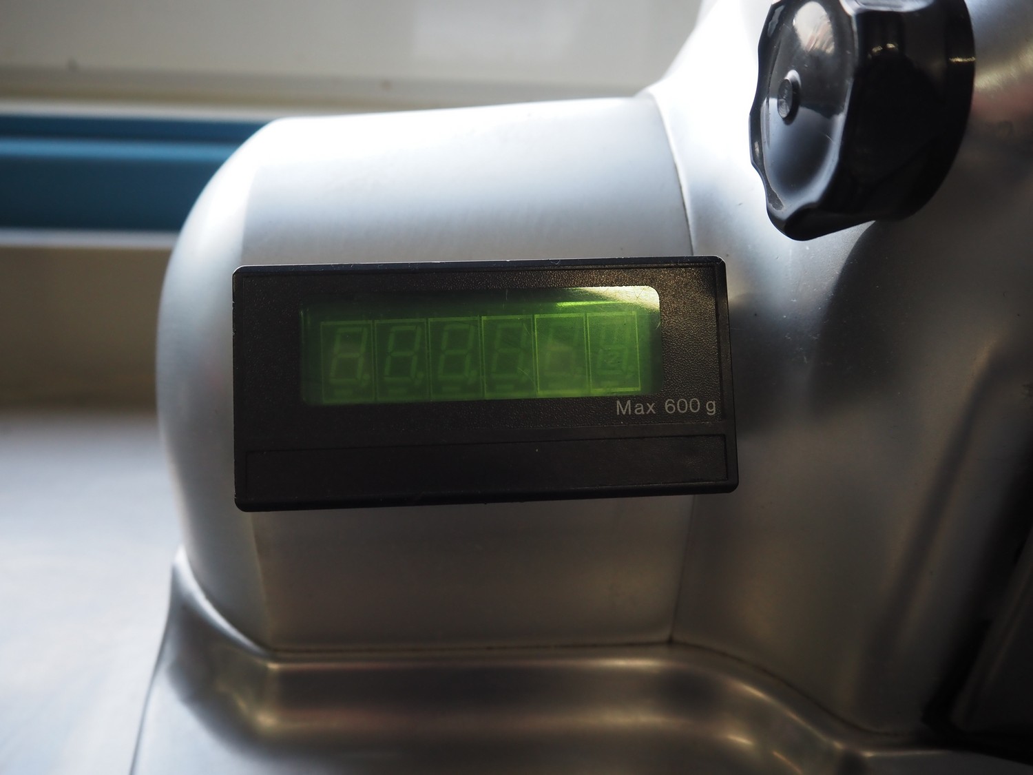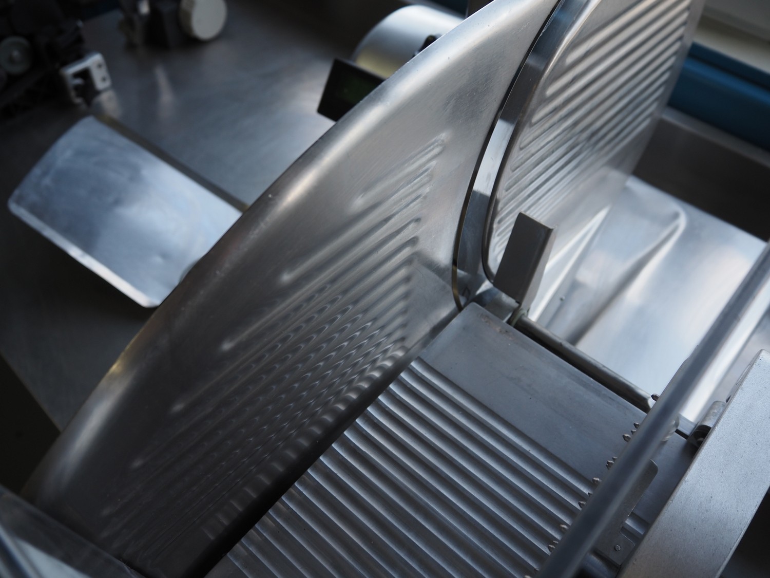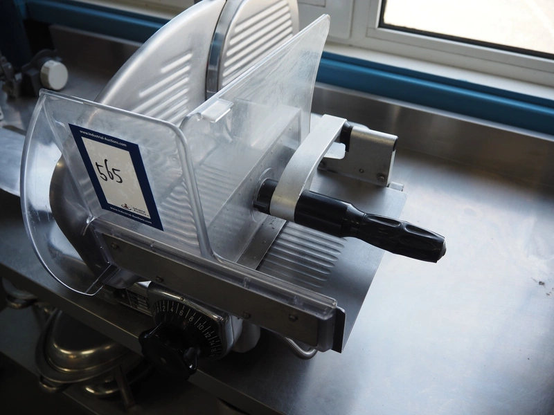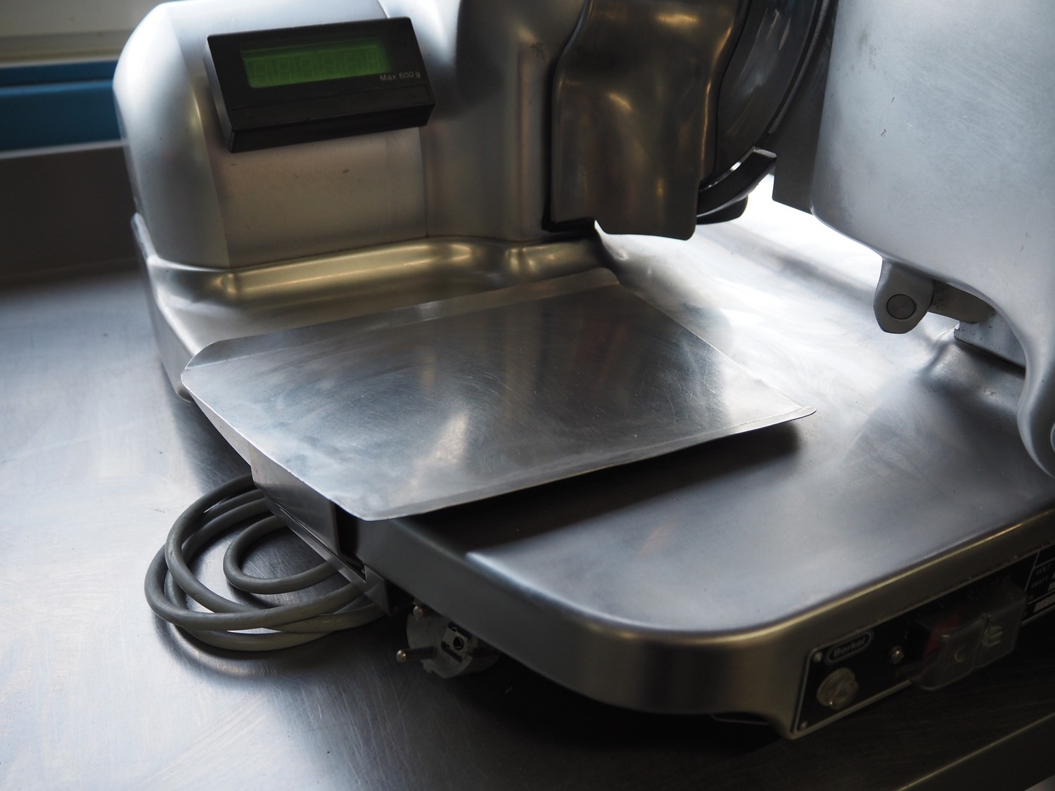 Berkel slicer, type: 834 S, number: 626354W 95, 230 V, 1 Ph, 50 Hz, 220 Watt, dimensions: 600 mm x 700 mm x 450 mm.
