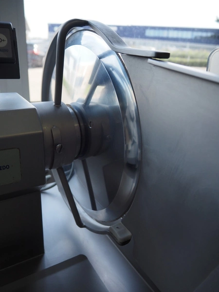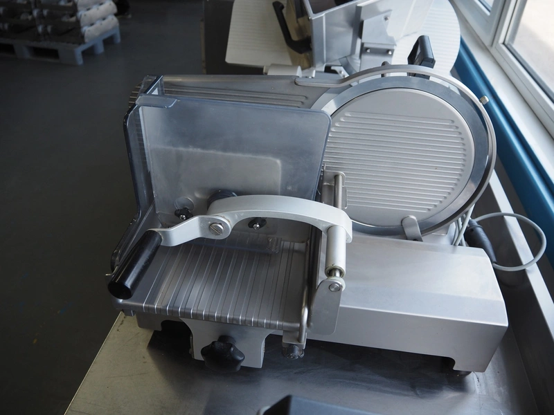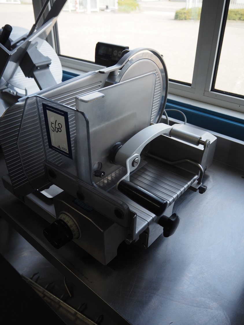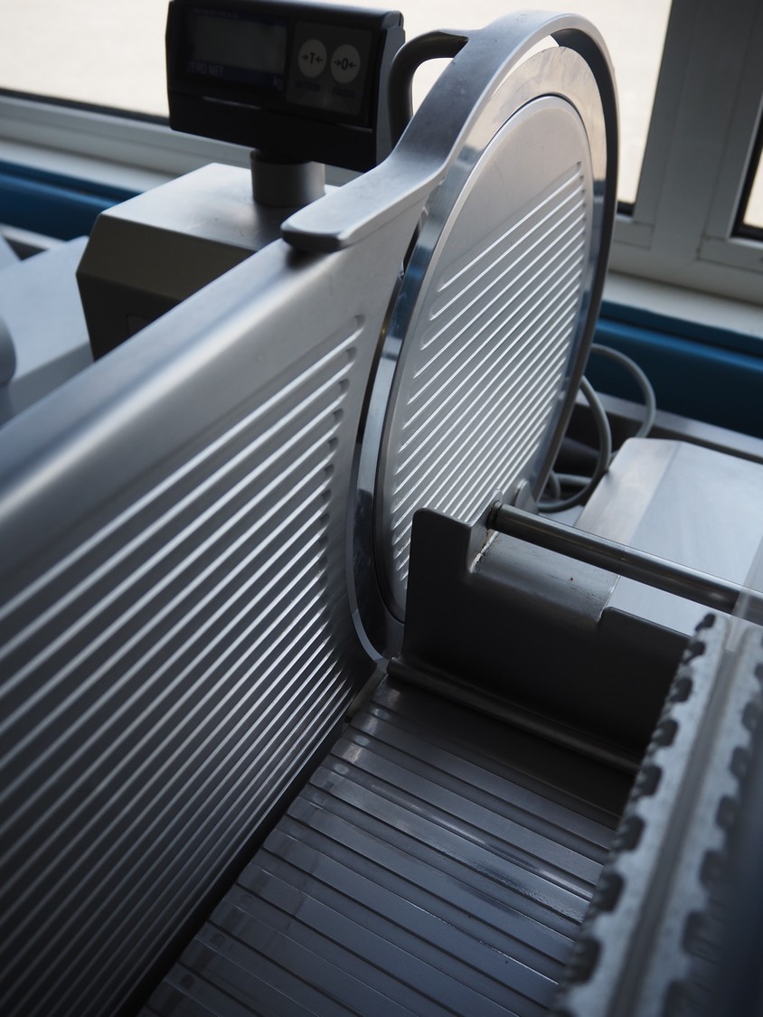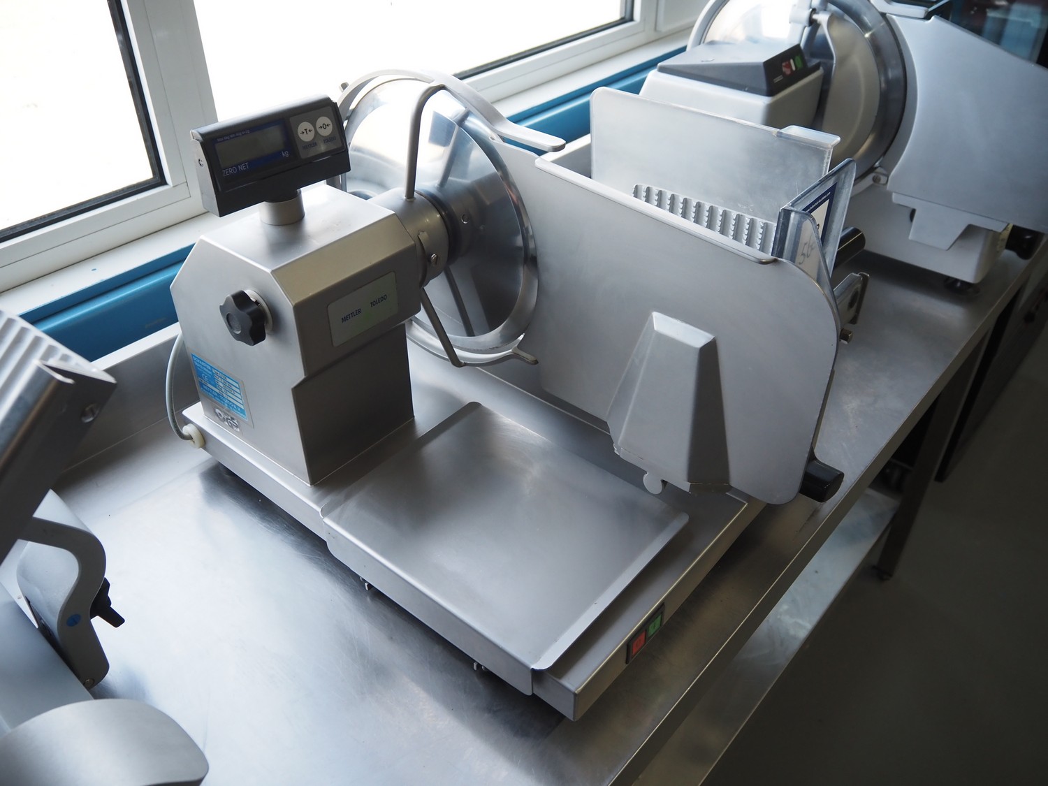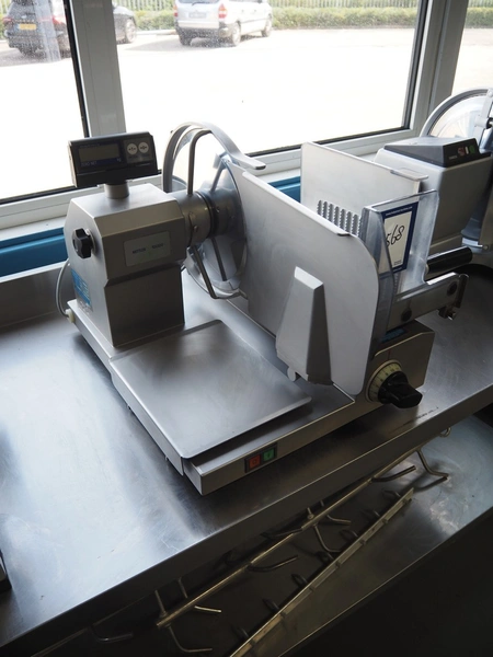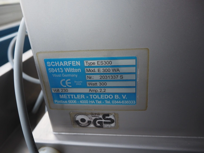 Scharfen slicer, type: ES300, model: E 300 WA, number: 2031337 S, 230 V, 2.2 A, 300 Watt, with Mettler Toledo weighing scale, maximum weight: 3 kg, minimum weight: 40 gram, e = 2 gram, dimensions: 630 mm x 550 mm x 420 mm.
