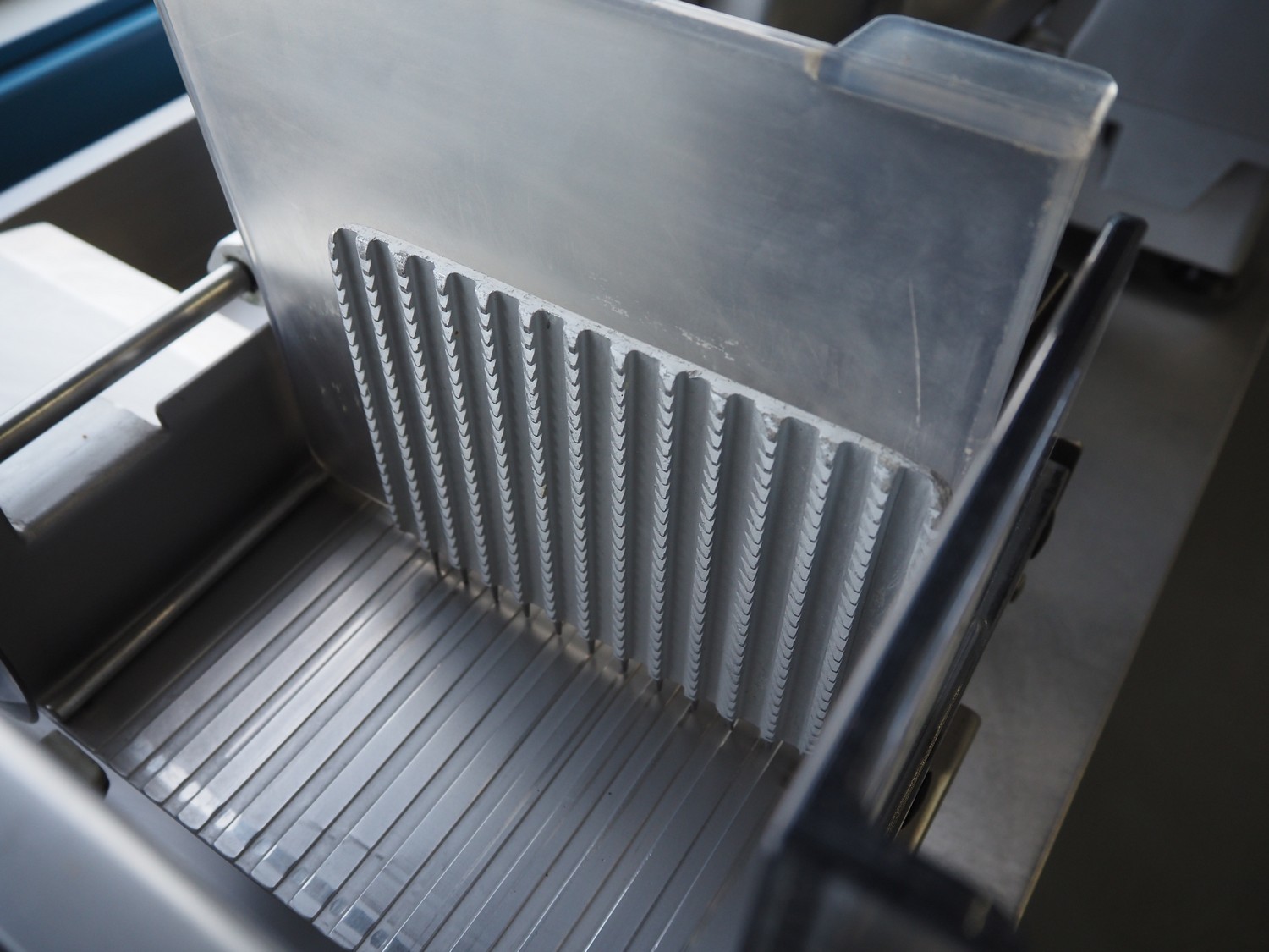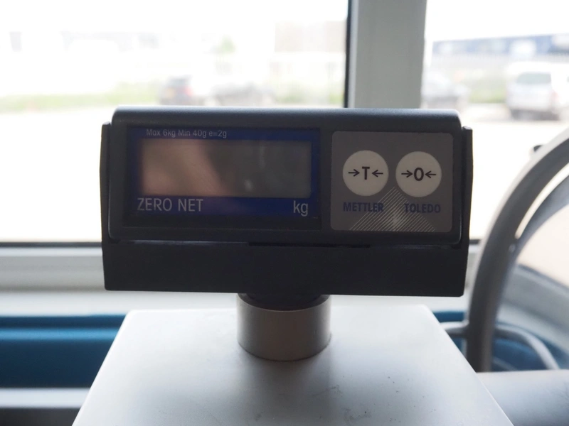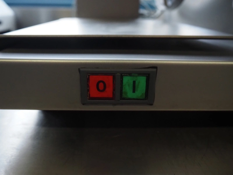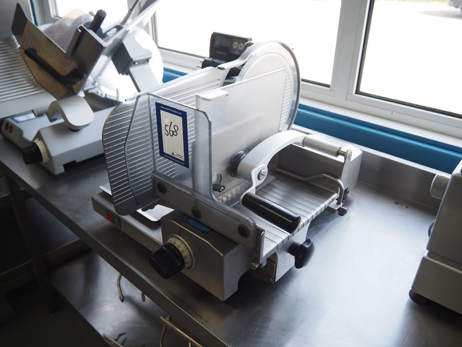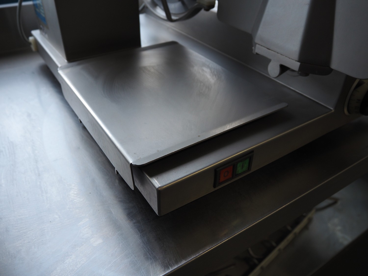 Scharfen slicer, type: ES300, model: E 300 WA, number: 2031337 S, 230 V, 2.2 A, 300 Watt, with Mettler Toledo weighing scale, maximum weight: 3 kg, minimum weight: 40 gram, e = 2 gram, dimensions: 630 mm x 550 mm x 420 mm.
