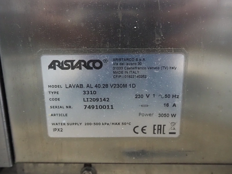Aristarco dishwasher, model: Lavab. AL 40.28 V230M 1D, type: 3310, serial number: 7491001, 230 V, 1 Ph, 50 Hz, 16 A, 3050 W, dimensions: 480 mm x 550 mm x 750 mm. Including osmos maxi boiler.
