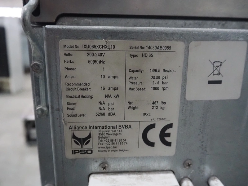 IPSP washing machine, model: IXU065XCHXU10, type: HD 65, serial number: 14030AB0055, 200-240 V, 50/60 Hz, 10 A. weight: 212 kg, dimensions: 680 mm x 660 mm x 1030 mm.
