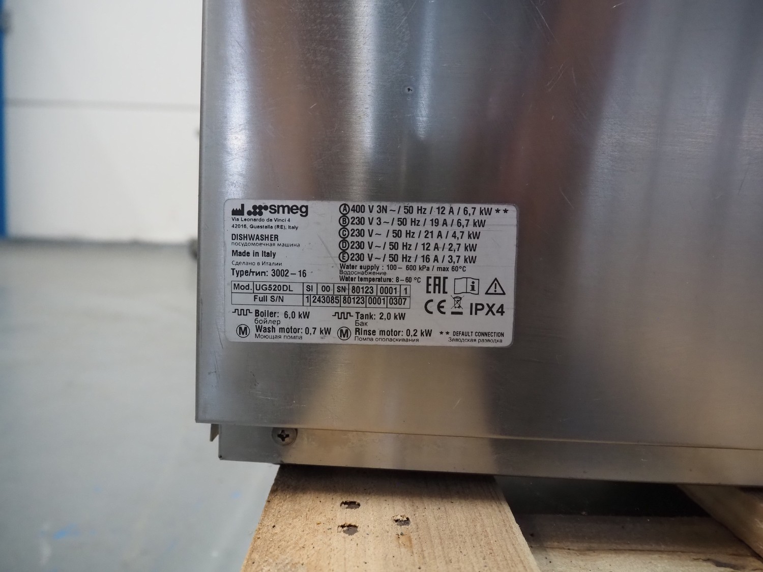 SMEG dishwasher, type: 3002-16, model: UG520DL, serial number: 1 243085 80123 0001 0307, crate dimensions: 490 mm x 510 mm, total dimensions: 600 mm x 600 mm x 720 mm.