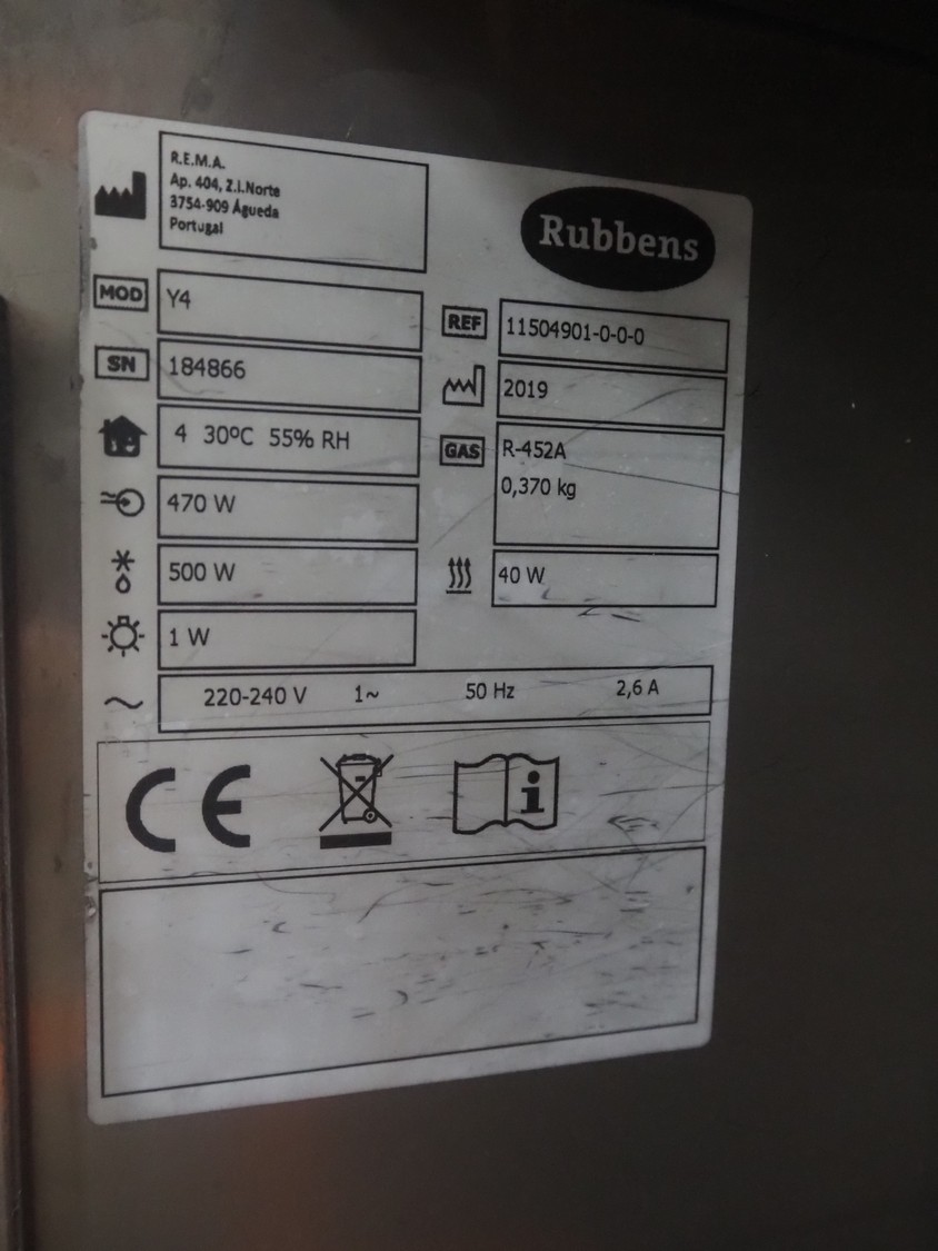 Rubbens blast chiller, model: Y4, serial number: 184866, year of construction: 2019, 220-240 V, 1 Ph, 50 Hz, 2.6 A, refrigerant: R452A, 0.370 kg, dimensions: 720 mm x 510 mm x 2080 mm. Damaged.