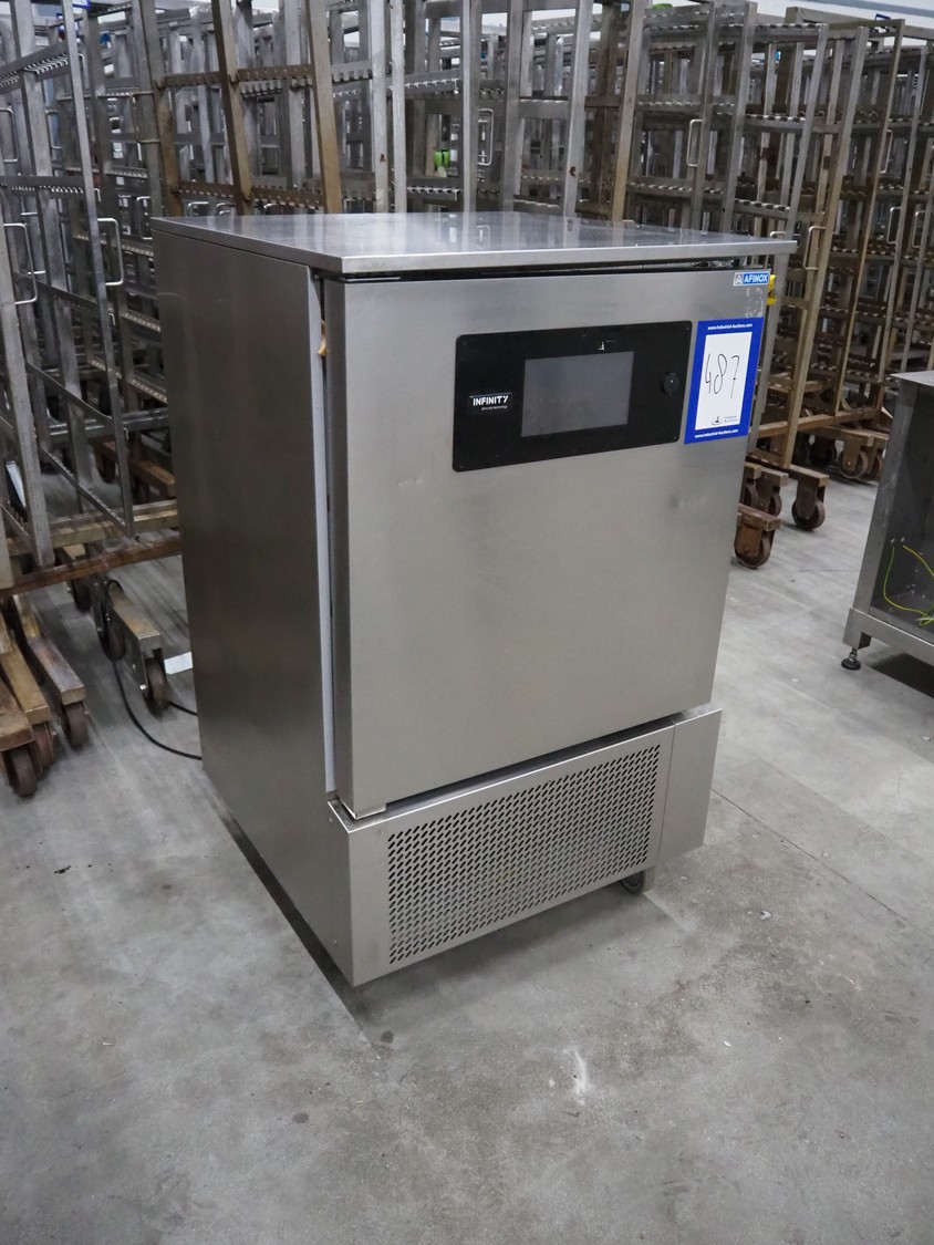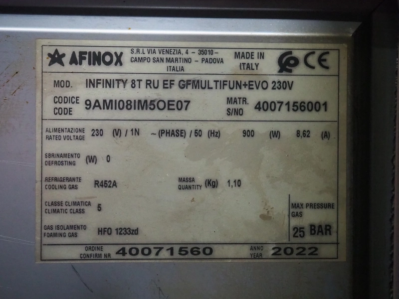 Afinox blast chiller, model: Infinity 8T RU EF GFMULTIFUN+EVO 230V, serial number: 4007156001, year of construction: 2022, 230 V, 1 Ph, 50 Hz, 8.62 A, 900 W, refrigerant: R452A/1.10 kg, 8 floors, floor dimensions: 600 mm x 300 mm, total dimensions: 790 mm x 800 mm x 1330 mm.