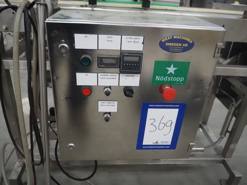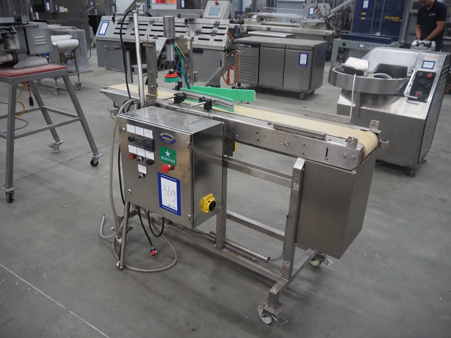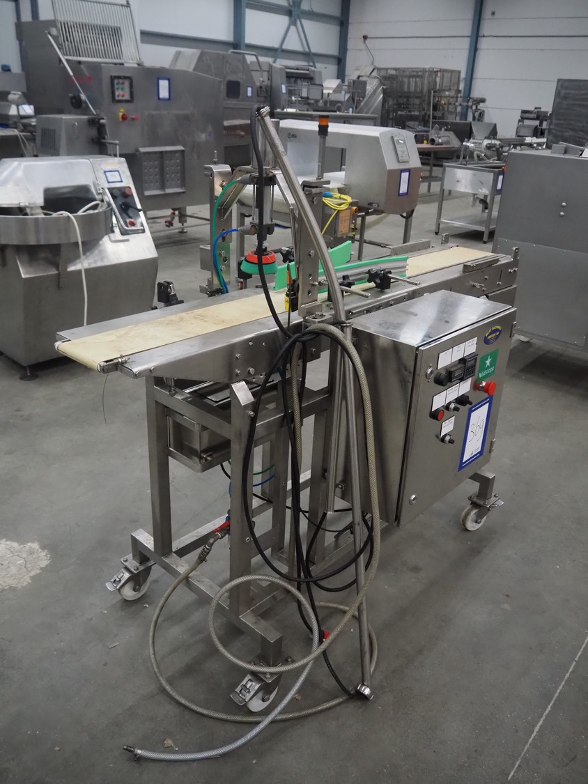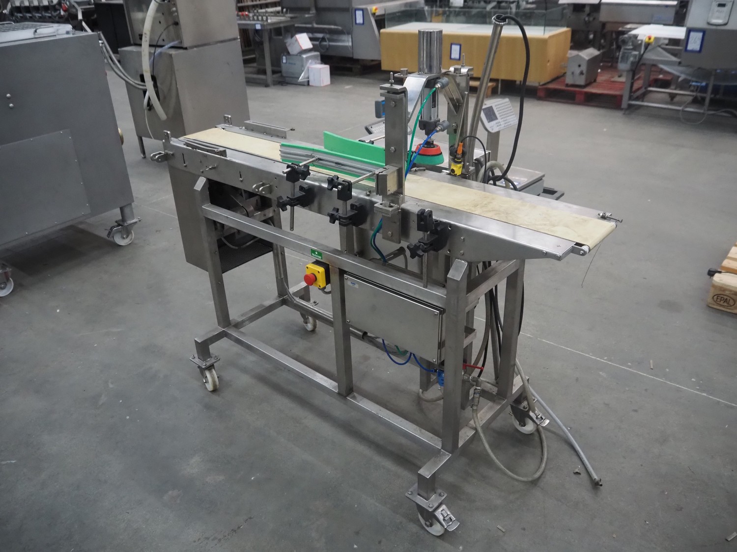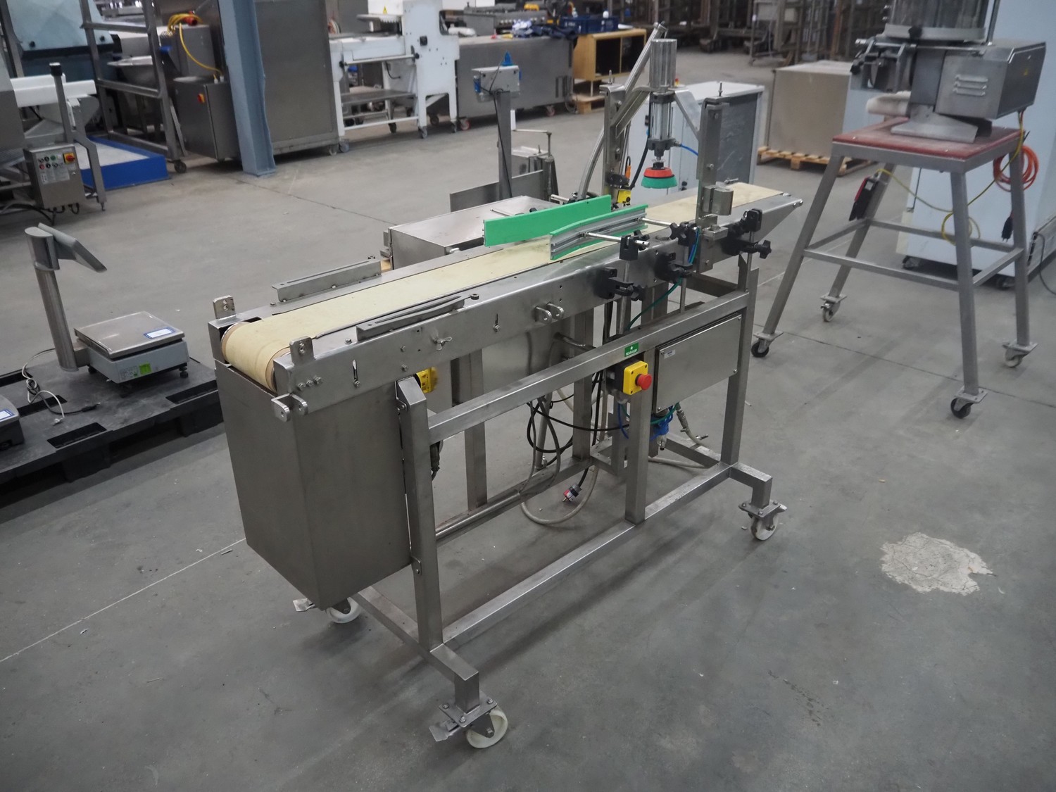 Mobile portioning belt, s/s frame, plastic belt, belt width: 150 mm, total dimensions: 1750 mm x 700 mm x 1400 mm.
