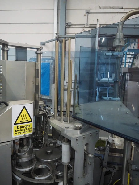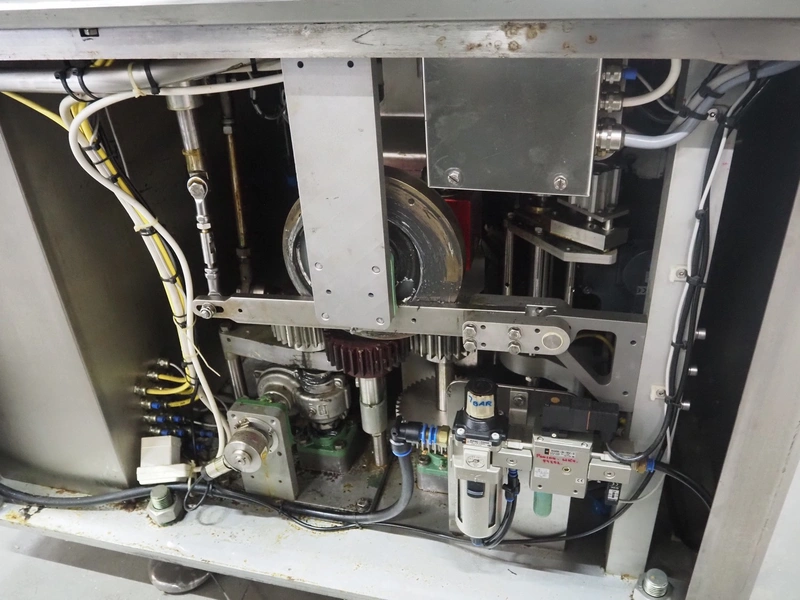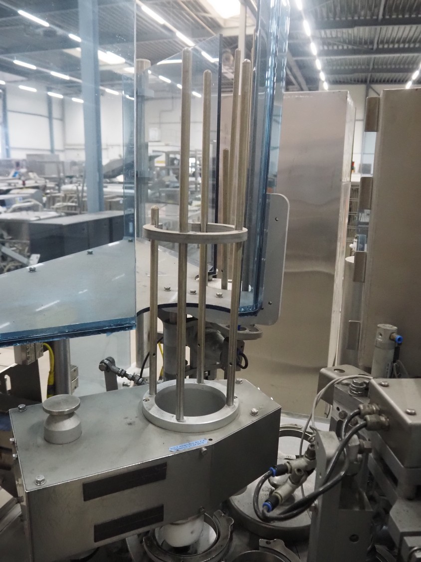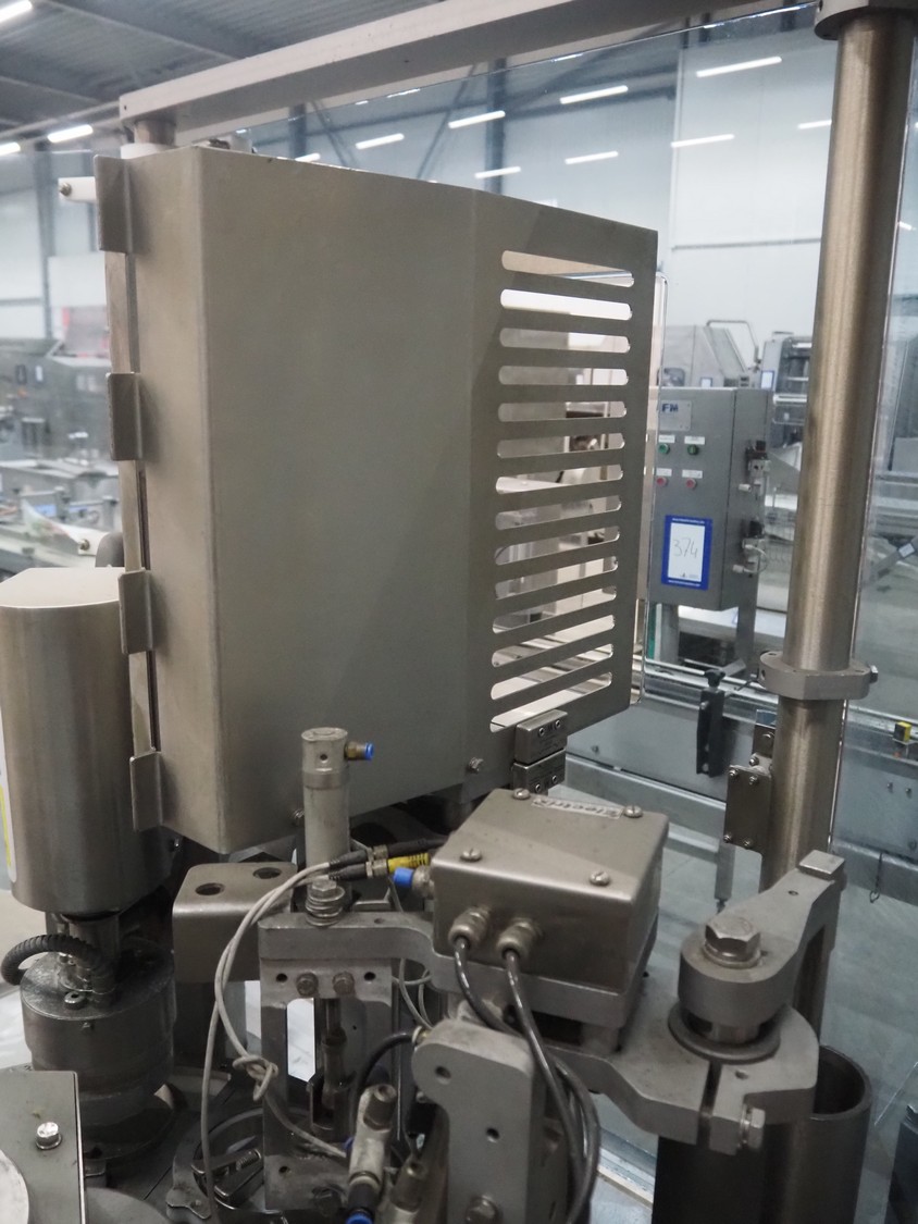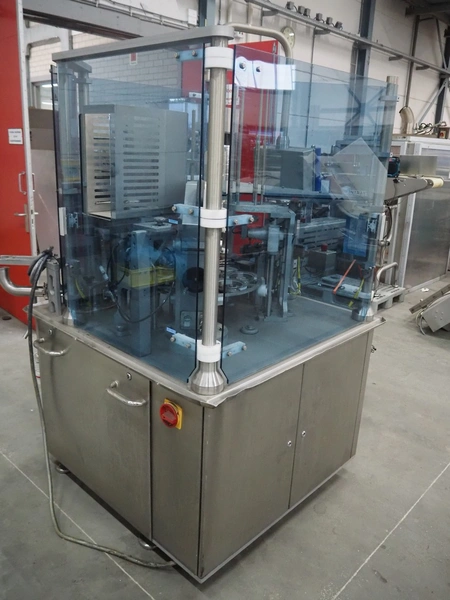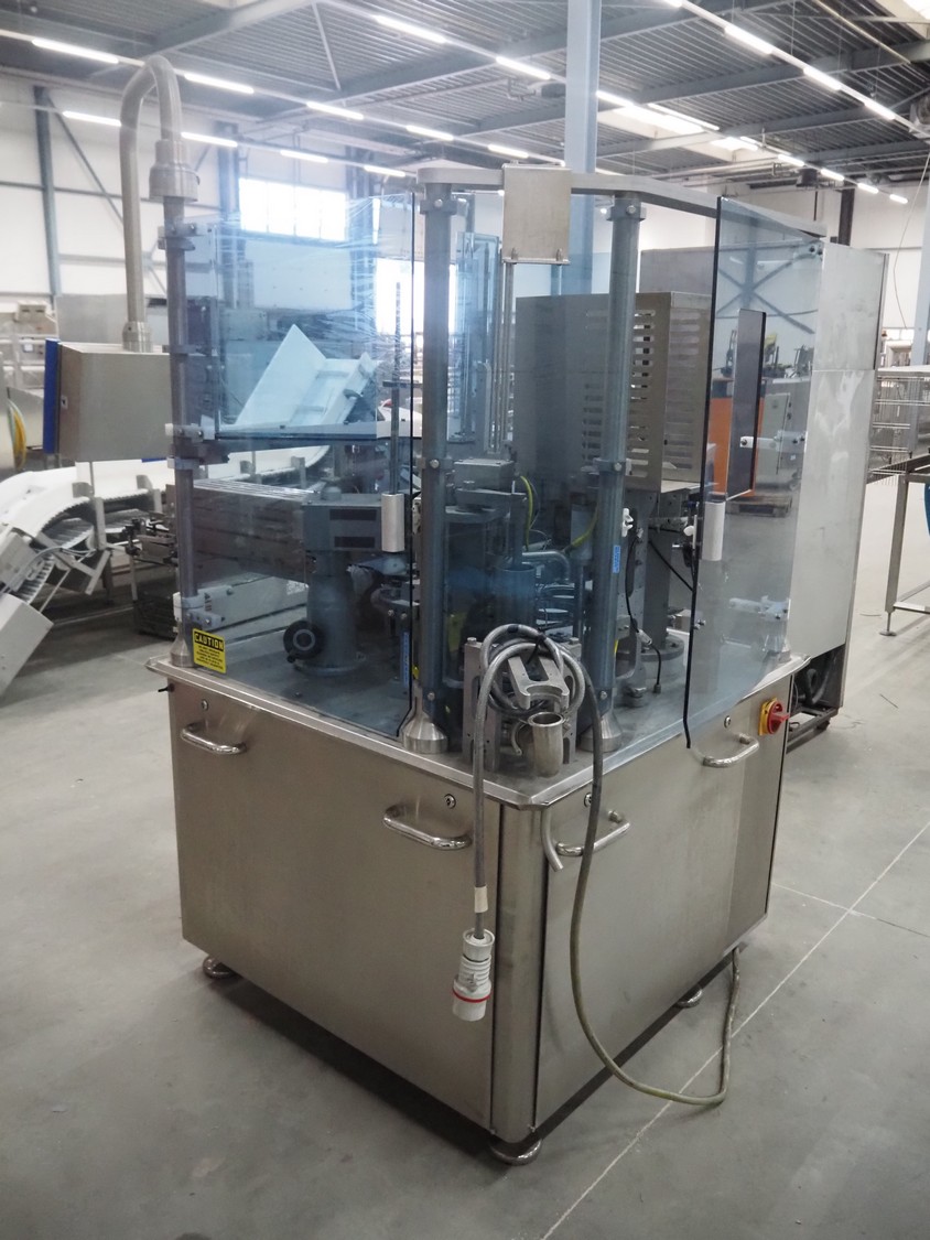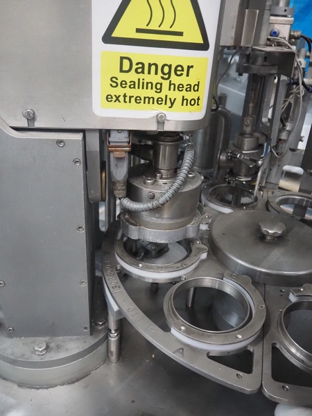 Cup filling and sealing machine, diameter cups, 105 mm, belt width: 120 mm, total dimensions: 1300 mm x 2100 mm x 2350 mm. Including pallet with parts.