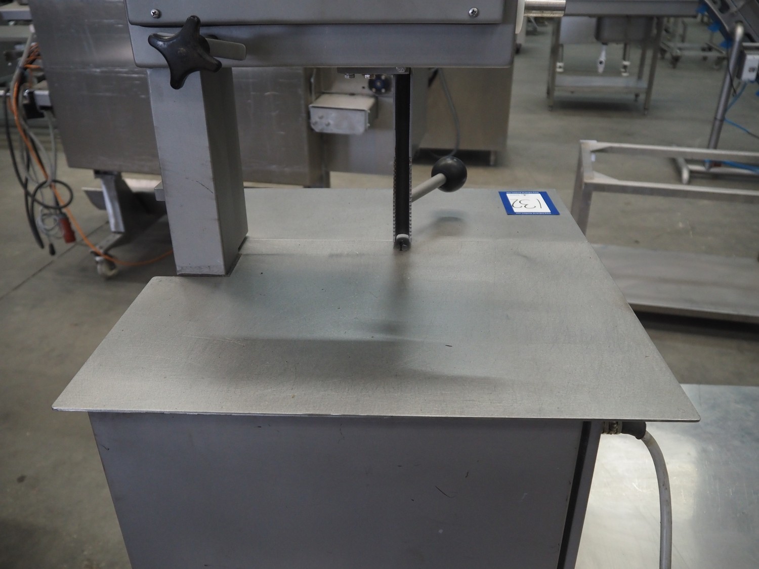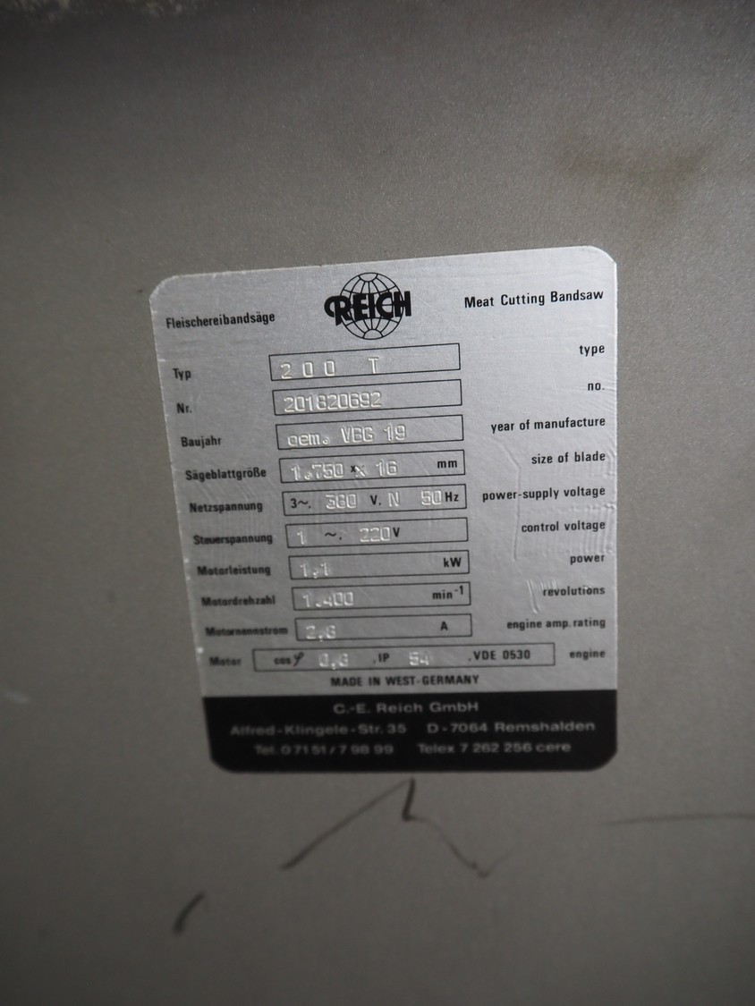 Reich bandsaw, type: 200 T, number: 201820692, 380 V, 3 Ph, 50 Hz, 2.6 A, 1.1 kW, dimensions: 570 mm x 530 mm x 900 mm.