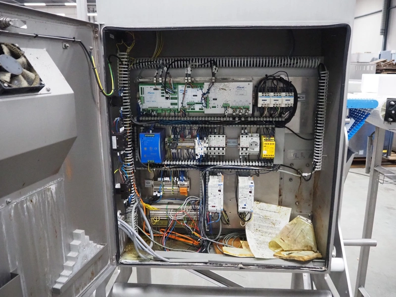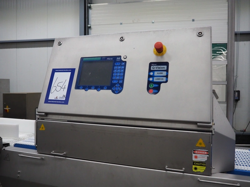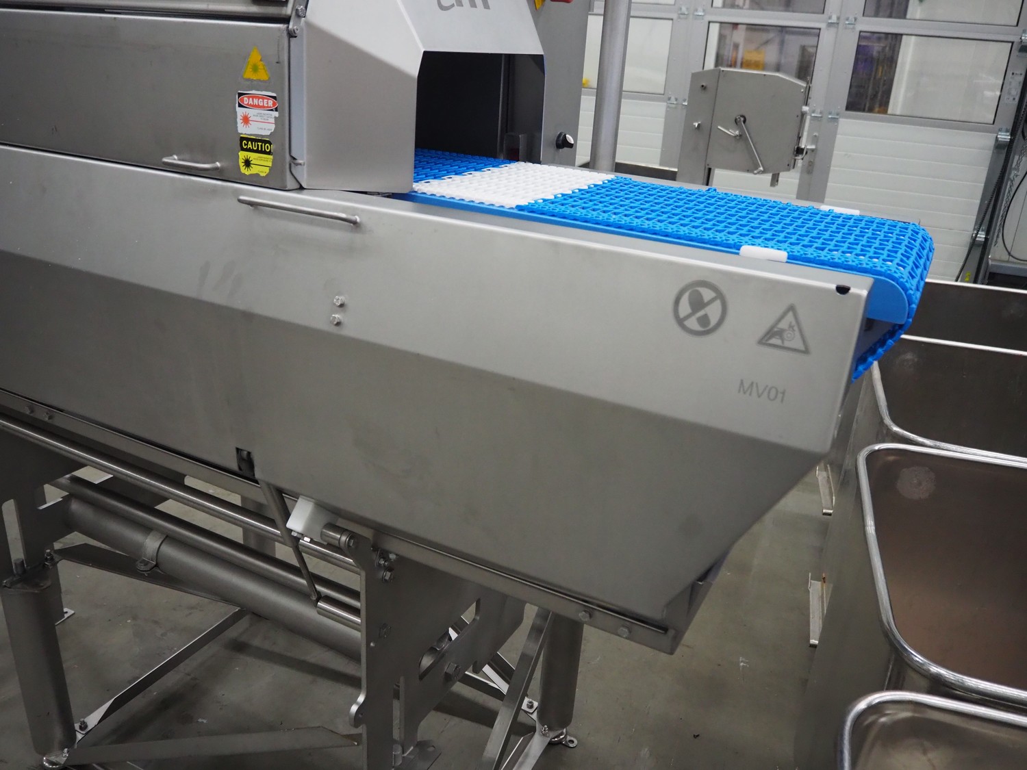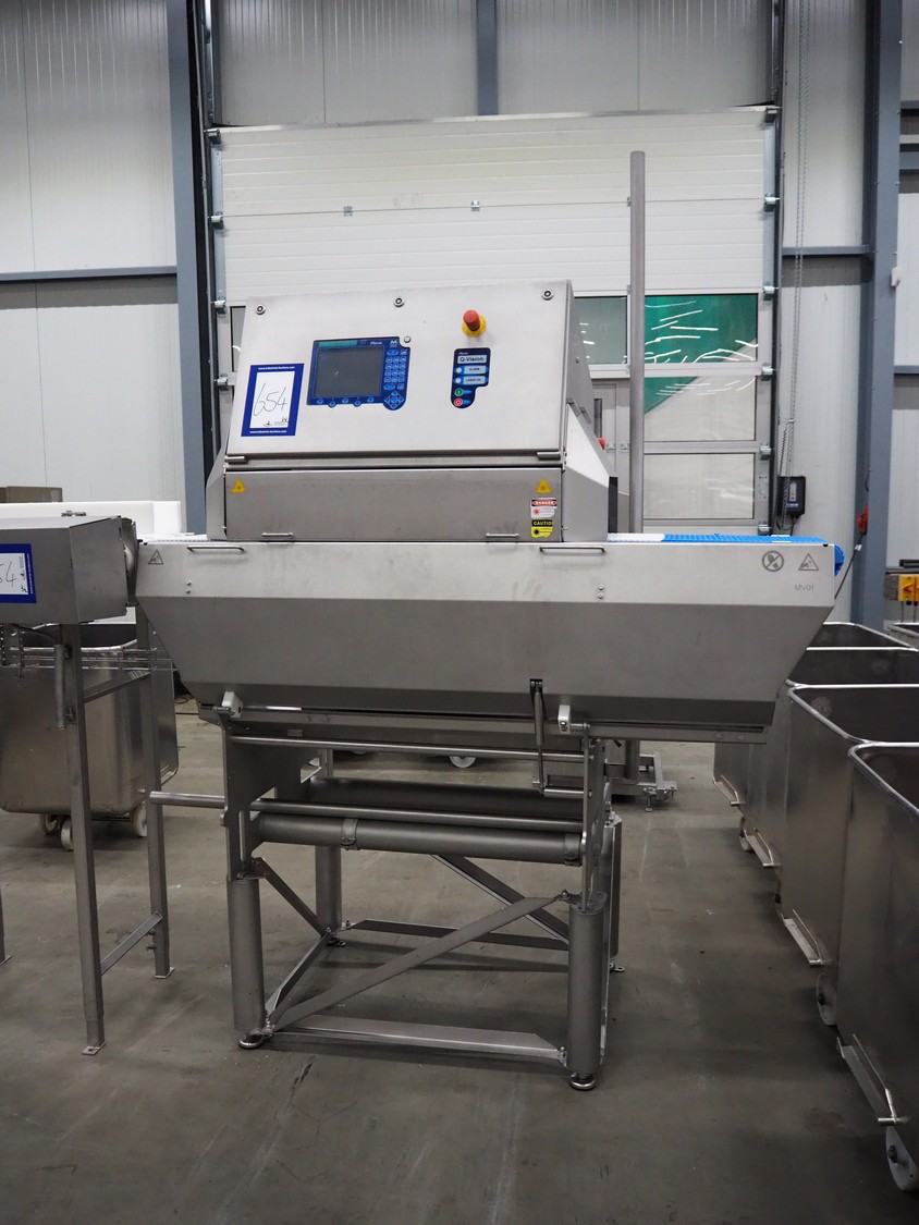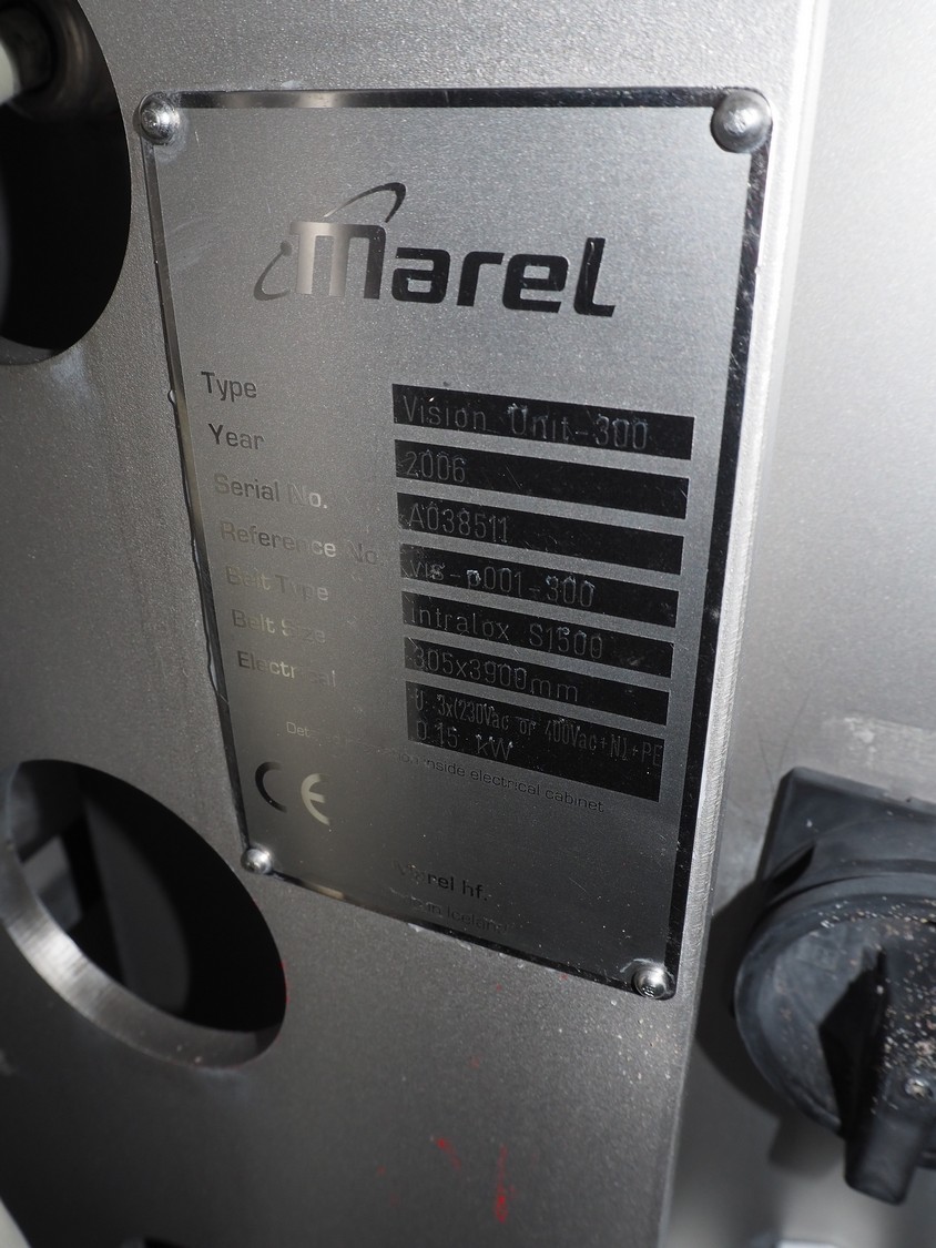 Marel grader, type: Vision Unit-300, serial number: A038511, year of construction: 2006, 230/400 V, 3 Ph, 0.15 kW, plastic mesh belt, belt width: 310 mm, total dimensions: 1750 mm x 800 mm x 2470, with Marel transport belt, type: con-mstr, serial number: A044894, year of construction: 2007, 230/400 V, 3 Ph, 0.25 kW, s/s frame, plastic mesh belt, belt width: 300 mm, total dimensions: 1050 mm x 700 mm x 1550 mm.