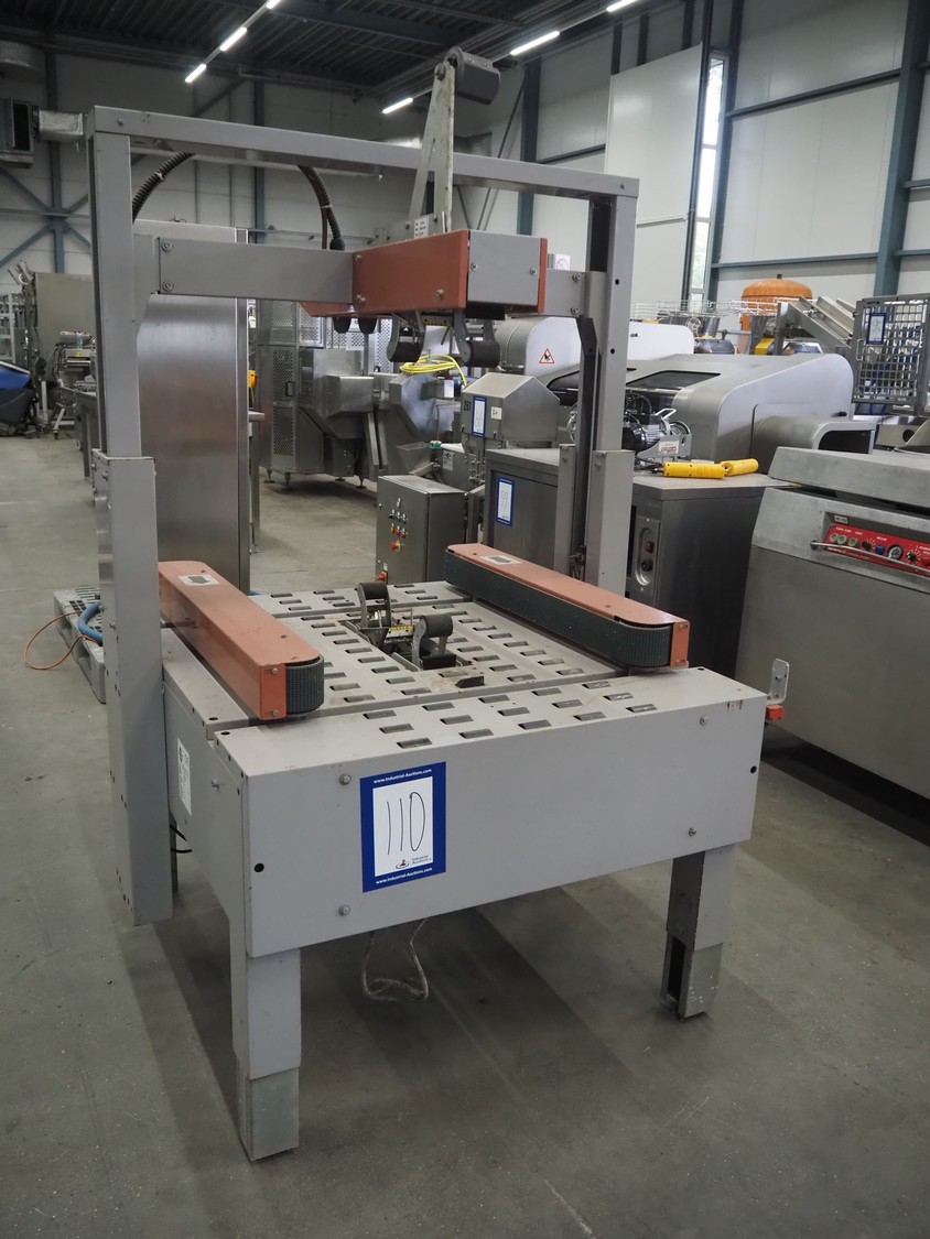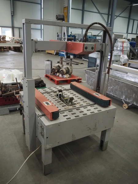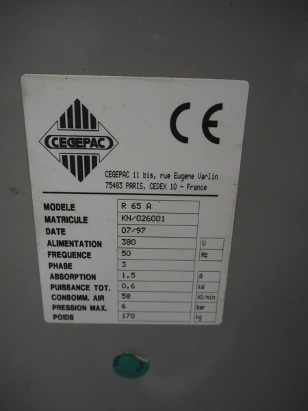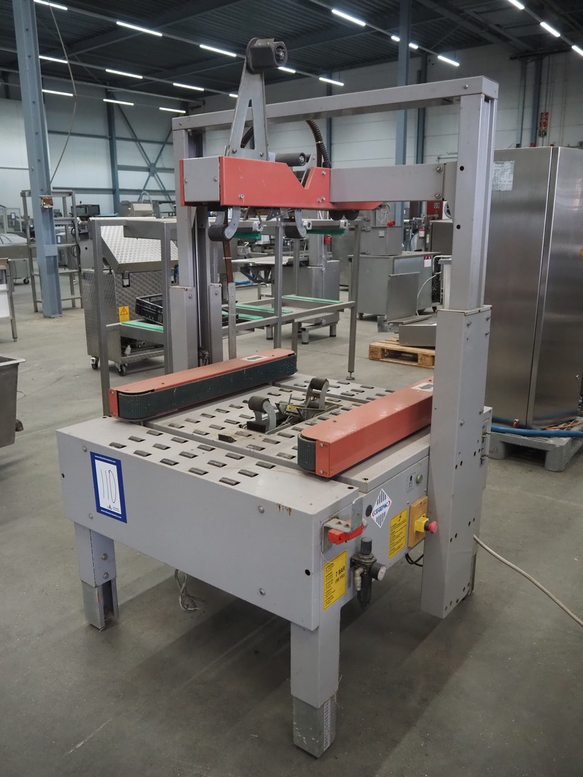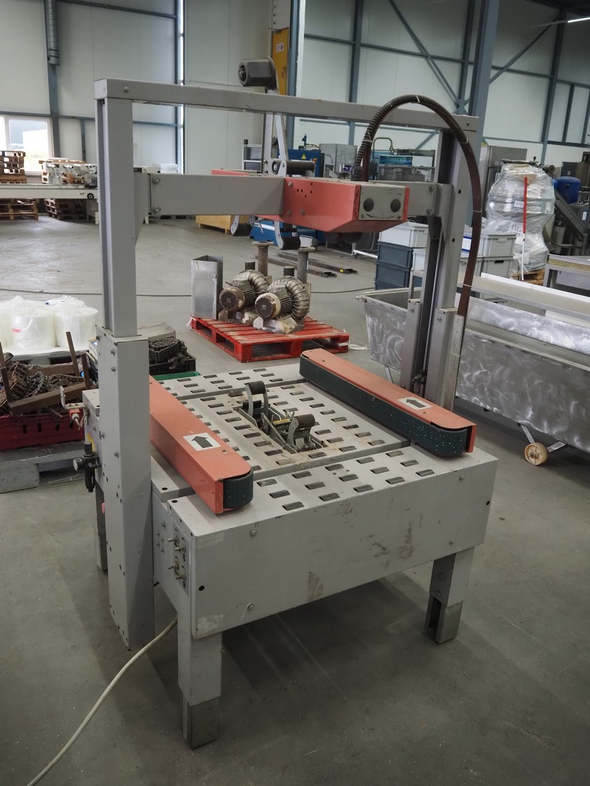 Cegepac box closing machine, model: R 65 A, serial number: KN/026001, year of construction: 07/97, 380 V, 3 Ph, 50 Hz, 1.5 A, 0.6 kW, weight: 170 kg, dimensions: 1160 mm x 1070 mm x 1800 mm.