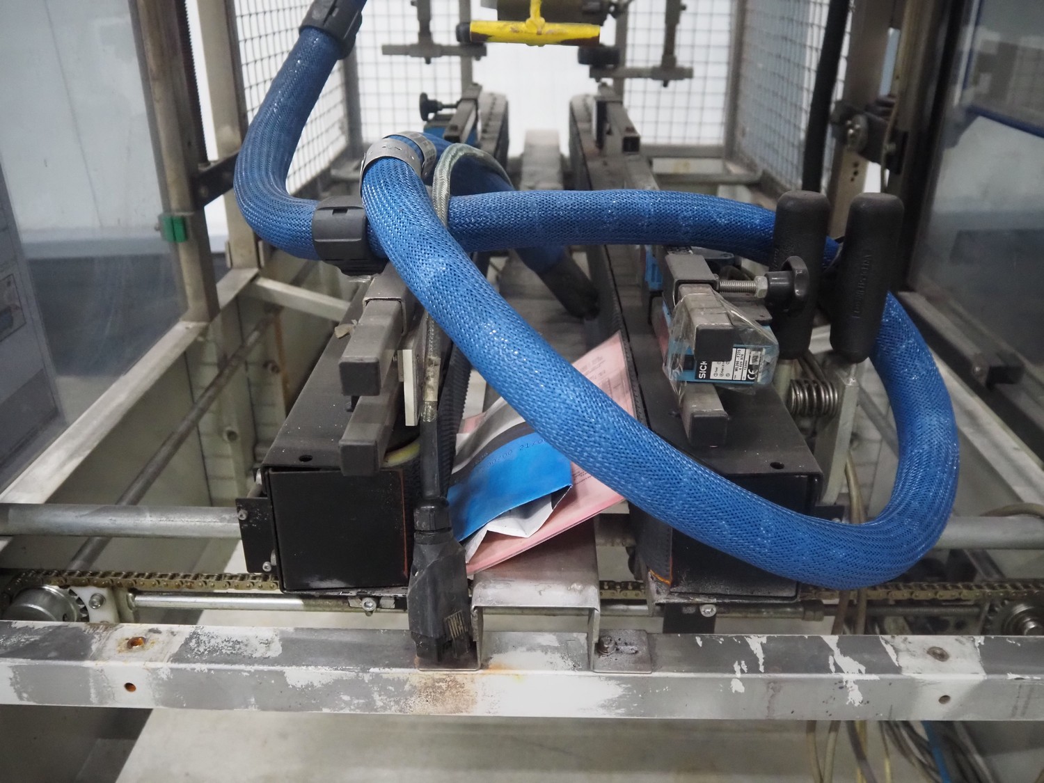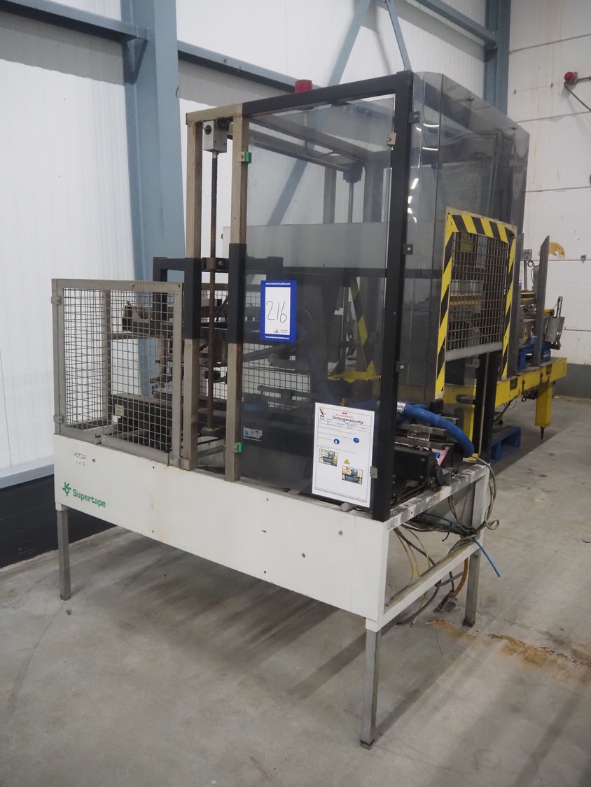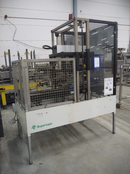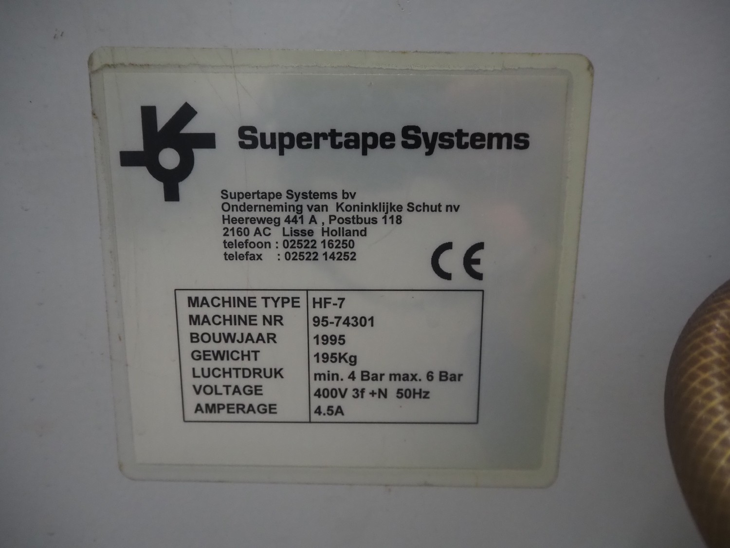 Supertape box closing machine, type: HF-7, machine number: 95-74301, year of construction: 1995, 400 V, 3 Ph, 50 Hz, 4.5 A, weight: 195 kg, dimensions: 1700 mm x 1050 mm x 2200 mm.