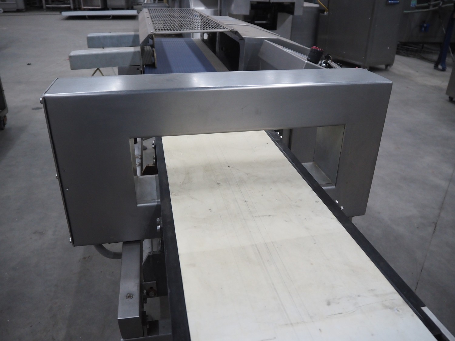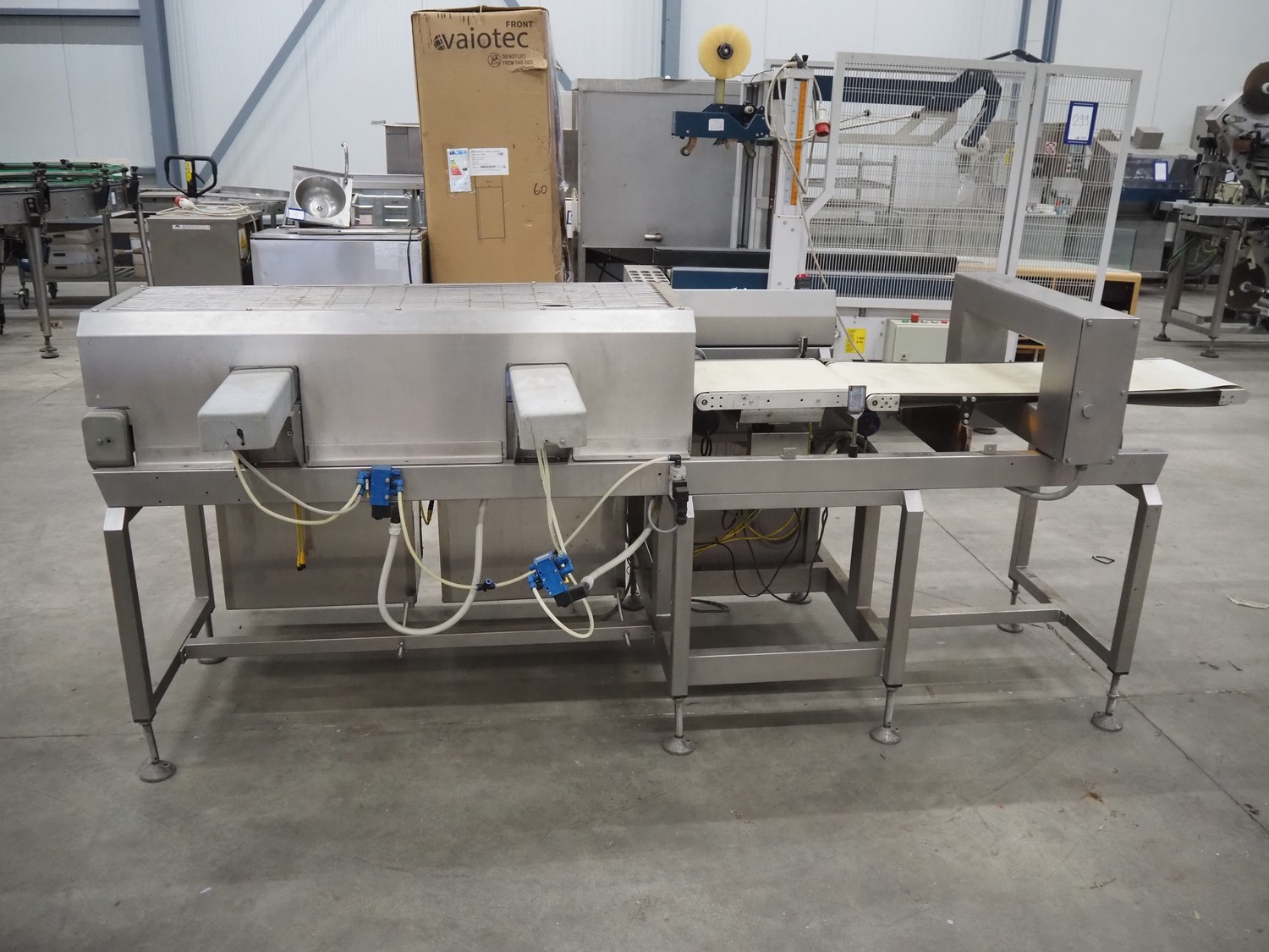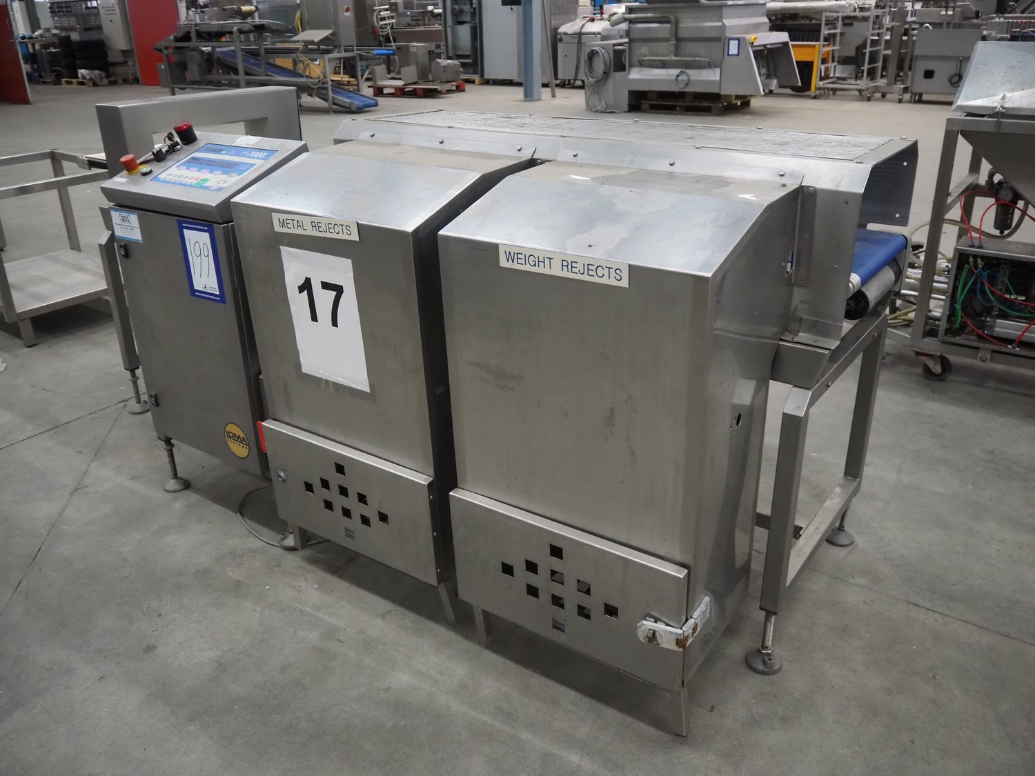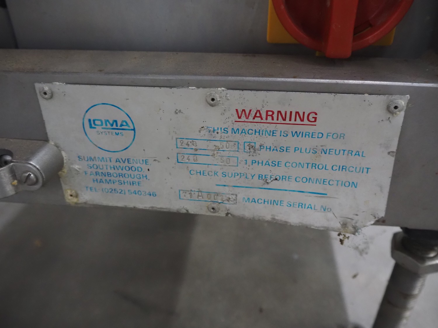 Loma systems checkweigher with metal detector and double rejector, serial number: 71A001, 240 V, 1 Ph, 50 Hz, plastic belt, belt width: 300 mm, clearance: 450 mm x 130 mm, total dimensions: 2750 mm x 1000 mm x 1050 mm.