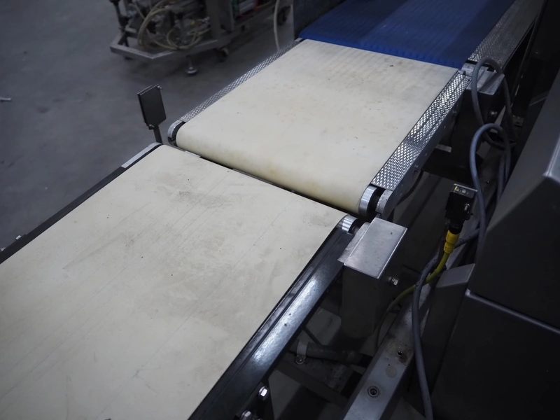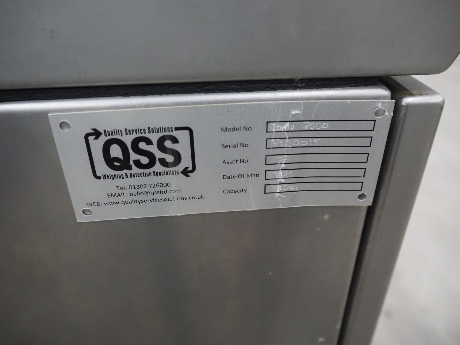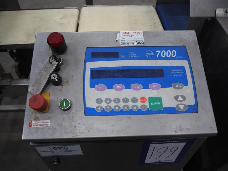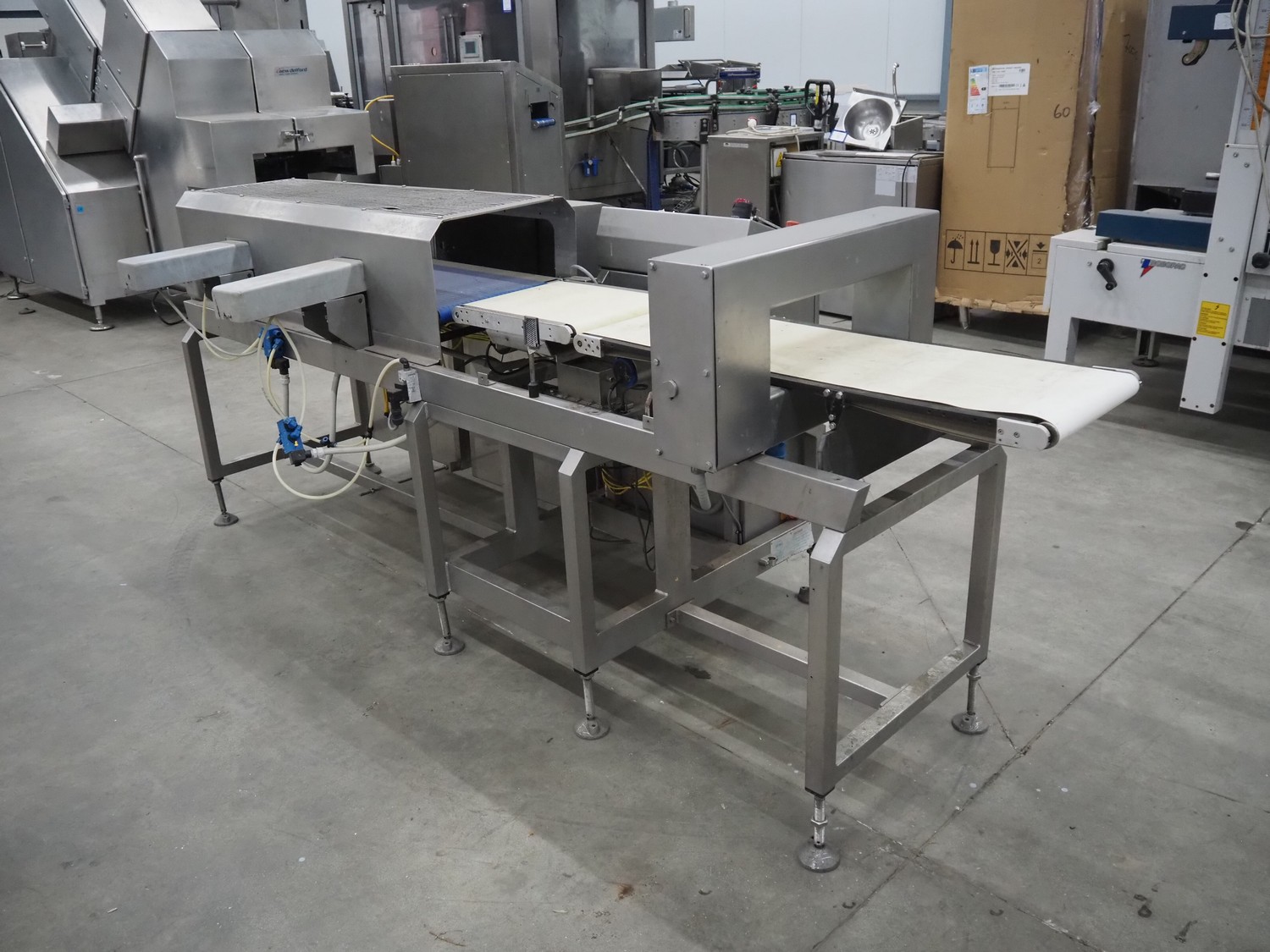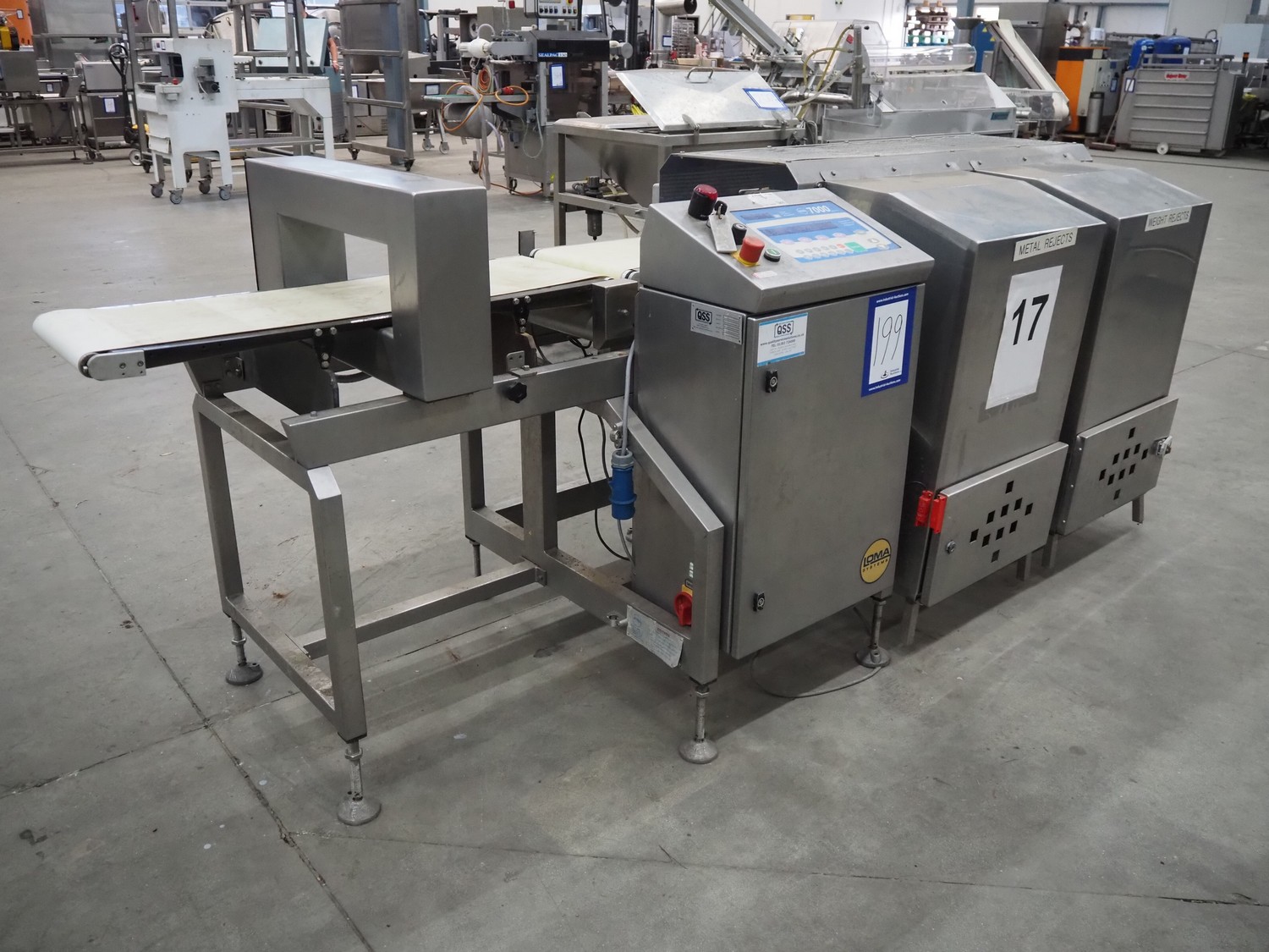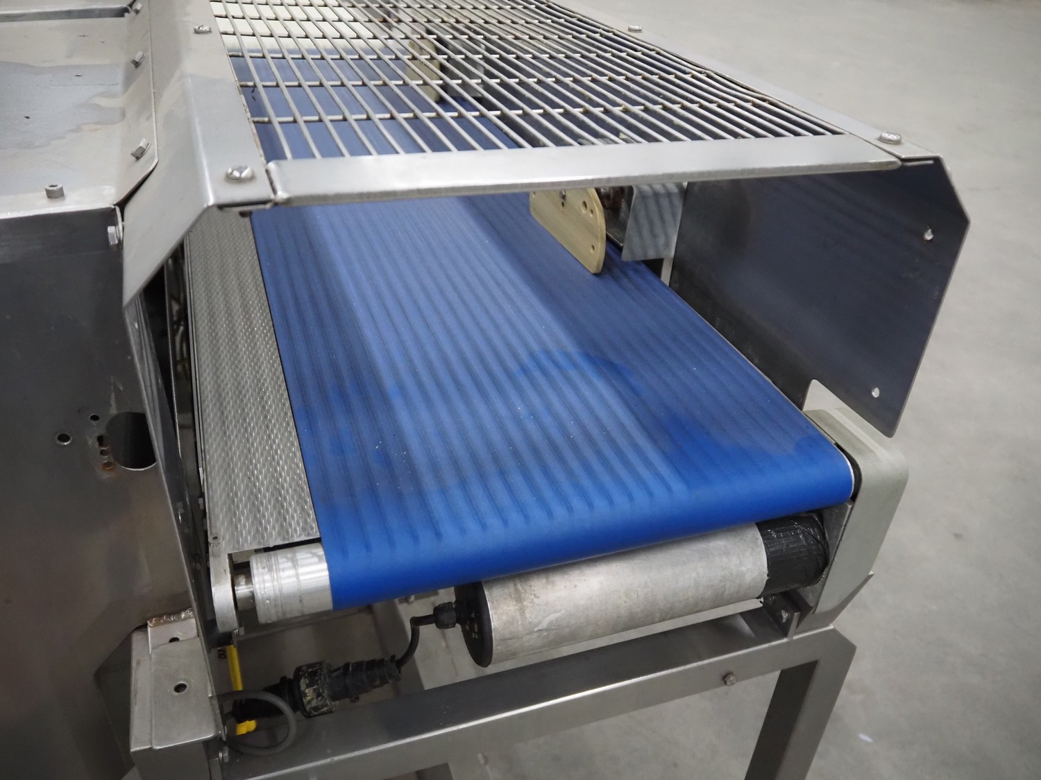 Loma systems checkweigher with metal detector and double rejector, serial number: 71A001, 240 V, 1 Ph, 50 Hz, plastic belt, belt width: 300 mm, clearance: 450 mm x 130 mm, total dimensions: 2750 mm x 1000 mm x 1050 mm.