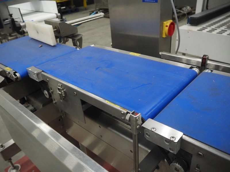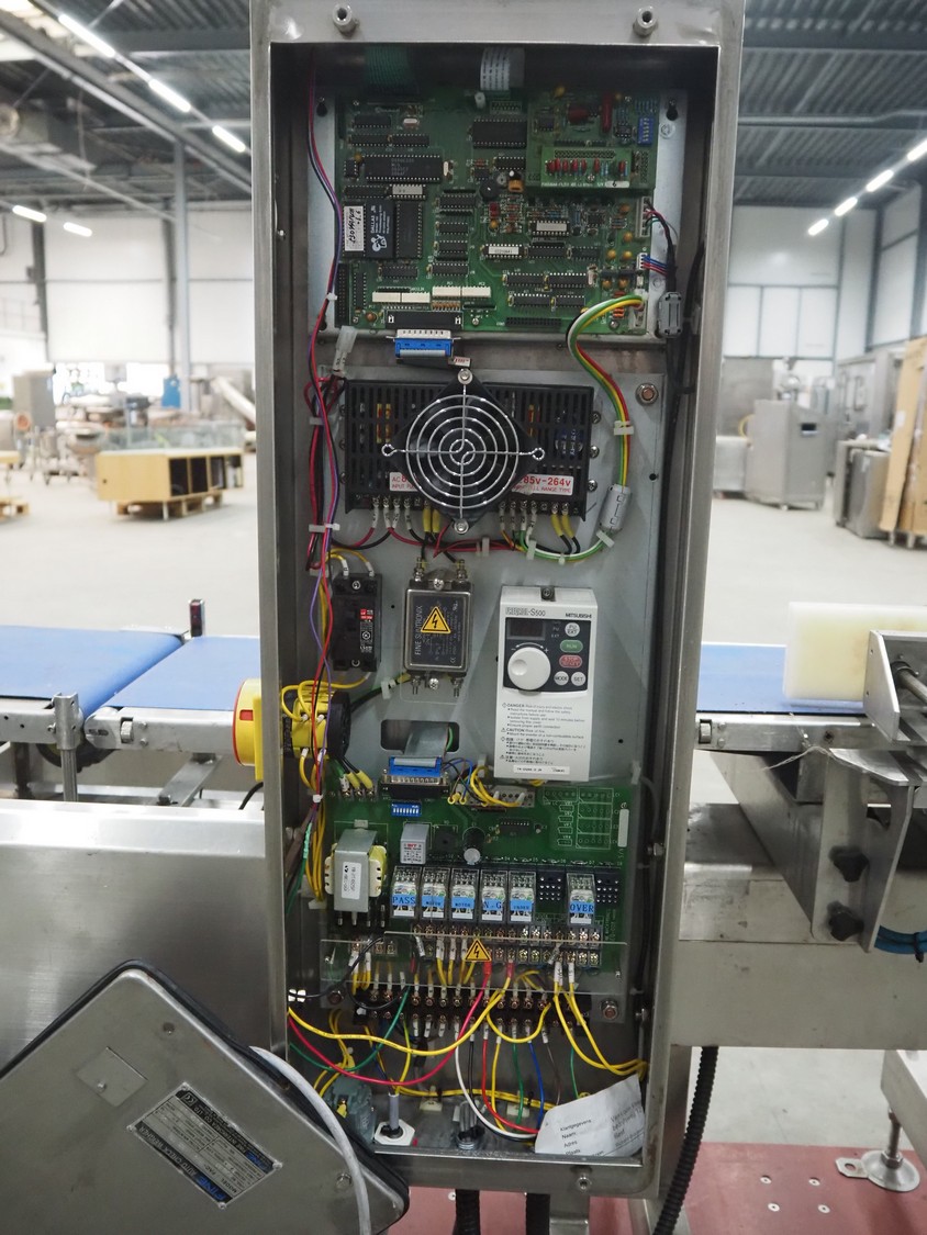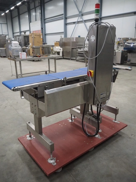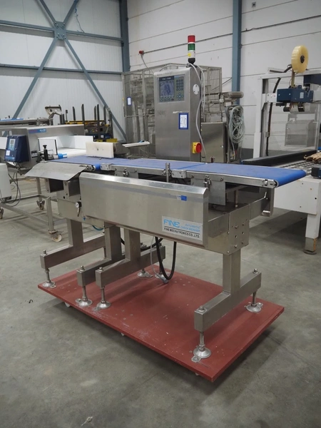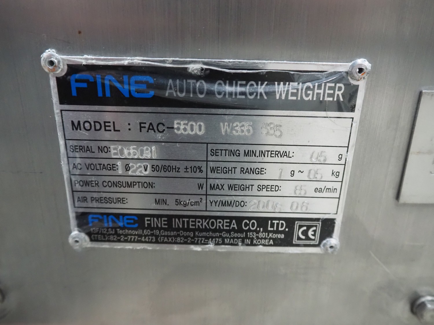 Fine Interkorea checkweigher with rejecter, model: FAC-5500 W335 535, serial number: E065031, year of construction: 2006/06, weight range: 1-500 gram, plastic belt, belt width: 300 mm, total dimensions: 1670 mm x 900 mm x 1630 mm.