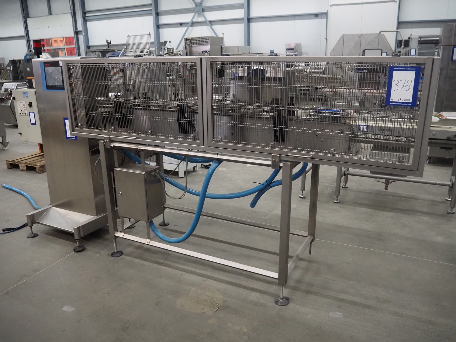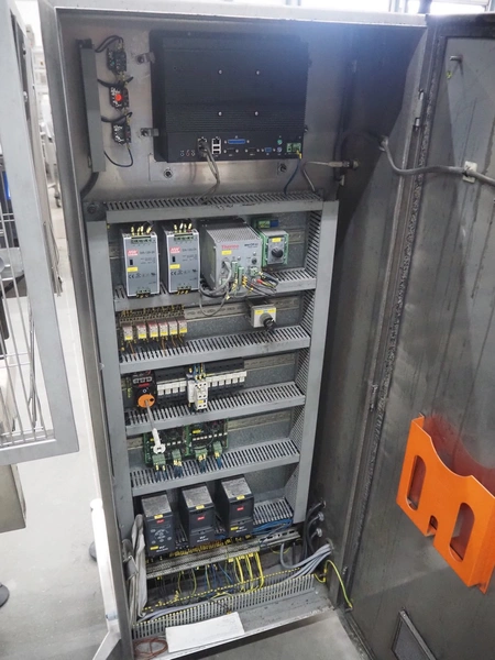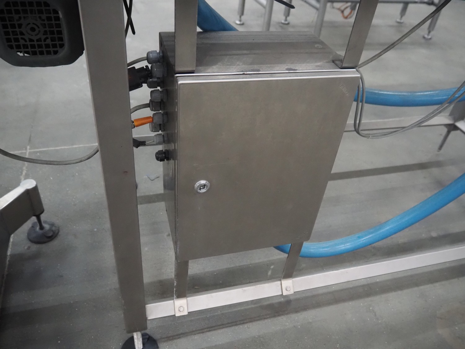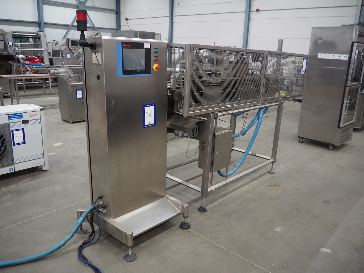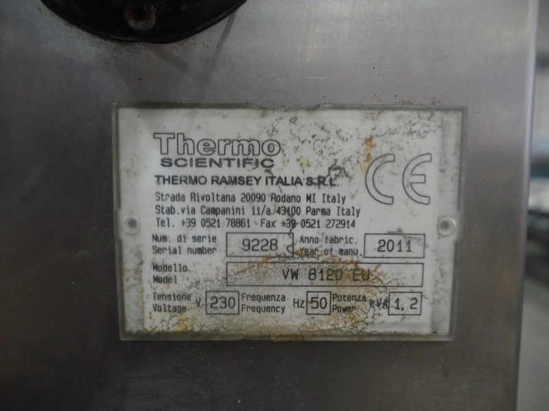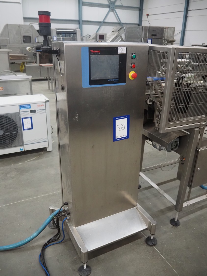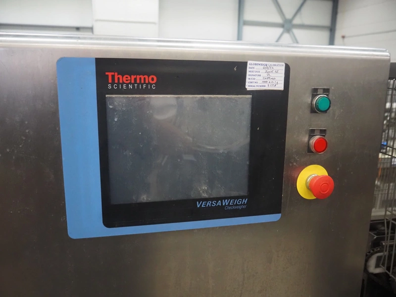 Thermo Scientific checkweigher for cans with s/s switch cabinet, model: VW 8120 EU, serial number: 9228, year of construction: 2011, 230 V, 50 Hz, 1.2 KVA, chain belt, clearance: 95 mm, dimensions checkweigher: 4350 mm x 750 mm x 1620 mm, dimensions switch cabinet: 800 mm x720 mm x 1810 mm.