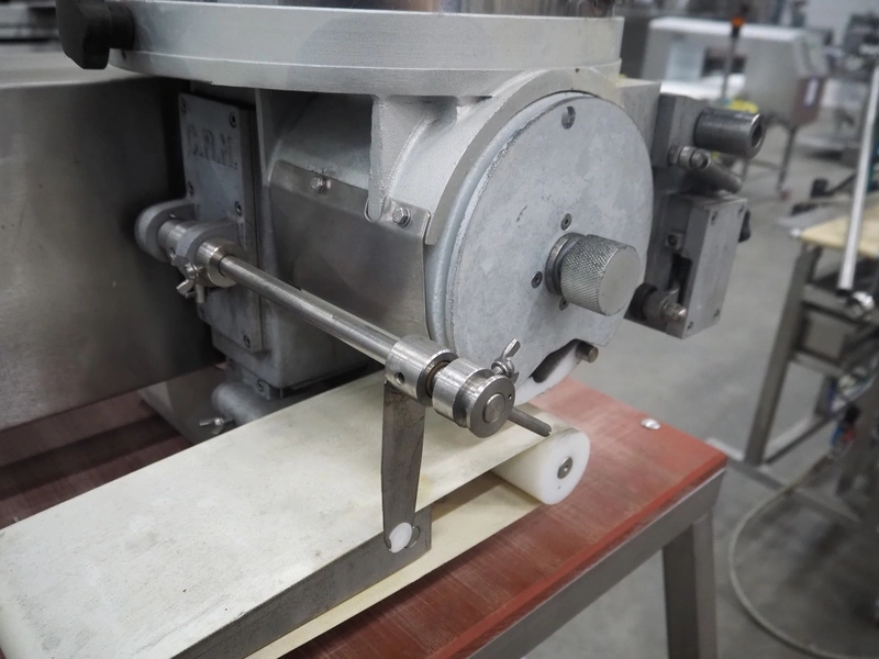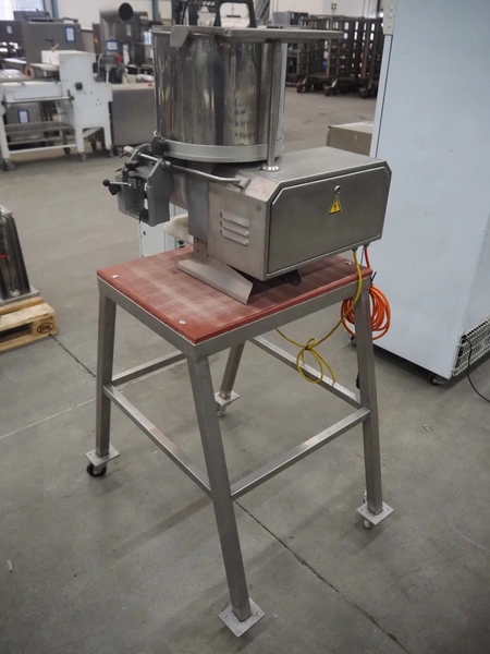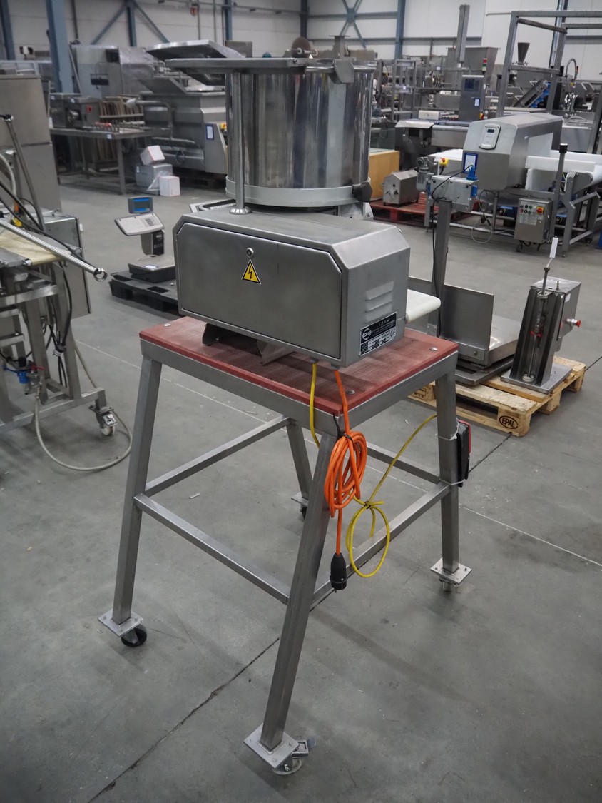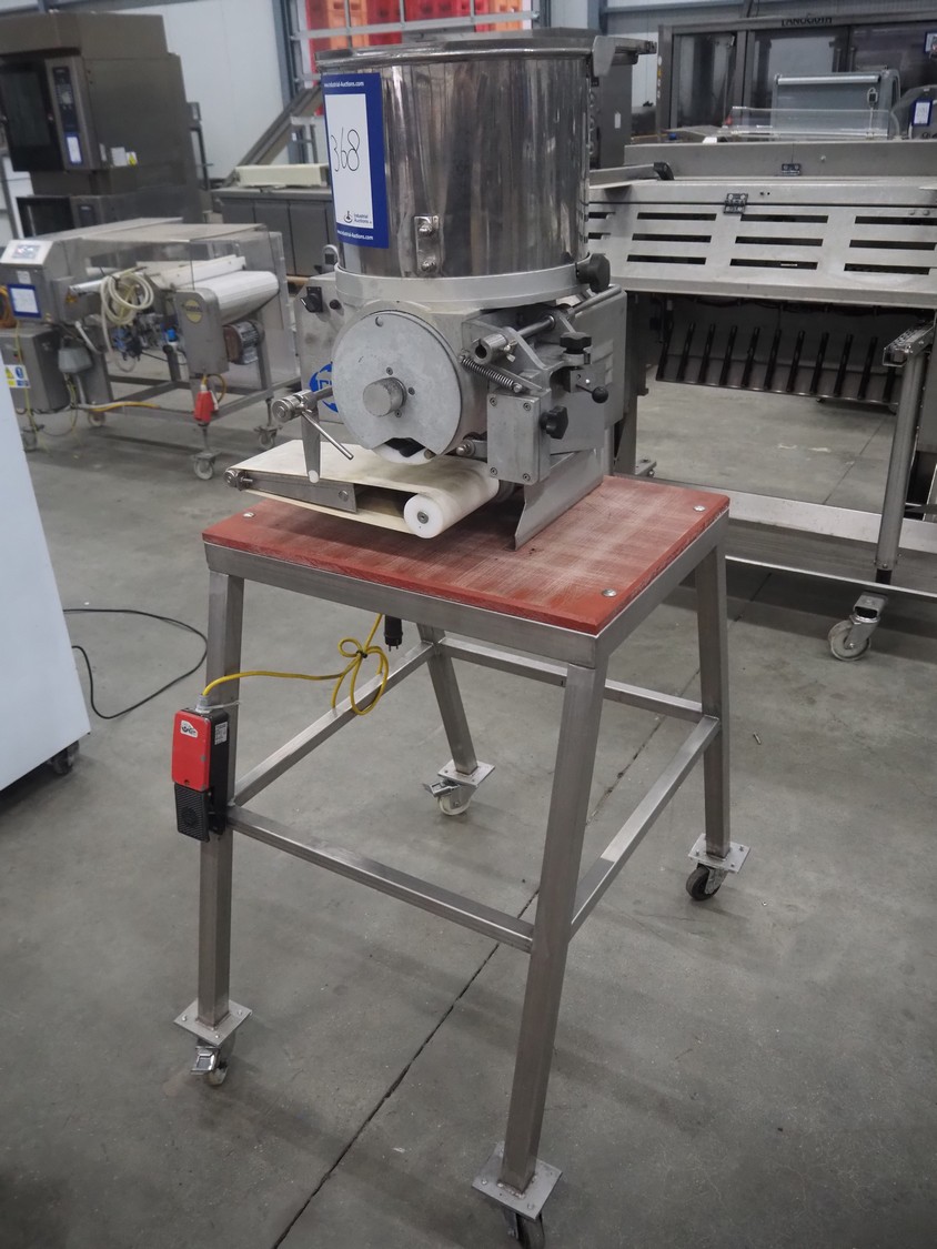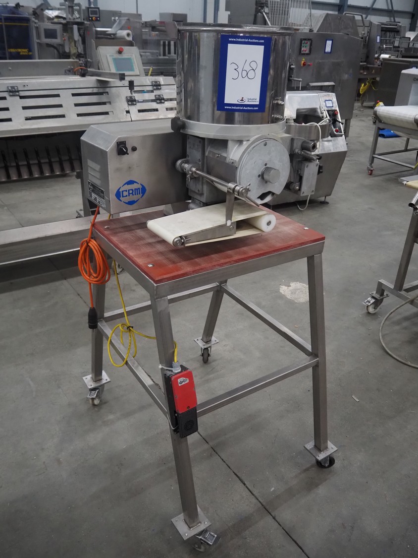 C.R.M. srl mobile hamburger forming machine on s/s trolley with plastic top, machine type: PLANUS H 200/94, serial number: 260, year of construction: 06-1997, 230 V, 0.37 kW, diameter form: 100 mm, belt width: 150 mm, total dimensions: 970 mm x 740 mm x 1630 mm.