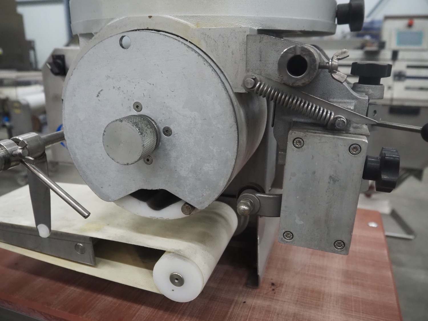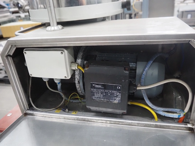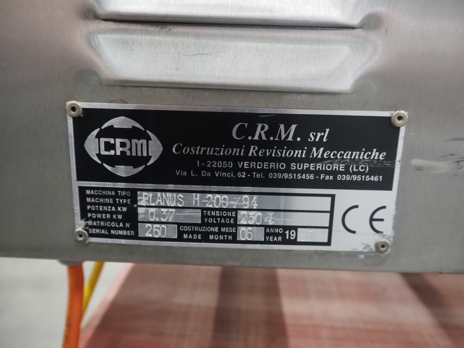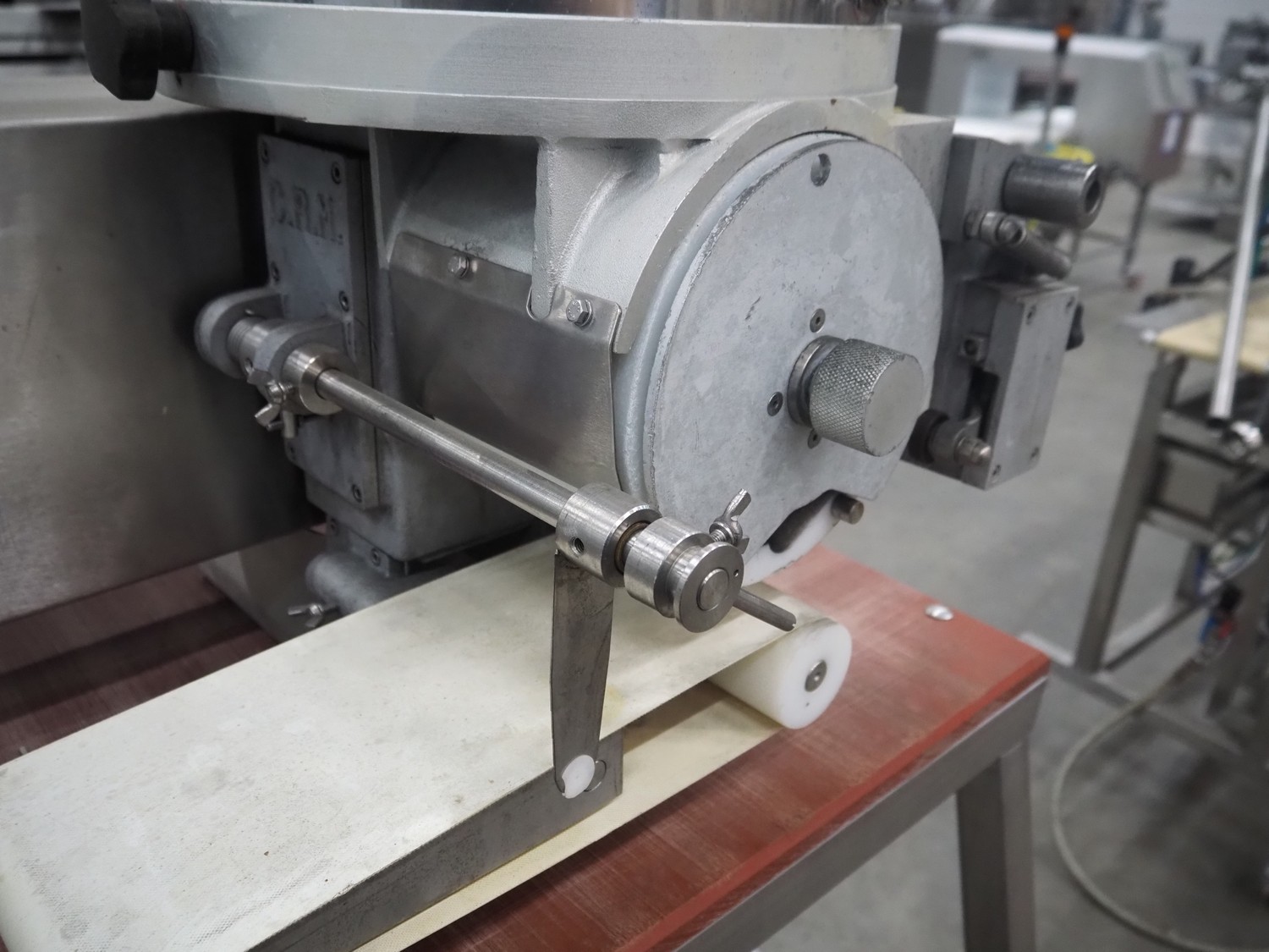 C.R.M. srl mobile hamburger forming machine on s/s trolley with plastic top, machine type: PLANUS H 200/94, serial number: 260, year of construction: 06-1997, 230 V, 0.37 kW, diameter form: 100 mm, belt width: 150 mm, total dimensions: 970 mm x 740 mm x 1630 mm.