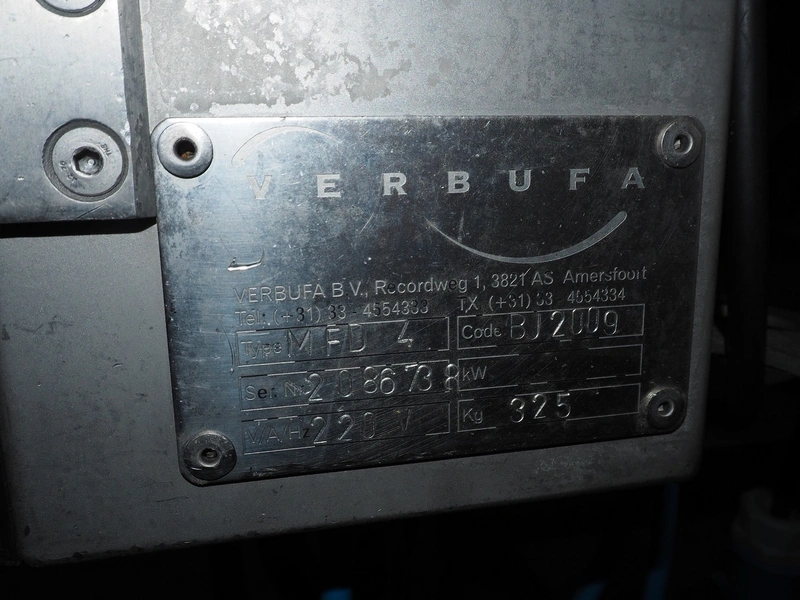 Verbufa mobile waterwheel, type: MFD 4, serial number: 2086738, year of construction: 2009, 220 V, weight: 325 kg, 4 heads, head dimensions: (4x) 75 mm x 60 mm, total dimensions: 800 mm x 1200 mm x 1800 mm.
