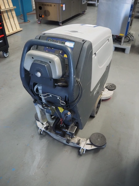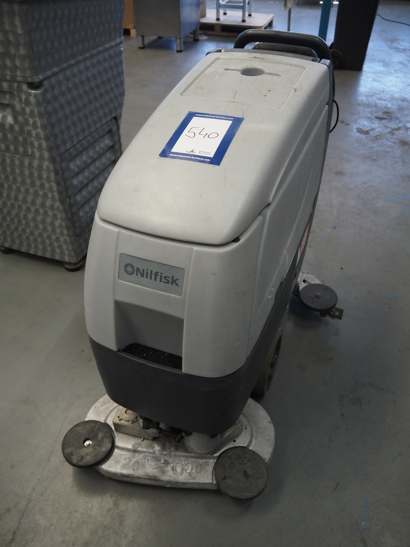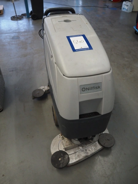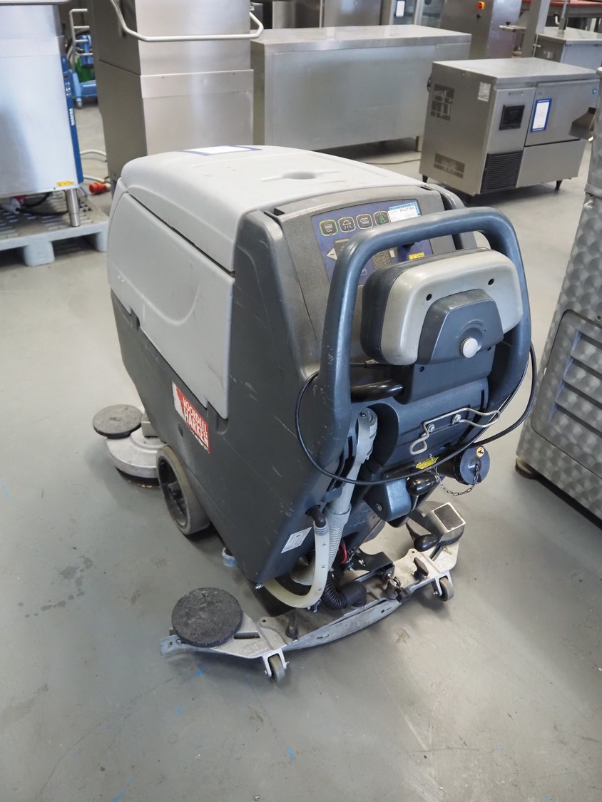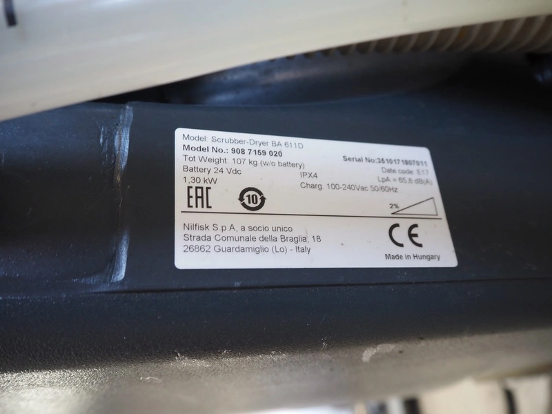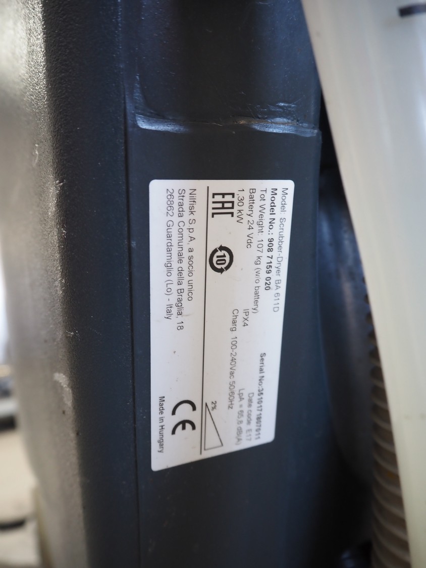 Nilfisk floor scrubber, model: Scrubber-Dryer BA 611D, serial number: 3510171807011, 100-240 V, 50/60 Hz, weight: 107 kg, dimensions: 1300 mm x 700 mm x 1100 mm.