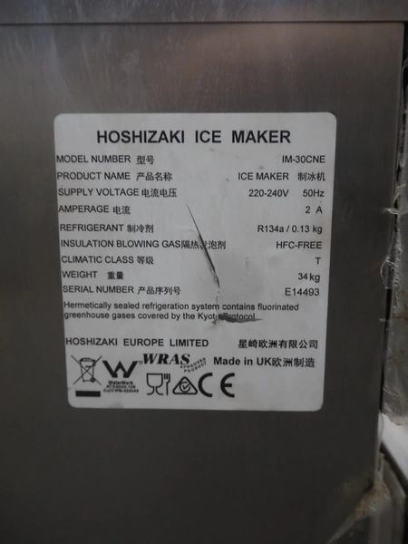 Hoshizaki ice machine, model: IM-30CNE, serial number: E14493, 220-240 V, 50 Hz, 2 A, refrigerant: R134a, 0.13 kg, dimensions: 400 mm x 400 mm x 700 mm.