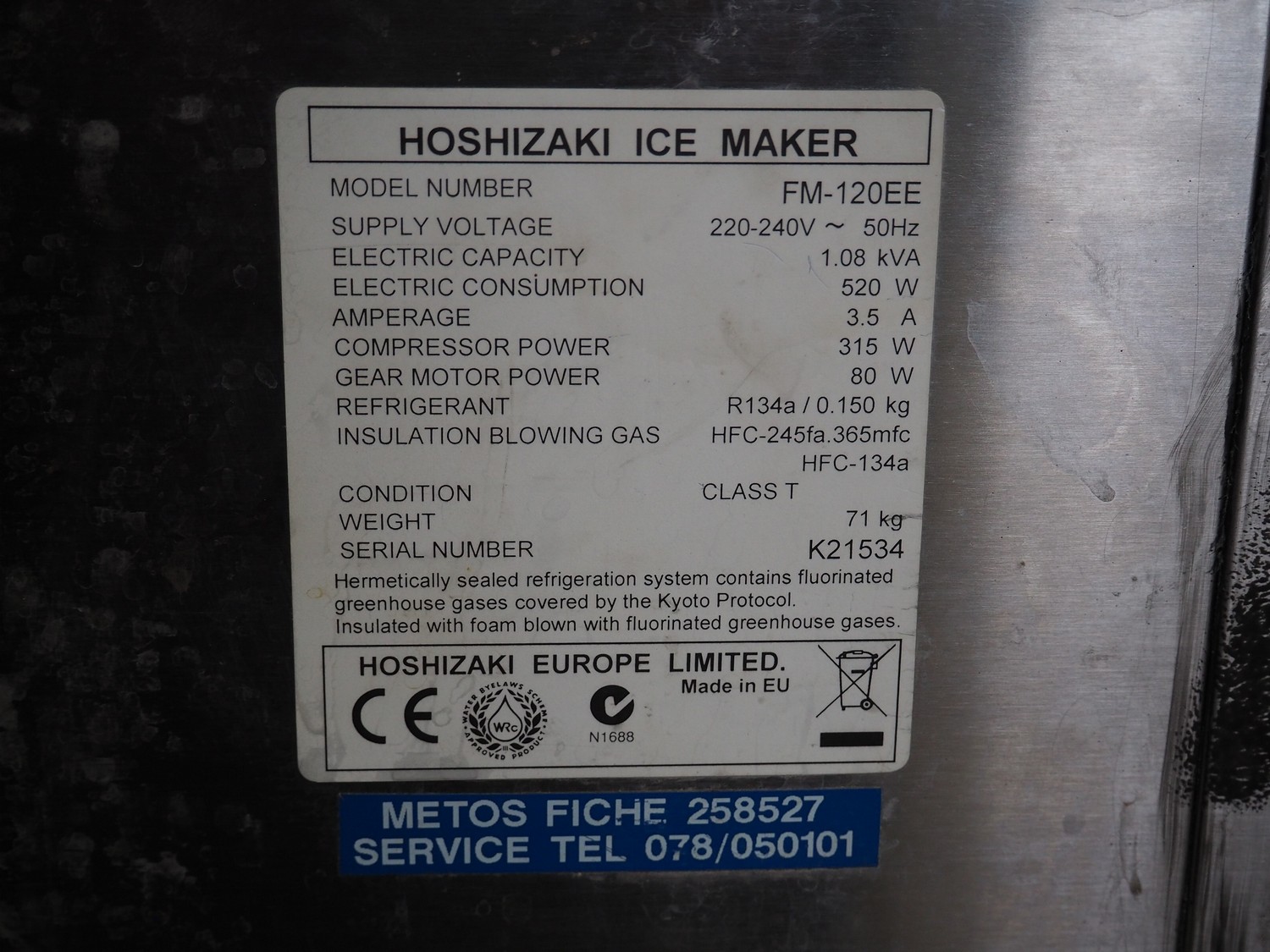 Hoshizaki ice machine, model: FM-12EE, serial number: K21534, 220/240 V, 50 Hz, 3.5 A, weight: 71 kg, refrigerant: R134a, 0.150 kg, dimensions: 650 mm x 650 mm x 800 mm.