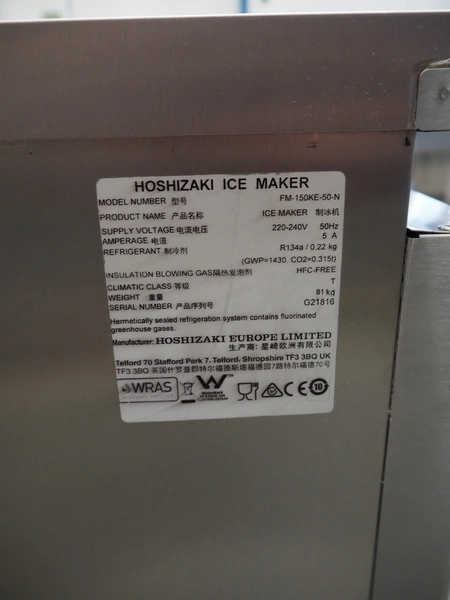 Hoshizaki ice machine, model: FM-150KE-50-N, serial number: G21816, 220-240 V, 50 Hz, 5 A, weight: 81 kg, refrigerant: R134a, dimensions: 940 mm x 620 mm x 800 mm.