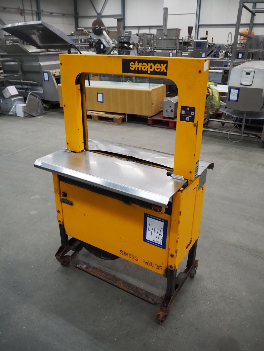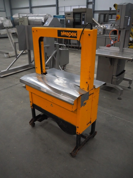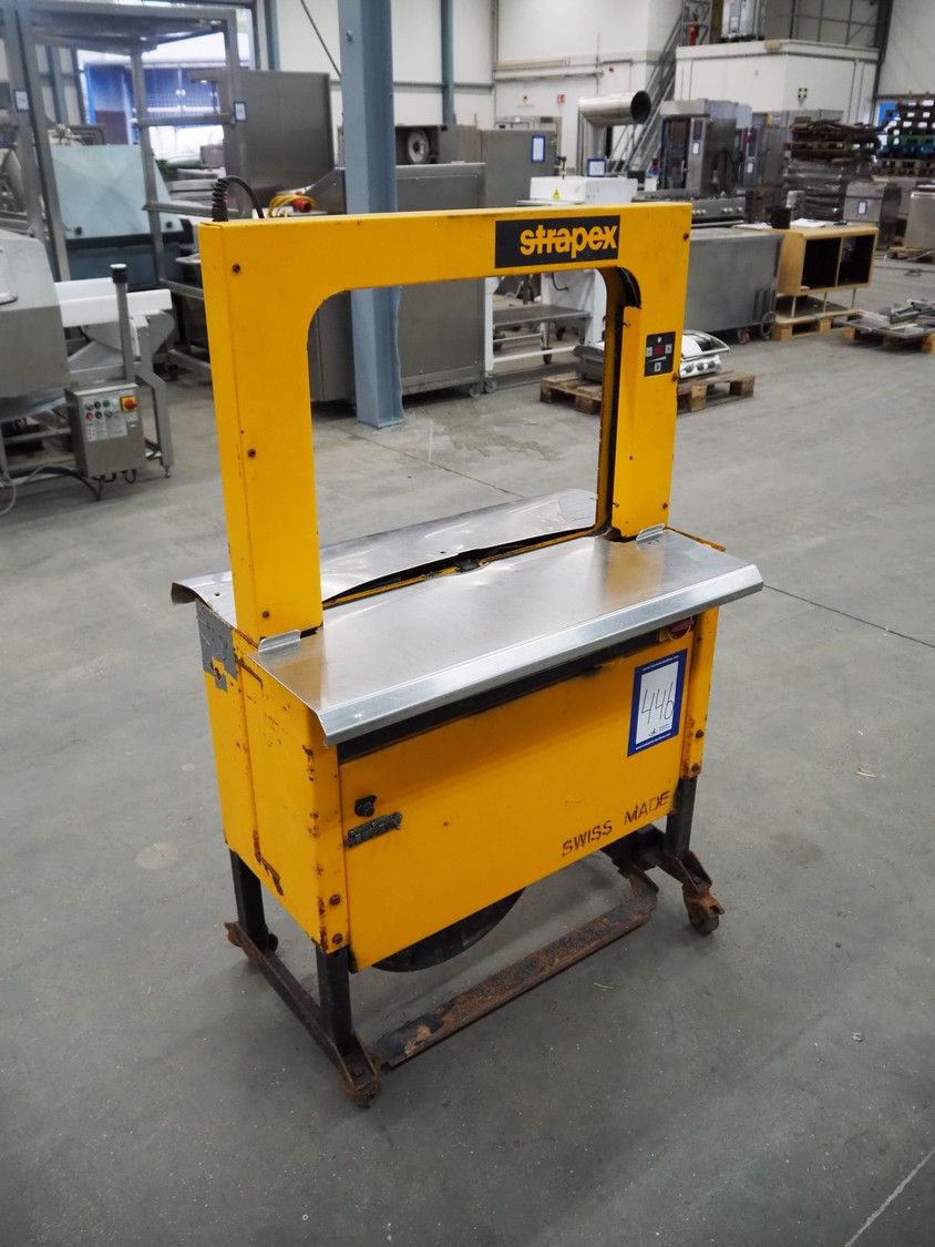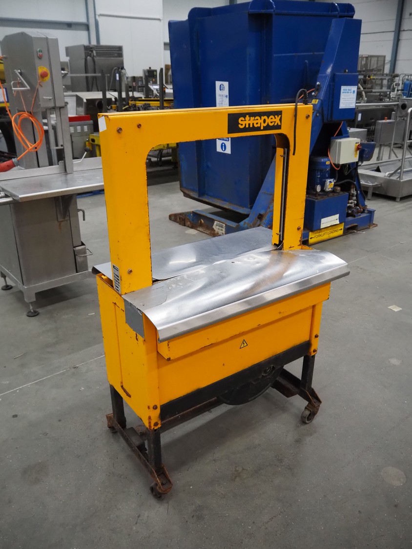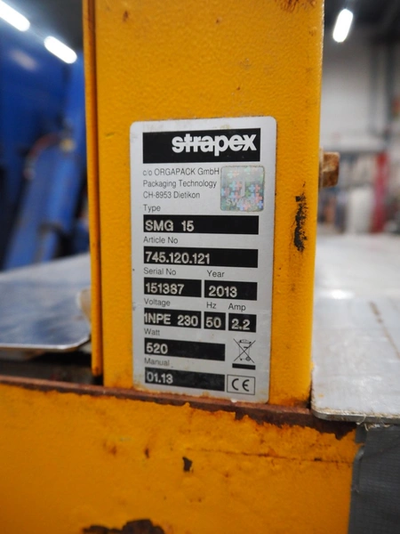 Strapex mobile strapping machine, type: SMG 15, serial number: 151387, year of construction: 2013, 230 V, 1 Ph, 50 Hz, 2.2 A, 520 Watt, clearance: 650 mm x 500 mm, total dimensions: 900 mm x 600 mm x 1450 mm.