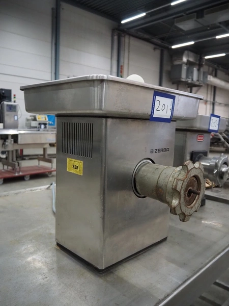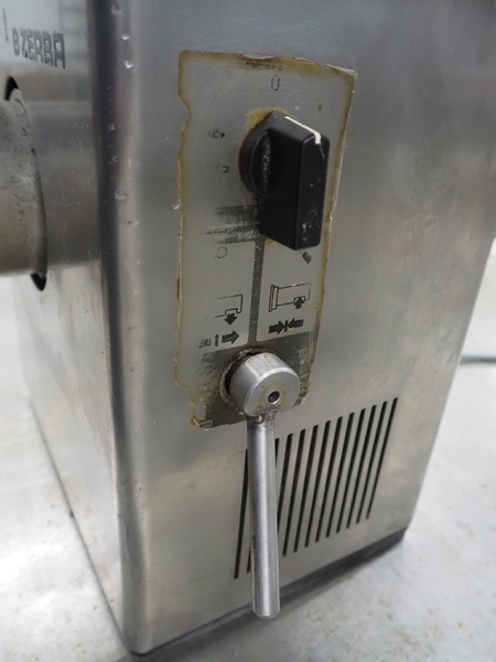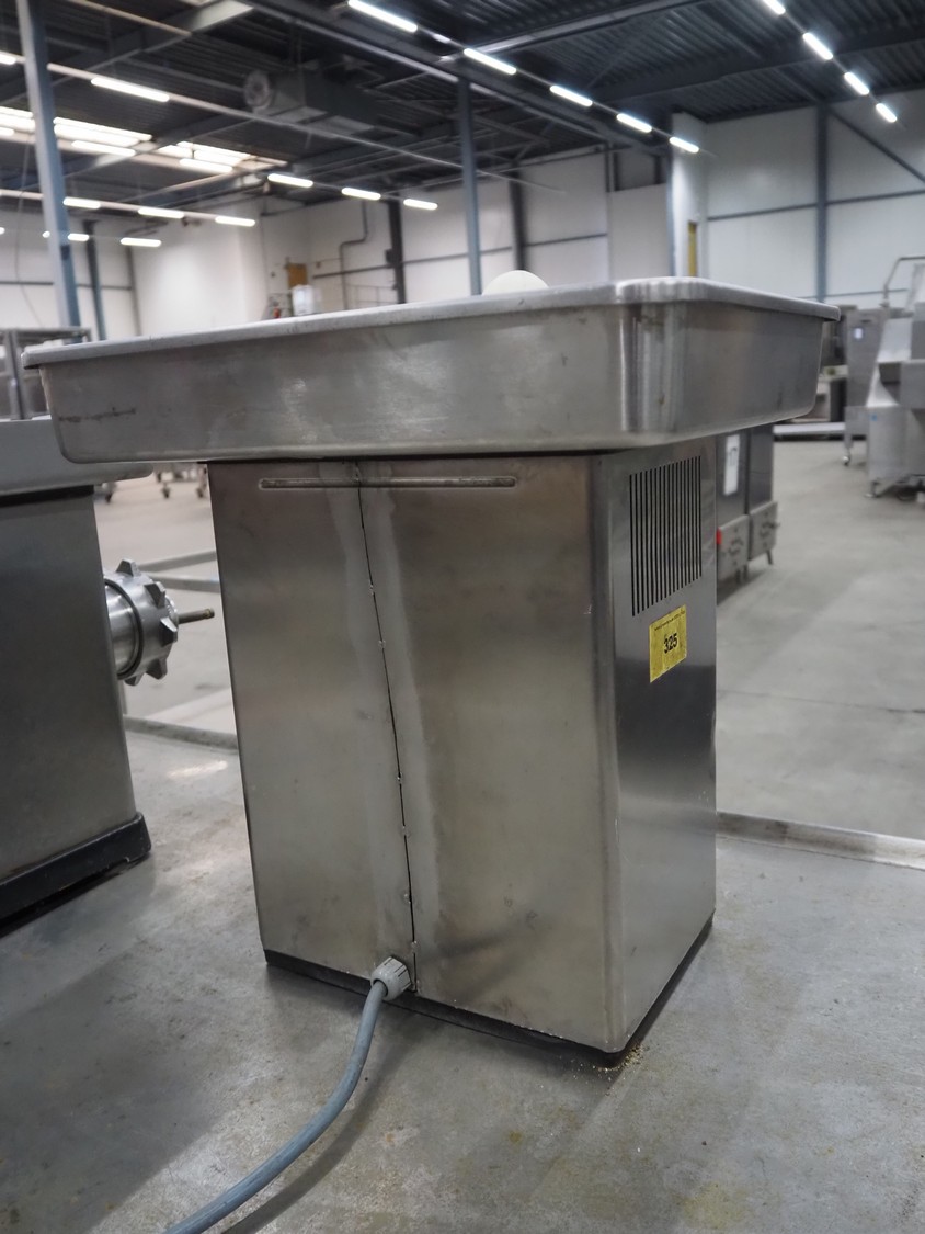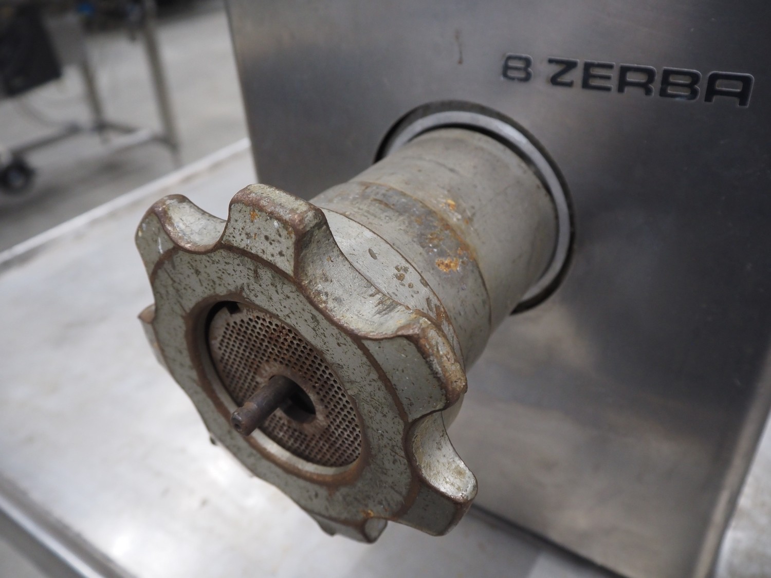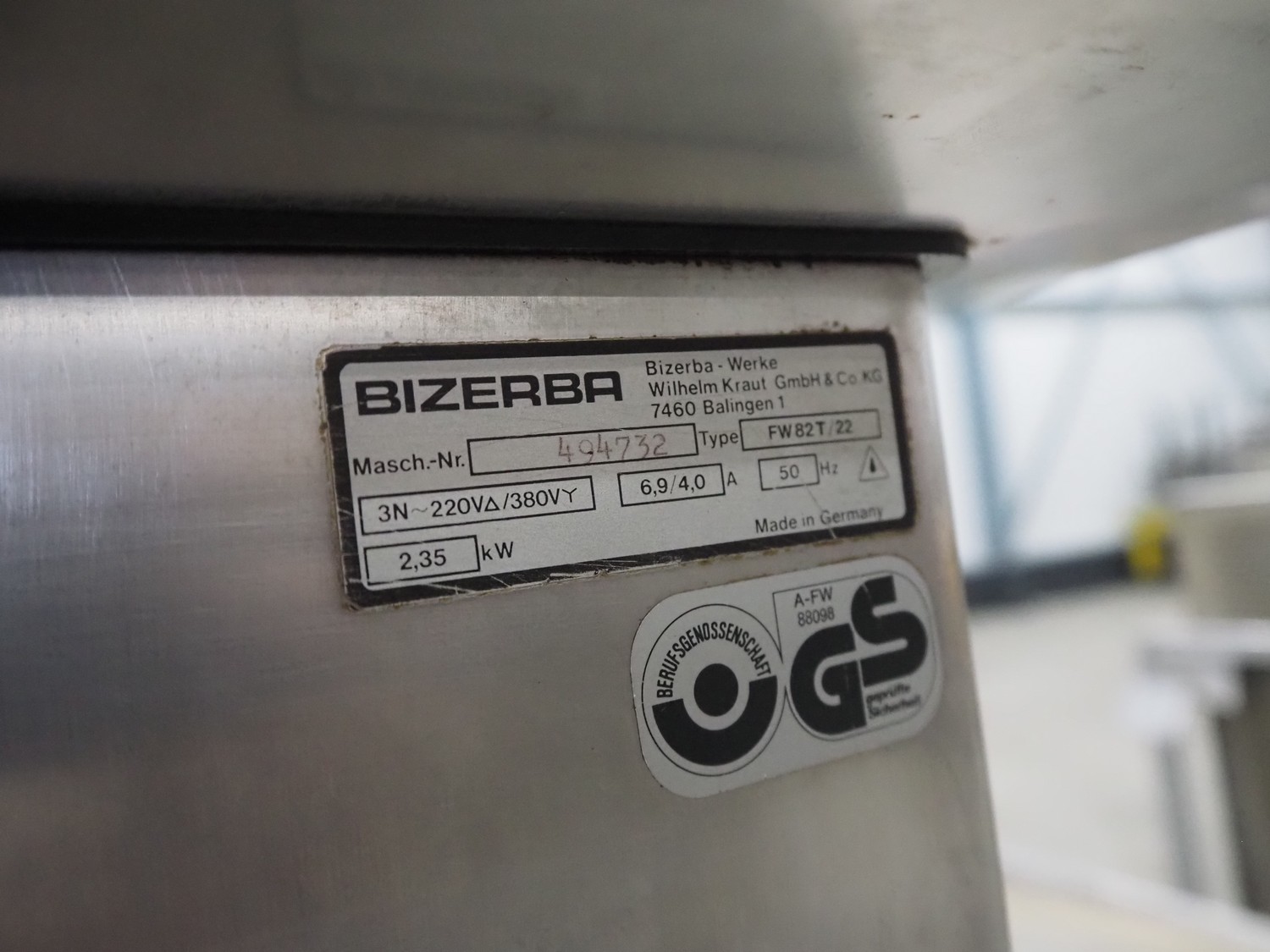 Bizerba grinder, type: FW 82 T/22, machine number: 494732, 220/380 V, 3 Ph, 50 Hz, 6.9/4.0 A, 2.35 kW, plate diameter: 82 mm, total dimensions: 640 mm x 450 mm x 840 mm.